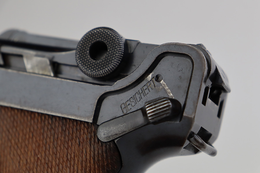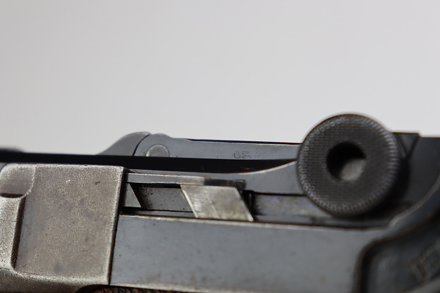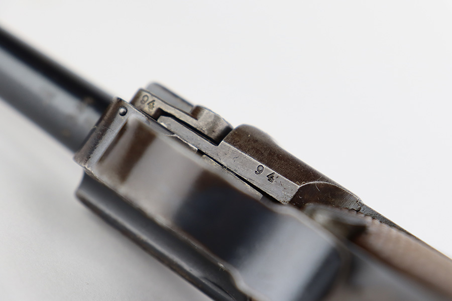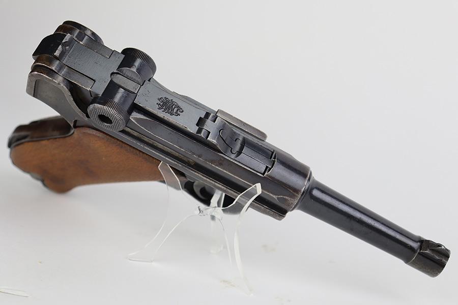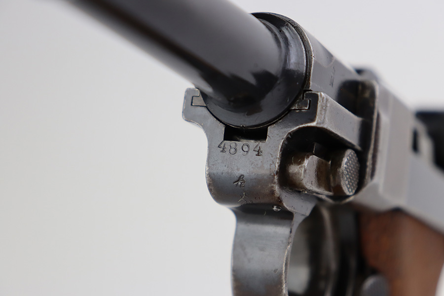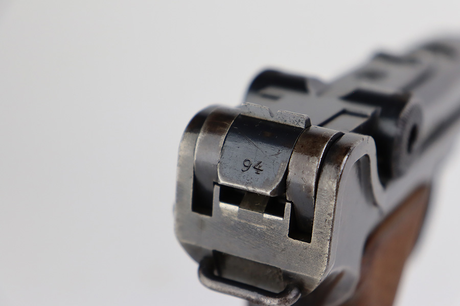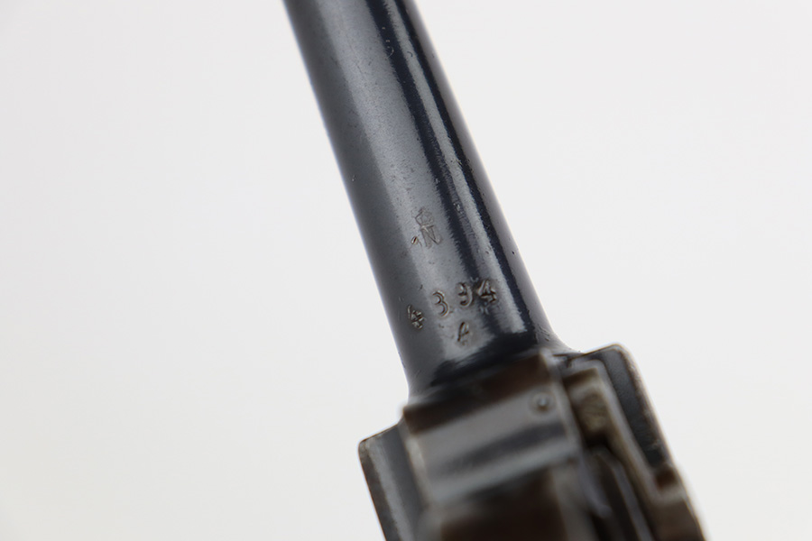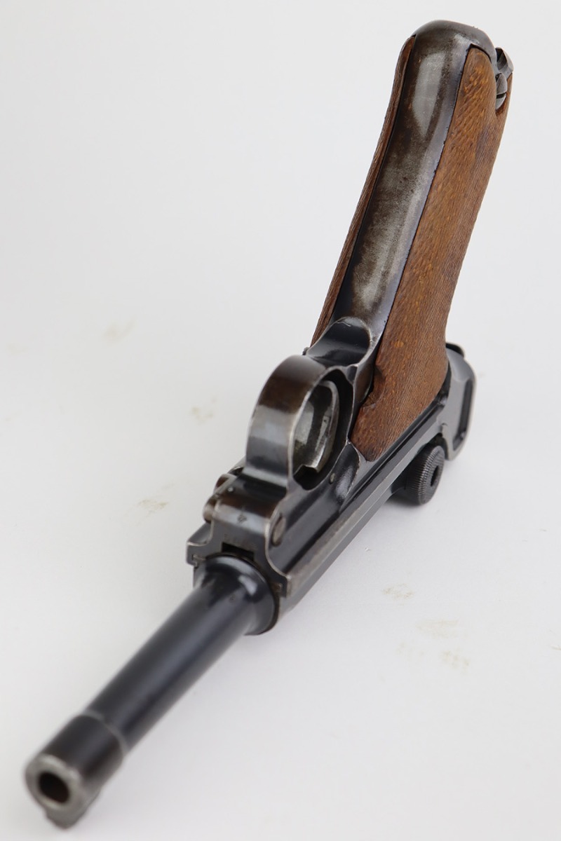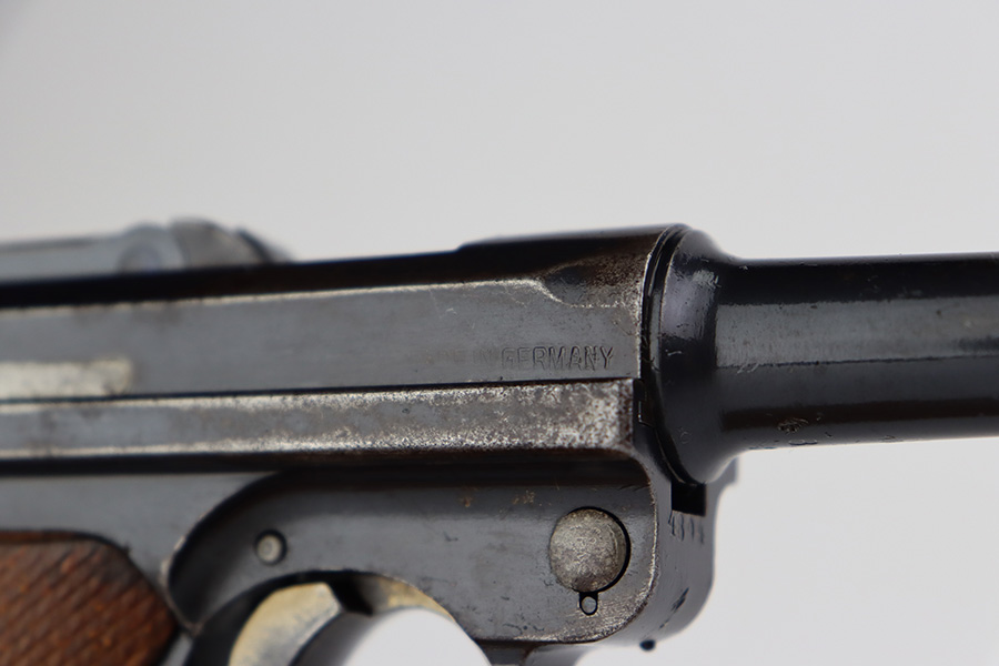 7/10/23 – This is a nice example of a DWM Luger sold in the commercial market in the 1920’s. Chambered in .30 Luger. It is all matching, has no chamber date, and has the proper “Crown N” commercial proofs. It has retained roughly 70% of its finish. There is wear throughout, concentrated on both grip straps, on the side plate, on the side rails, and around the muzzle. Some areas of tiny pitting and oxidation here and there. Fitted with excellent un-numbered wood grips. Comes with a period-correct magazine tube with a replaced bottom. The condition of the bore is poor – worn rifling with minor pitting throughout.