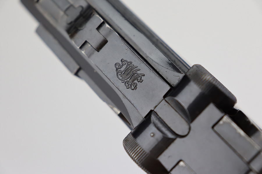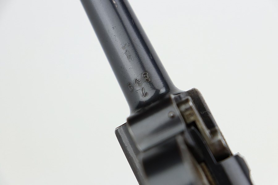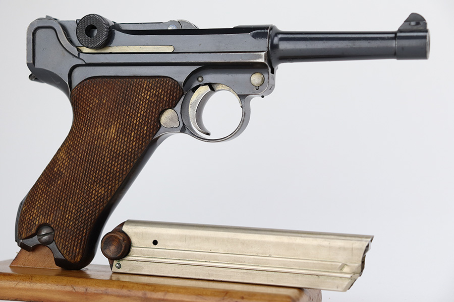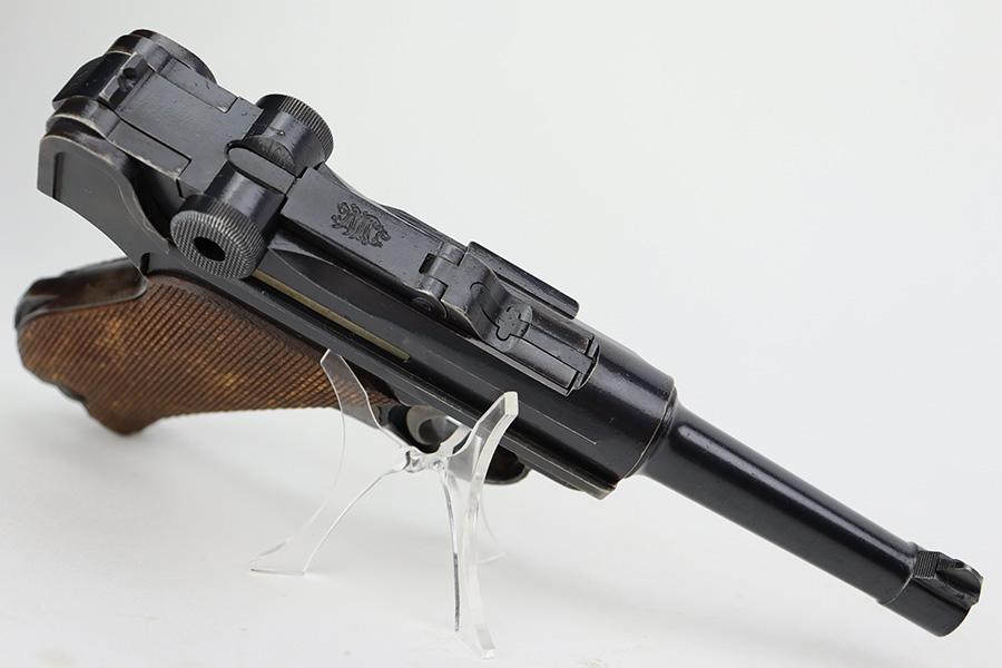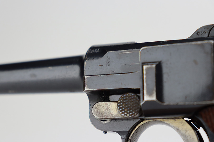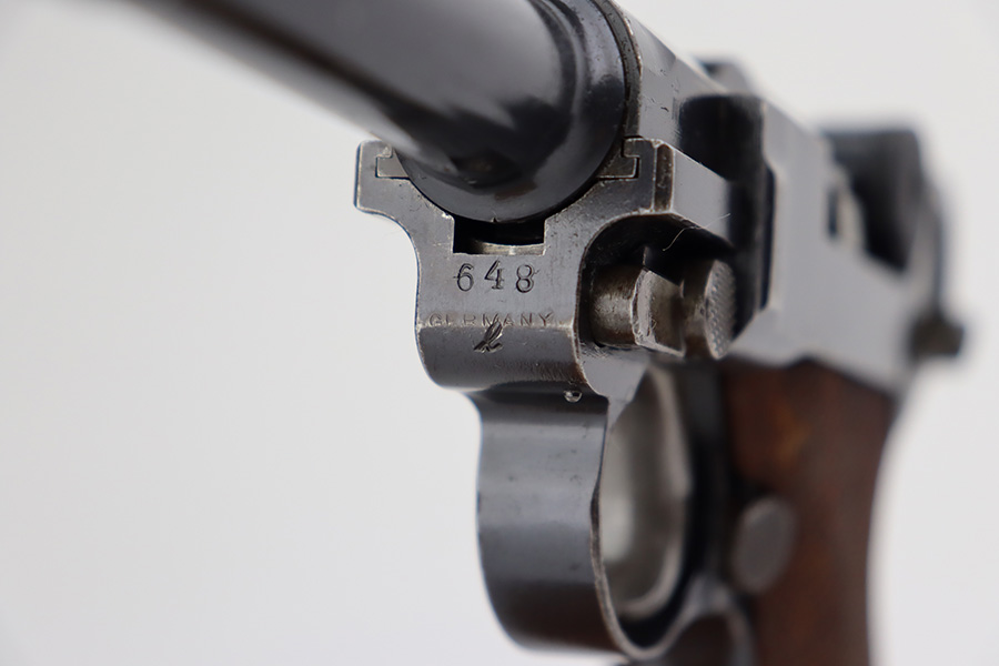 8/1/23 – This is a very nice example of a DWM Luger sold in the commercial market in the 1920’s. Chambered in .30 Luger. It is all matching, has no chamber date, and has the proper “Crown N” commercial proofs. It has retained about 92-93% of its original finish. There is very minor wear around the high edges, but most of the finish loss comes in the form of spotty wear on the grip straps. Fitted with very nice un-numbered wood grips. Comes with a “Germany” marked commercial magazine. Very nice bore with good rifling.