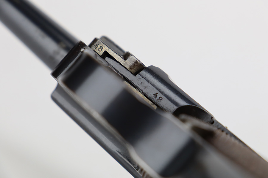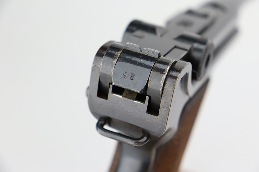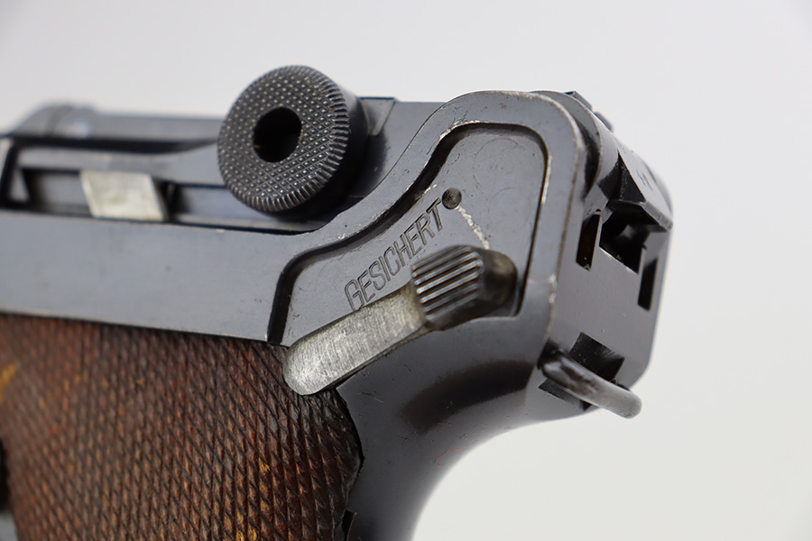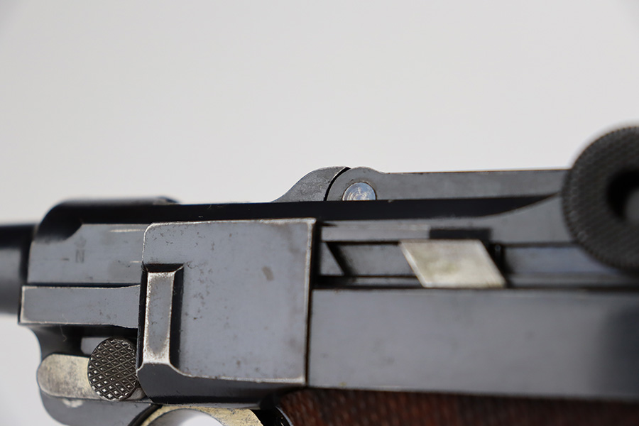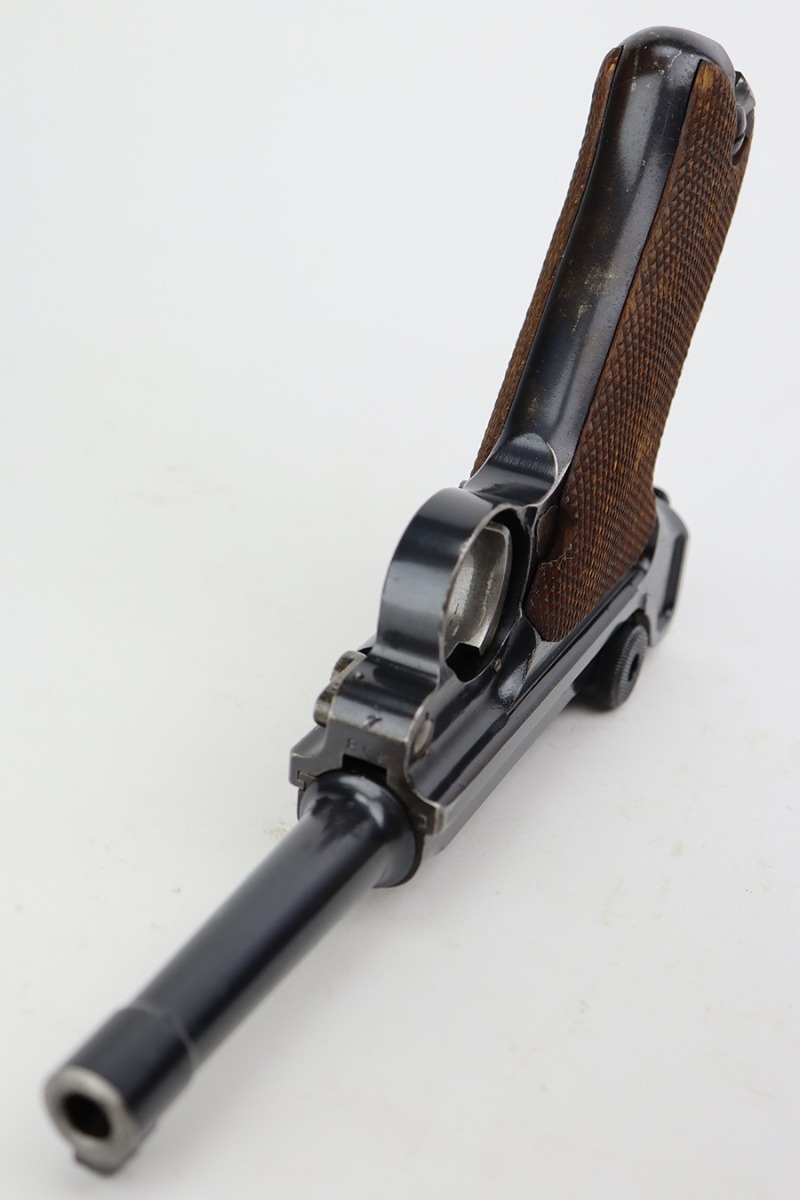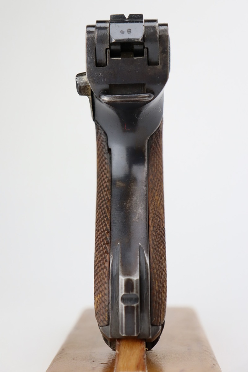 8/1/23 – This is a very nice example of a DWM Luger sold in the commercial market in the 1920’s. Chambered in .30 Luger. It is all matching, has no chamber date, and has the proper “Crown N” commercial proofs. It has retained about 92-93% of its original finish. There is very minor wear around the high edges, but most of the finish loss comes in the form of spotty wear on the grip straps. Fitted with very nice un-numbered wood grips. Comes with a “Germany” marked commercial magazine. Very nice bore with good rifling.