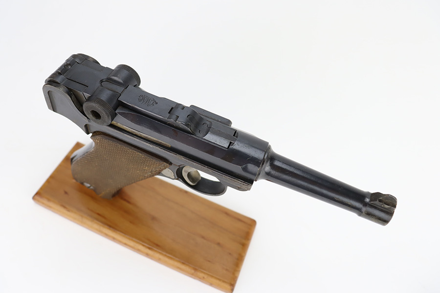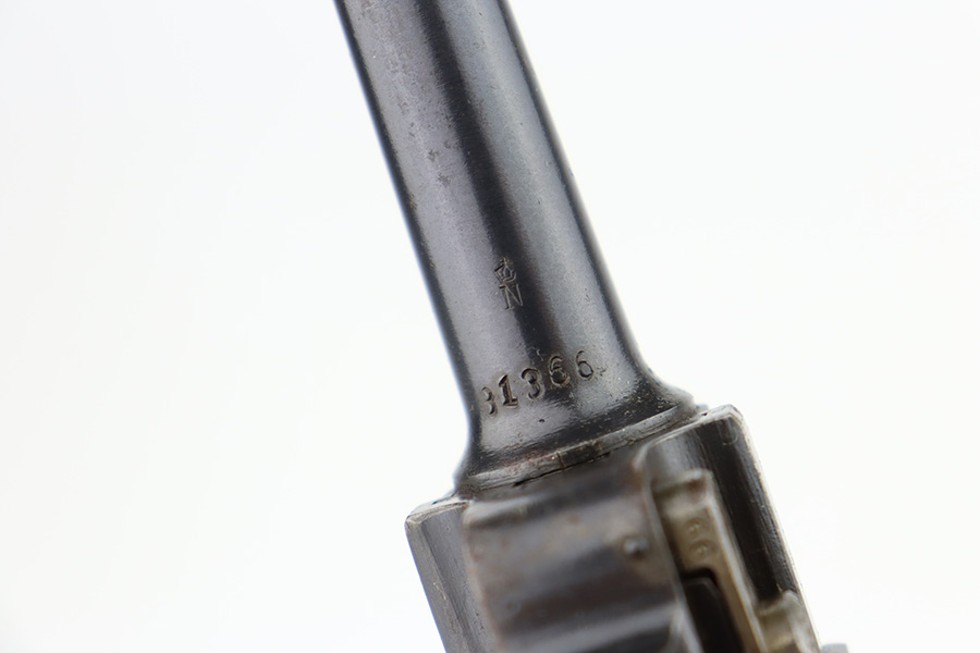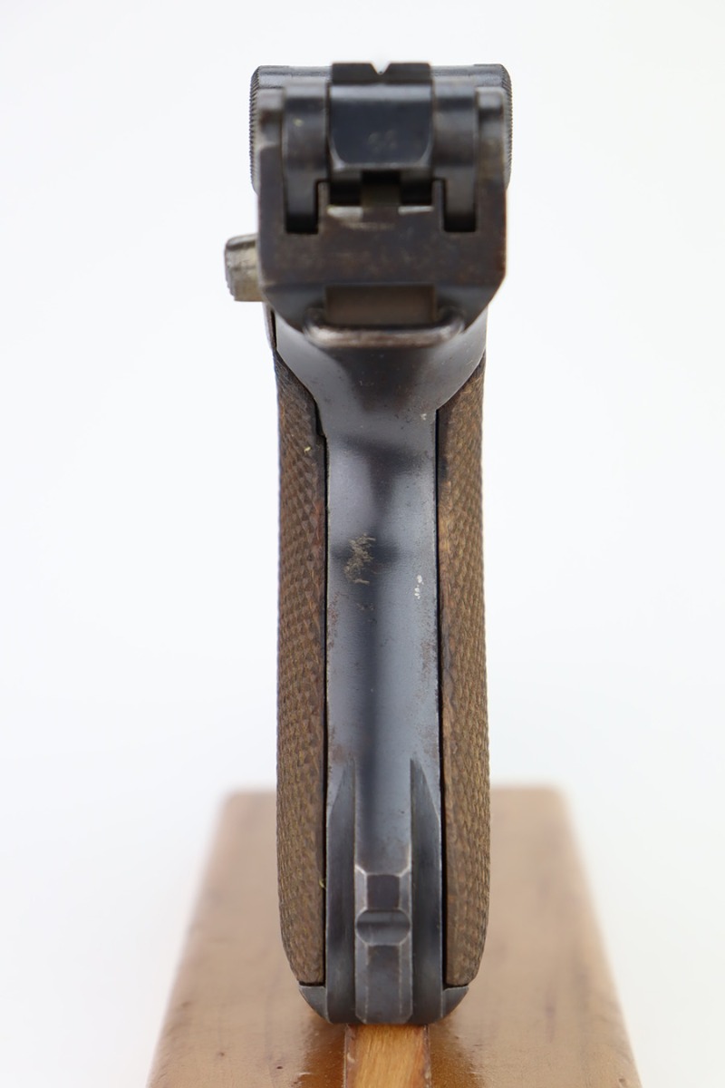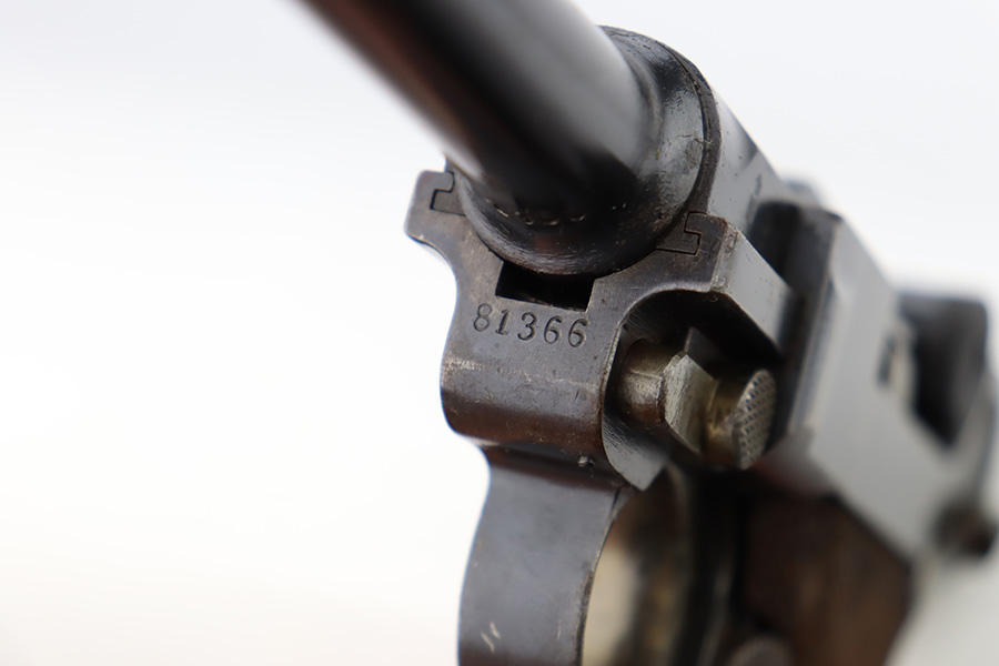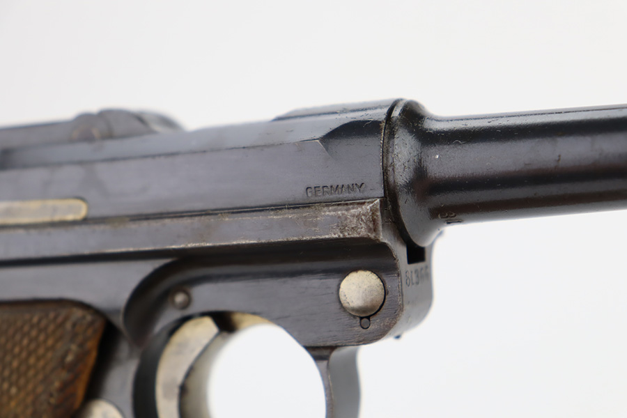 12/5/23 – This is a DWM Luger sold in the commercial market in the 1920’s. All matching and chambered in .30 Luger. The original finish rates about 93%. There is wear around the muzzle and general high edge wear. While there is not much actual finish loss, there are areas of spotty oxidation and discoloration here and there. Fitted with un-numbered wood grips and comes with an un-numbered magazine. Replaced grip screws. Minty bore.