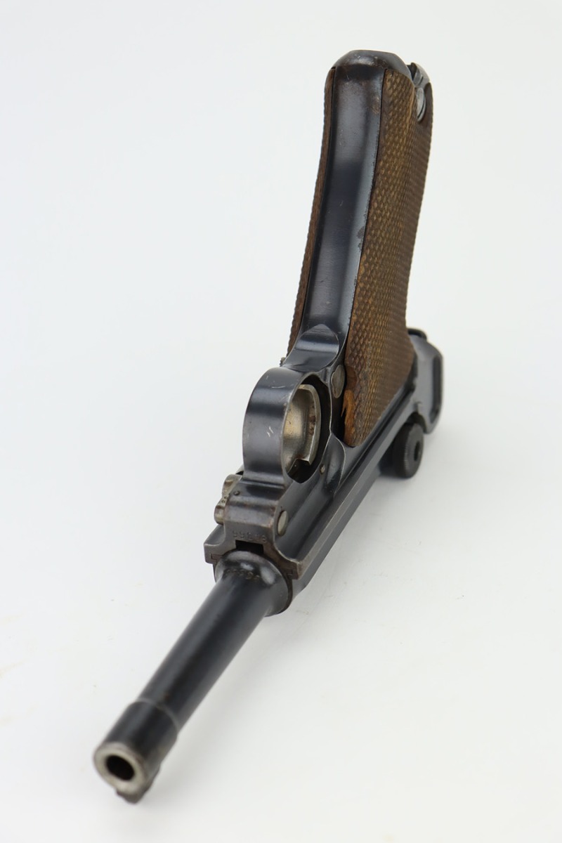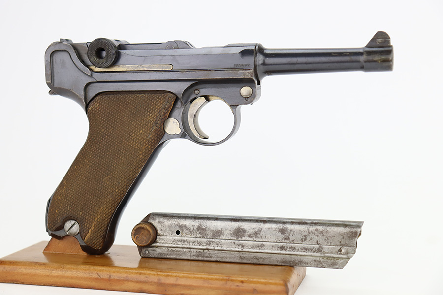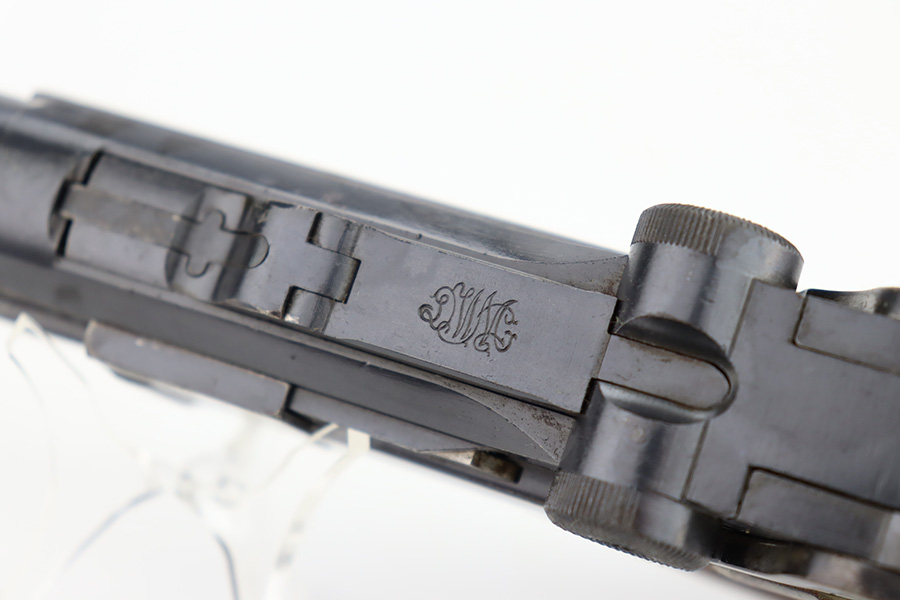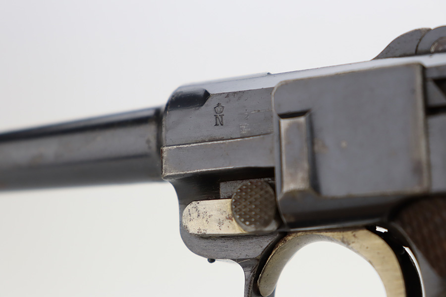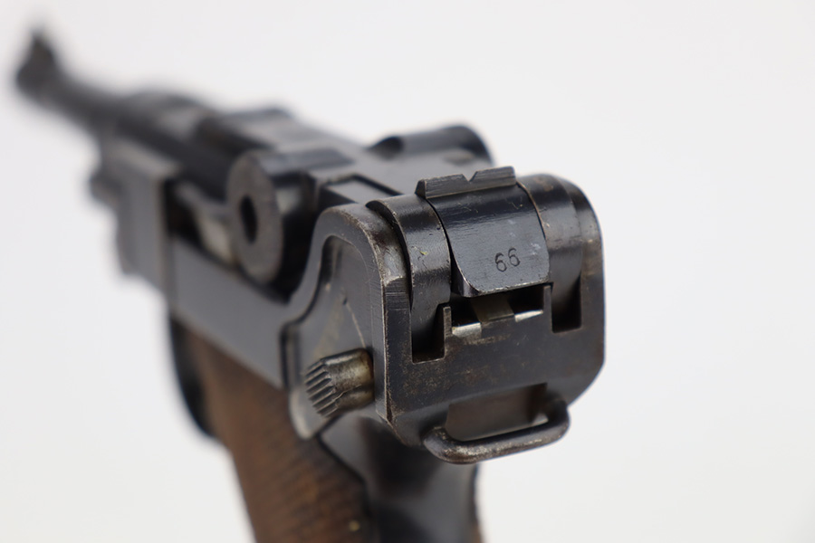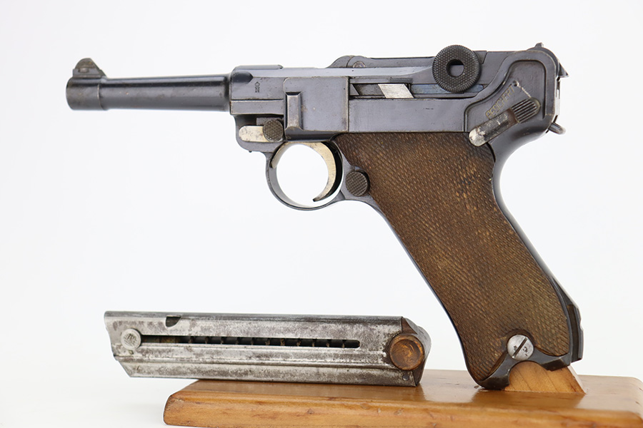 12/5/23 – This is a DWM Luger sold in the commercial market in the 1920’s. All matching and chambered in .30 Luger. The original finish rates about 93%. There is wear around the muzzle and general high edge wear. While there is not much actual finish loss, there are areas of spotty oxidation and discoloration here and there. Fitted with un-numbered wood grips and comes with an un-numbered magazine. Replaced grip screws. Minty bore.