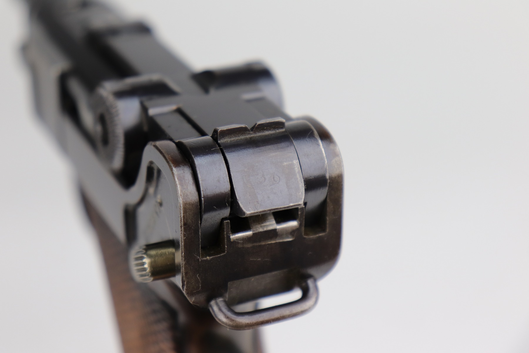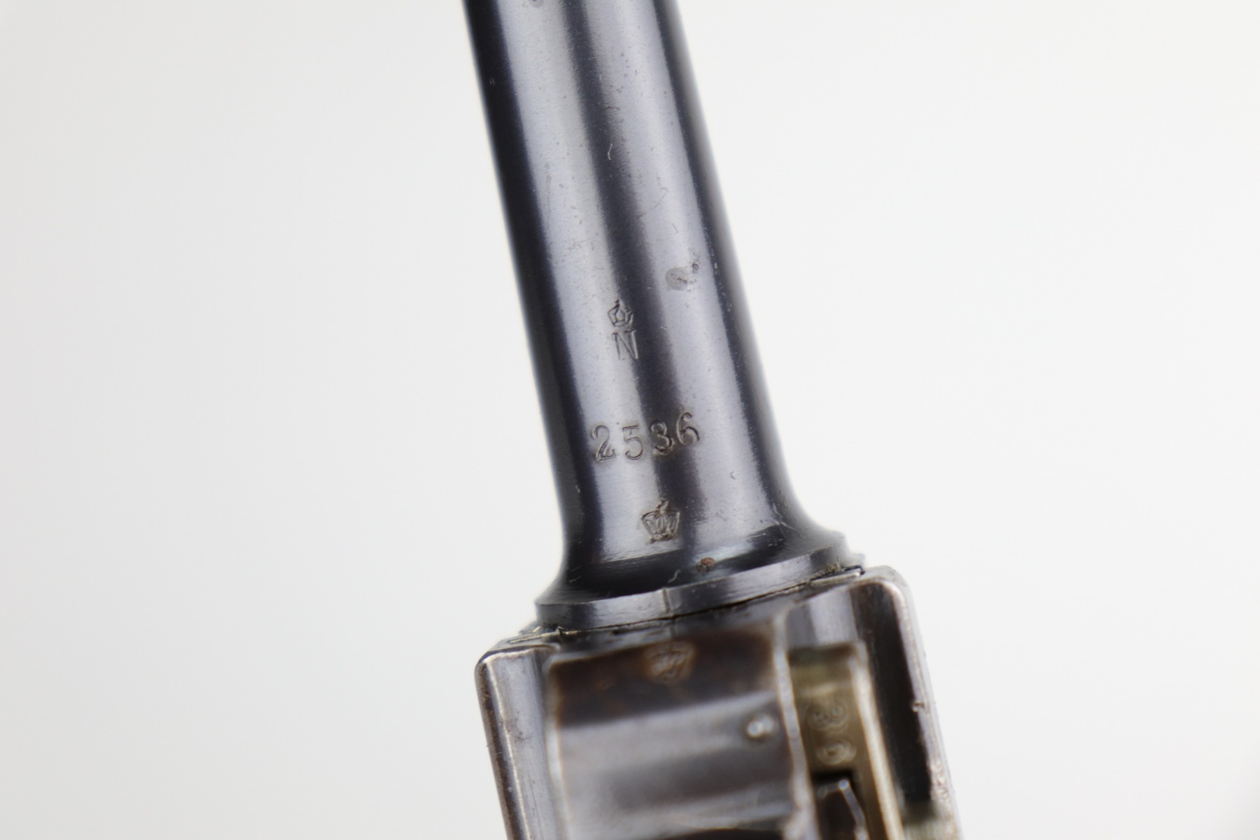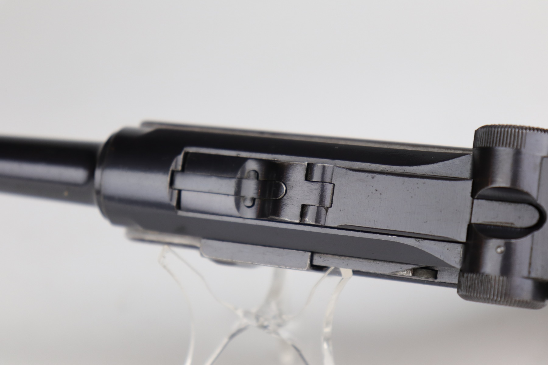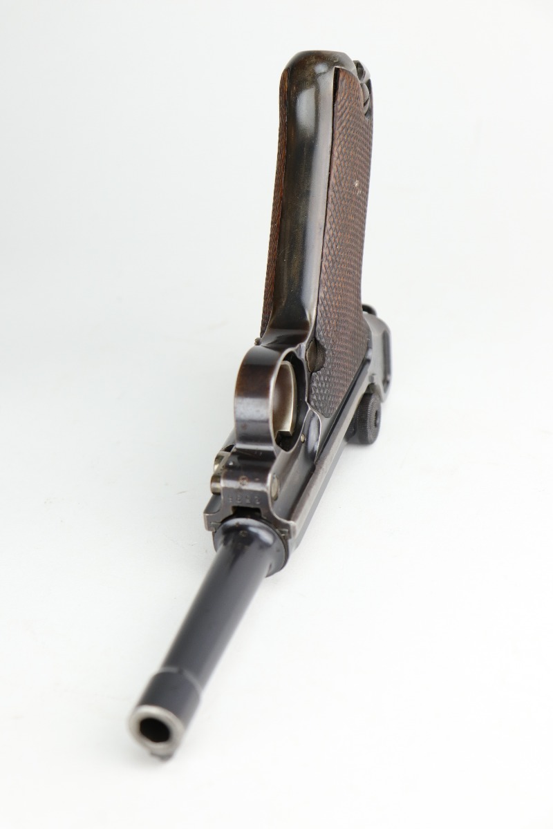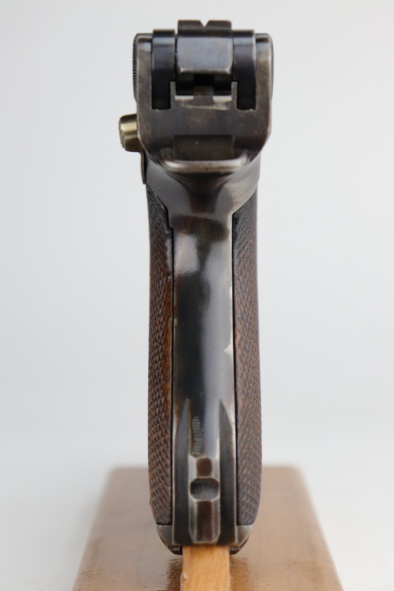 11/19/20 – This is a nice example of a 1920’s Commercial DWM Luger P.08. It has unmarked and un-numbered toggle. Everything is all matching. It has a “Germany” export mark on the left side of the frame, indicating that it was made for the international commercial market. It has retained roughly 75% of its bluing. There is wear on the right side of the frame, around the muzzle, on the side plate, and spotty wear on the straps. It appears that the front strap may have been touched up at some point. There is spotty oxidation most noticeable on the barrel and right side of the frame. It comes with nice un-numbered wood grips and a period-correct “Germany” marked magazine. The bore has strong rifling with minor pin-pricking throughout. This would make an excellent shooter.