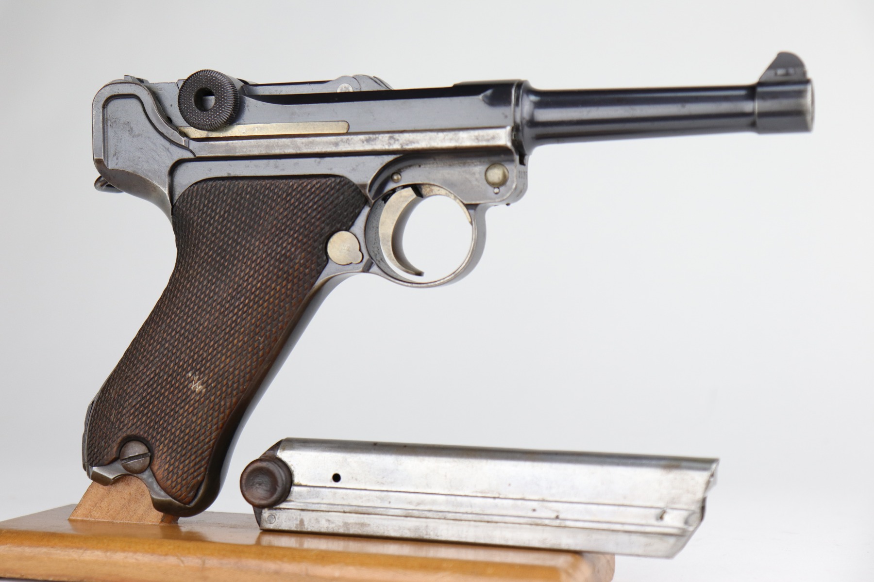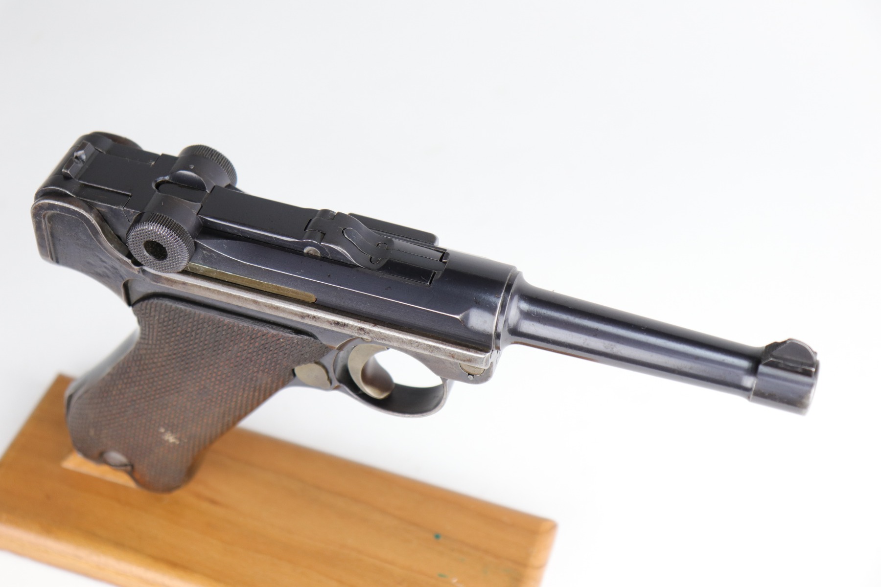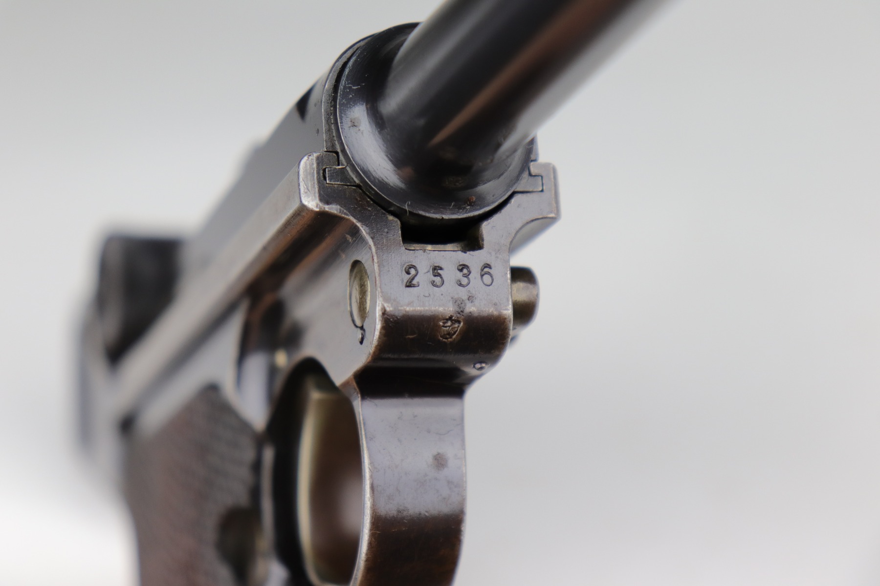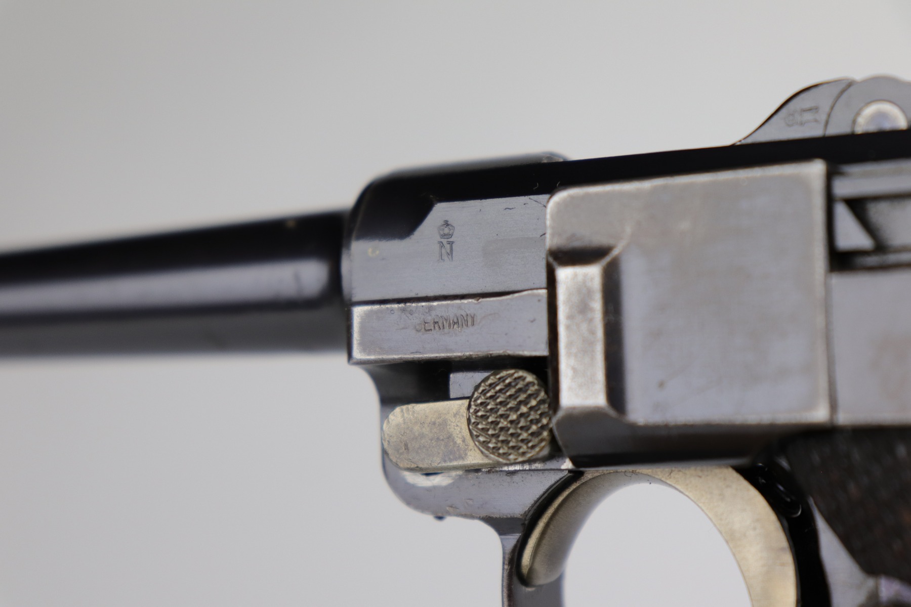 11/19/20 – This is a nice example of a 1920’s Commercial DWM Luger P.08. It has unmarked and un-numbered toggle. Everything is all matching. It has a “Germany” export mark on the left side of the frame, indicating that it was made for the international commercial market. It has retained roughly 75% of its bluing. There is wear on the right side of the frame, around the muzzle, on the side plate, and spotty wear on the straps. It appears that the front strap may have been touched up at some point. There is spotty oxidation most noticeable on the barrel and right side of the frame. It comes with nice un-numbered wood grips and a period-correct “Germany” marked magazine. The bore has strong rifling with minor pin-pricking throughout. This would make an excellent shooter.