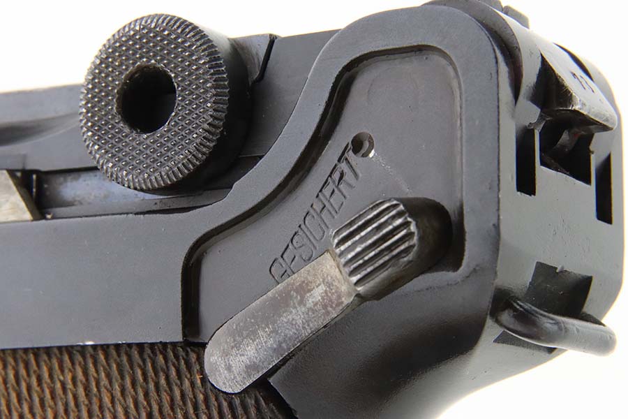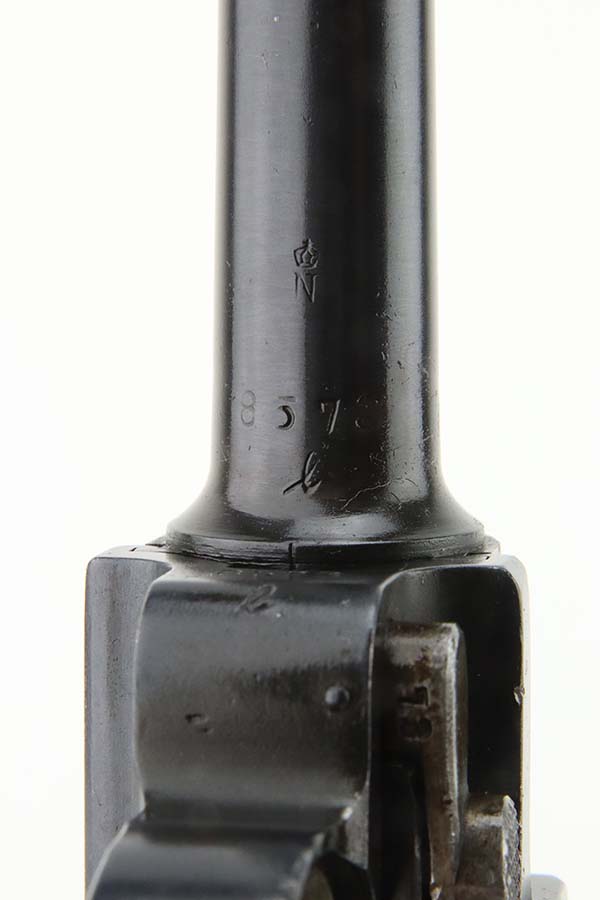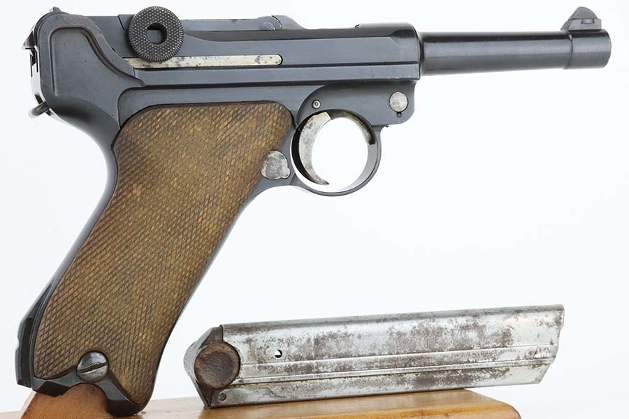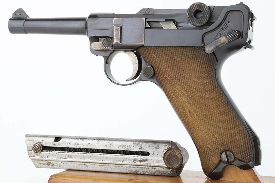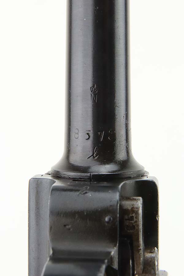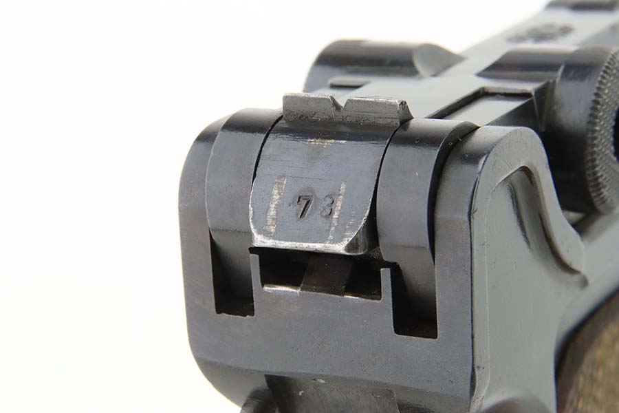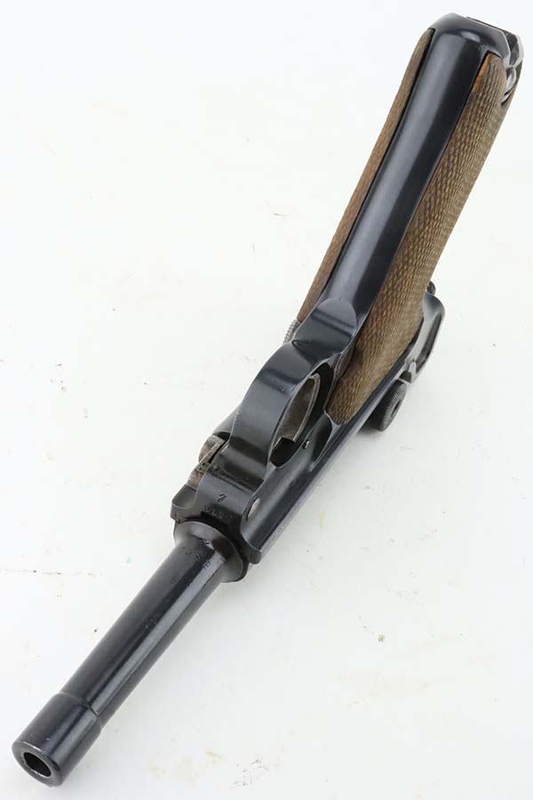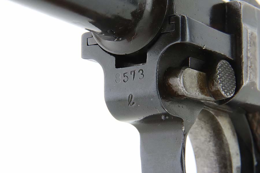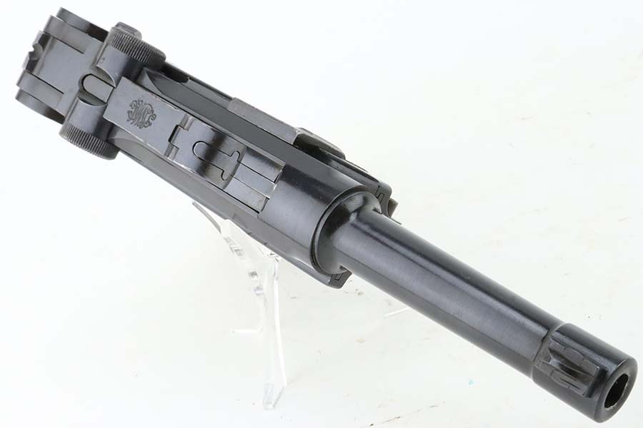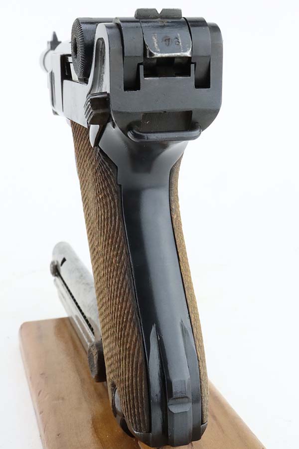 3/13/24 – This is a very nice example of a DWM Luger sold in the commercial market in 1920’s. Chambered in .30 Luger. All matching and “Crown N” proofed. We believe this gun has been refinished. The bluing rates about 95% with some wear on the side plate. Fitted with very nice un-numbered wood grips and comes with a blank bottom commercial magazine. The bore has pretty good rifling, but there is light pin-pricking throughout.