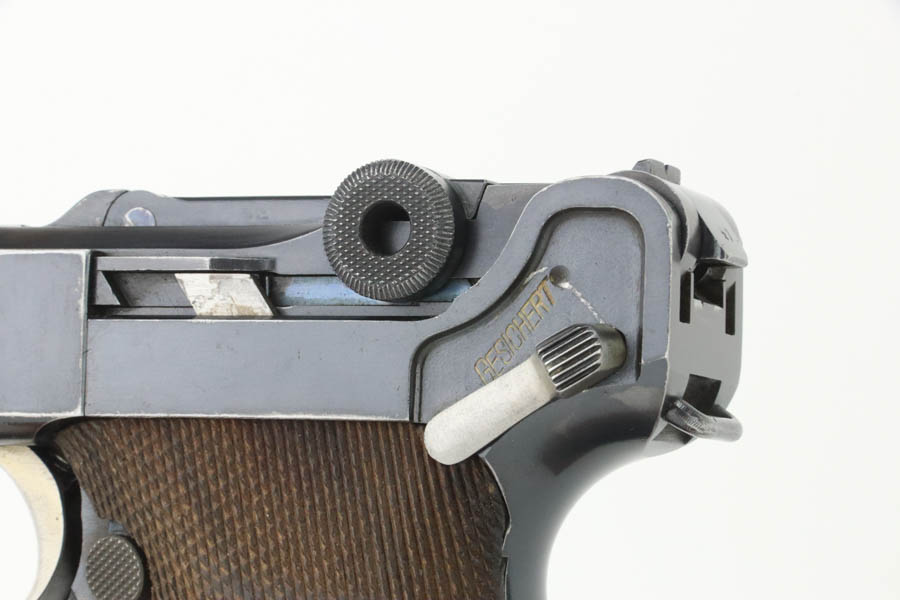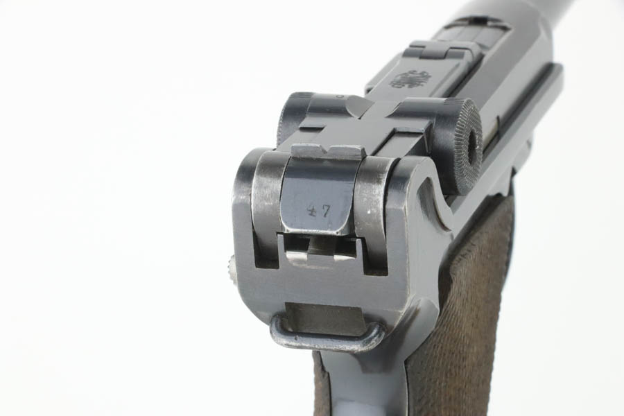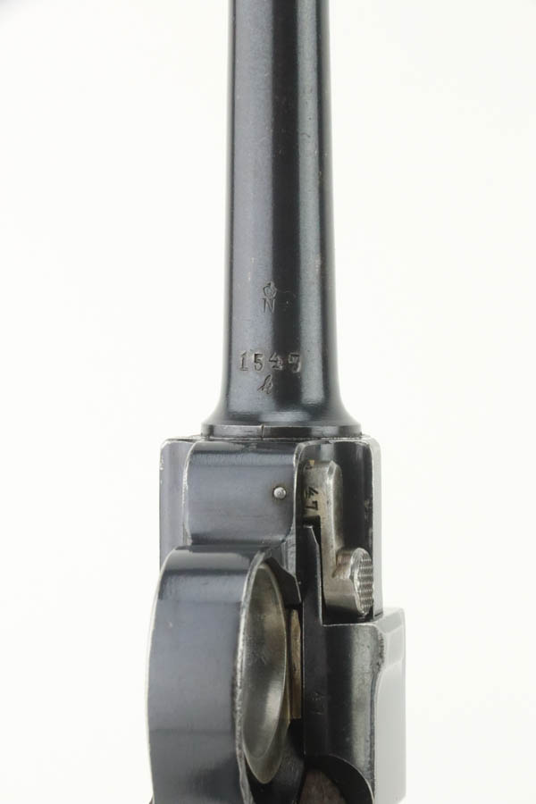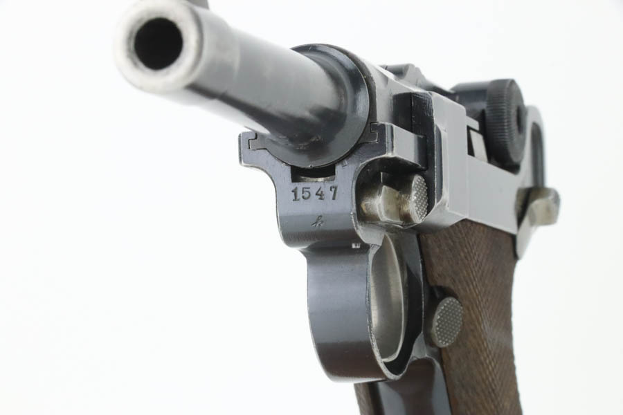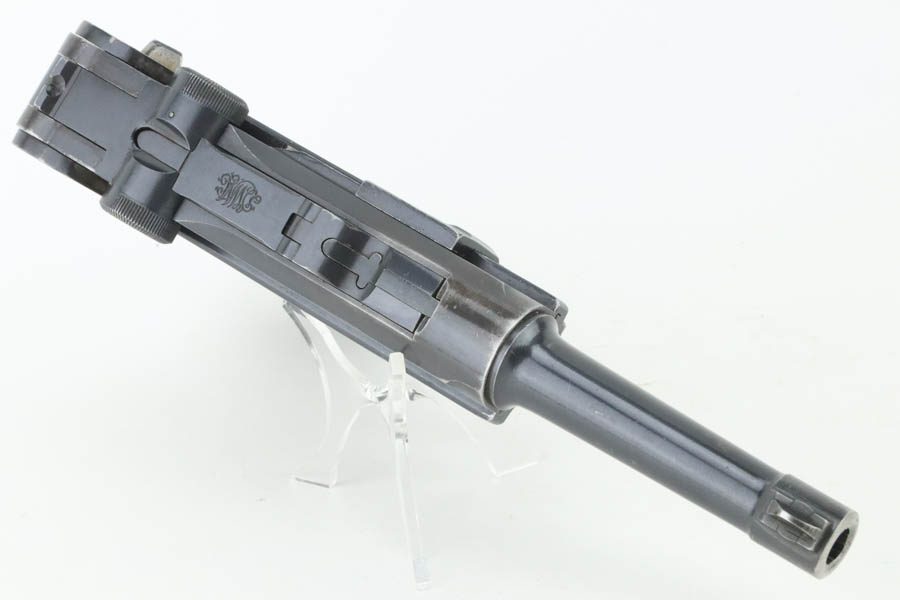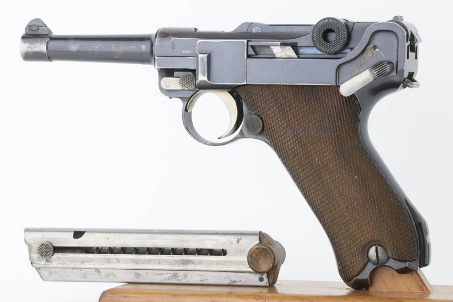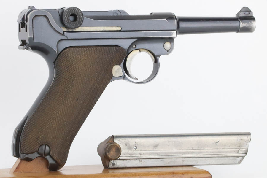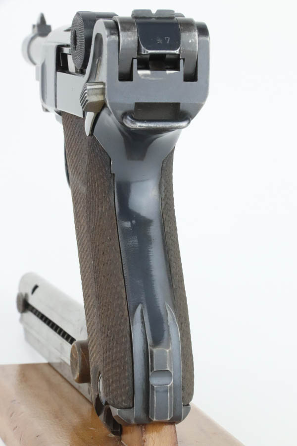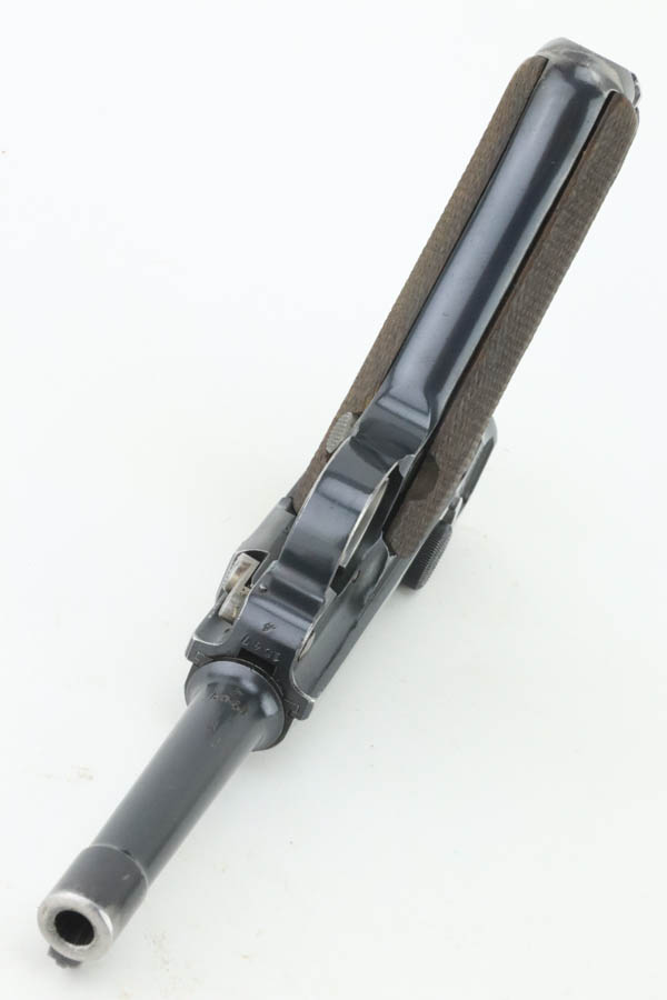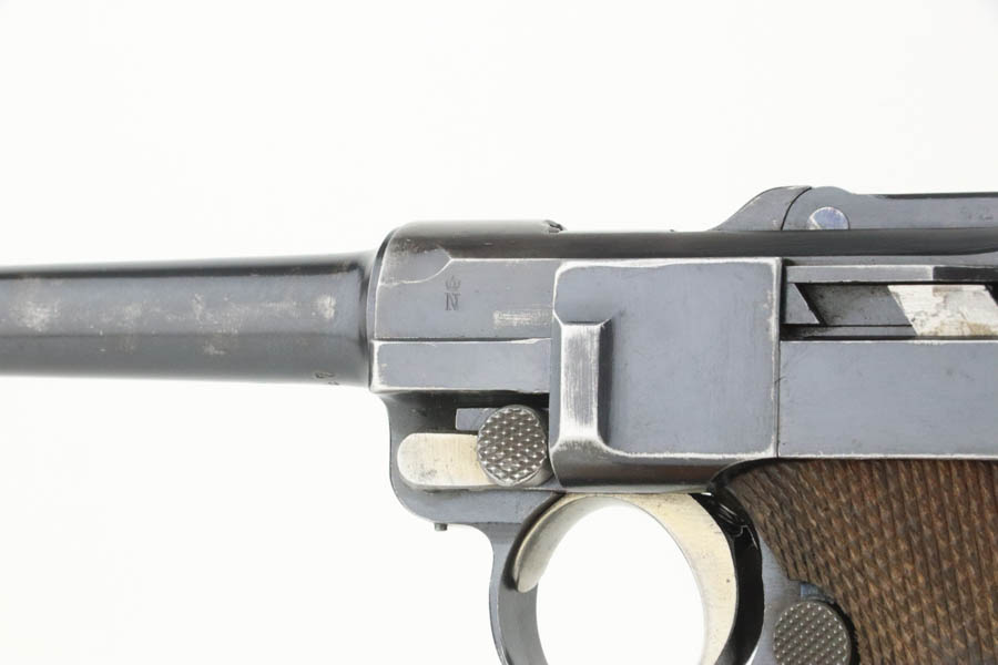 8/6/24 – This is a very nice example of a DWM Luger sold in the commercial market in the 1920’s. Chambered in .30 Luger. All matching with the proper “Crown N” proofs. Its original finish rates about 92%. There is wear around the muzzle, along the left side of the barrel, on the high edges, and one small spot a the base of the front strap. Fitted with very nice wood grips and comes with an un-numbered commercial magazine. Excellent, shiny bore.
