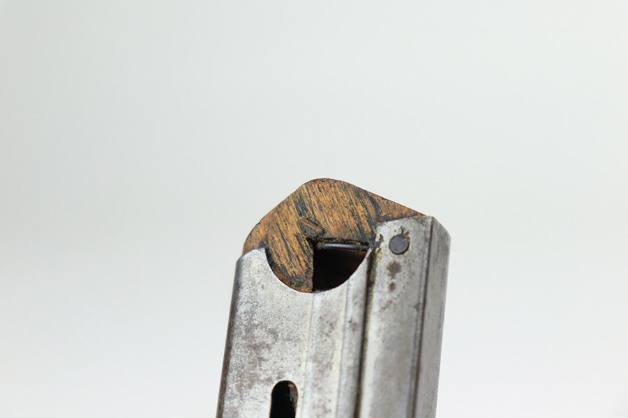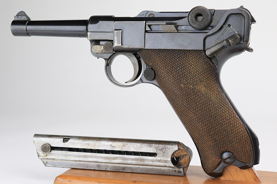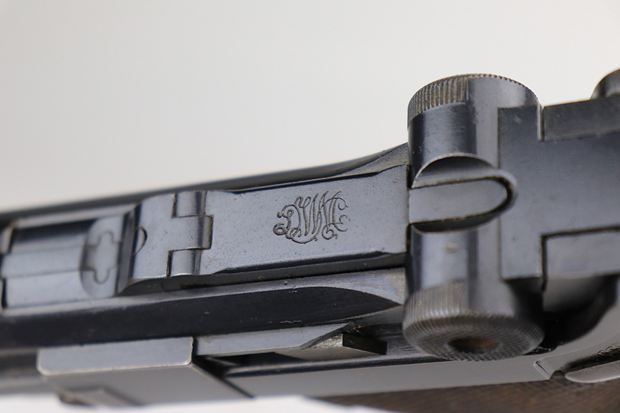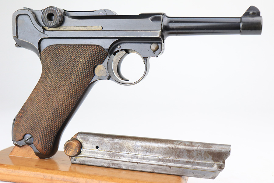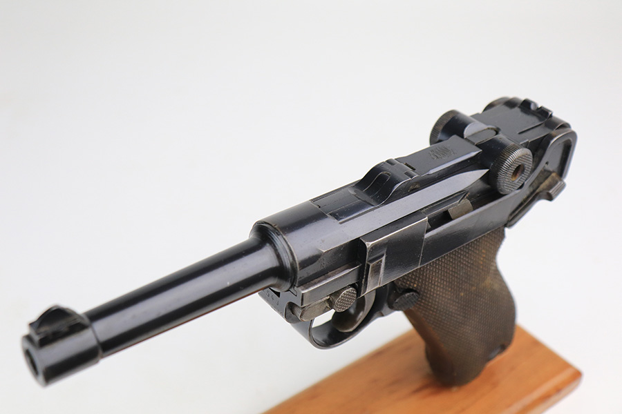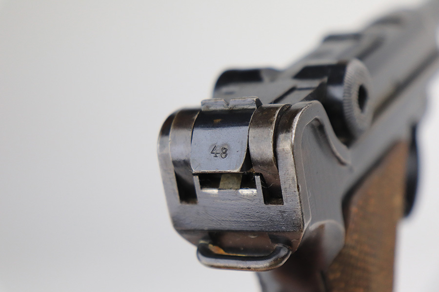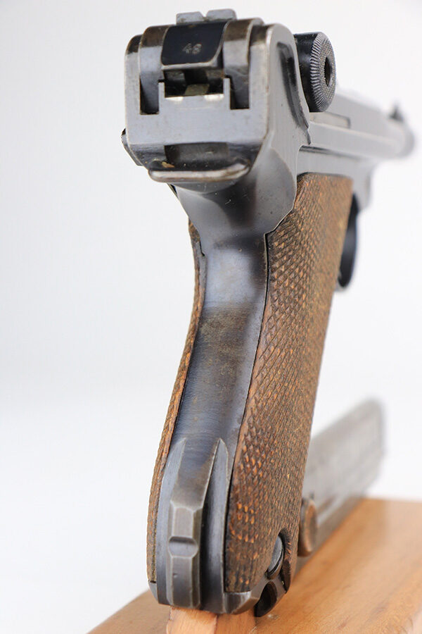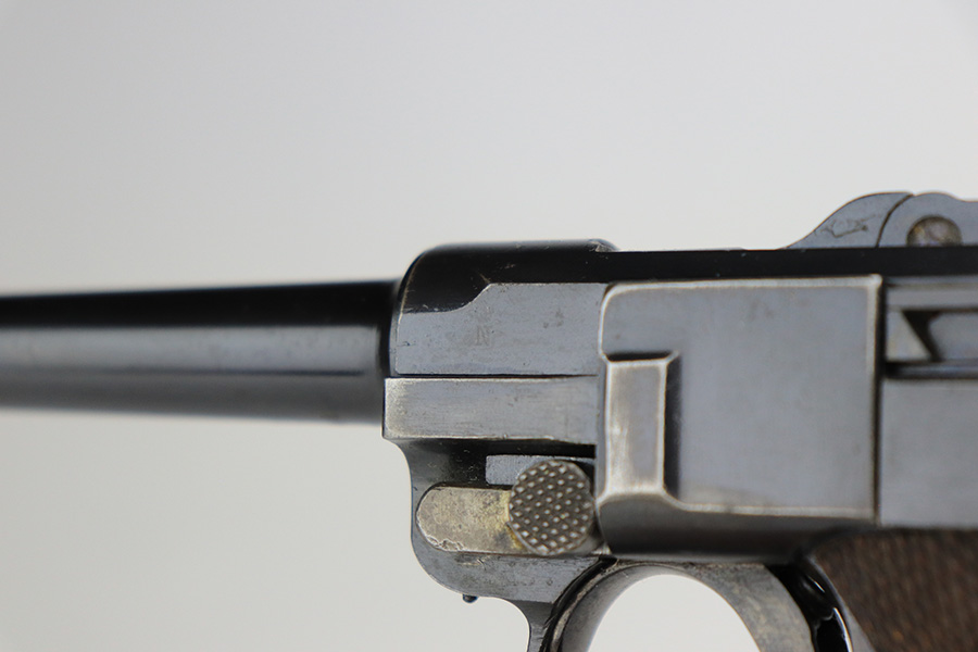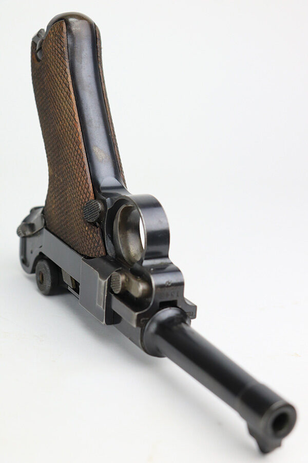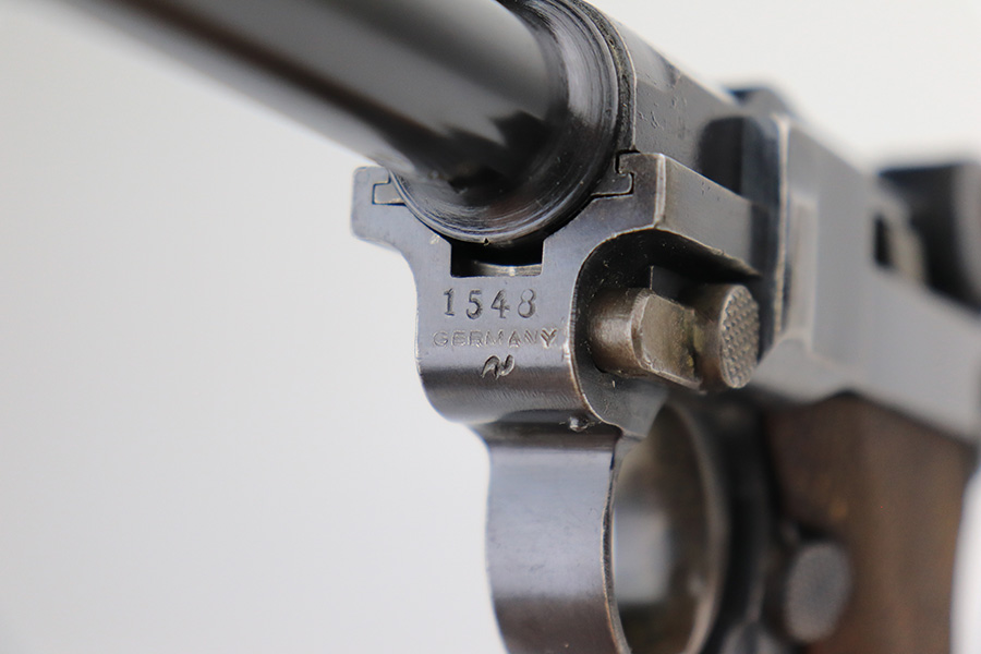 1/7/22 – This is a very nice example of a DWM Luger sold in the commercial market in the 1920’s. It is all matching and has the proper “Crown N” commercial proofs. There is a “Germany” export marking on the frame, indicating it was intended for sale in the international market. The gun has retained about 93-94% of its bluing. There is minor wear on the side plate and side rails. There are a few spots of wear and light brown patina on both grip straps. Comes with nice period-correct wood grips (some minor scuffing) and a period-correct wood-bottom magazine that has a significant chip in the base. The rifling in the bore is worn with tiny pits throughout.