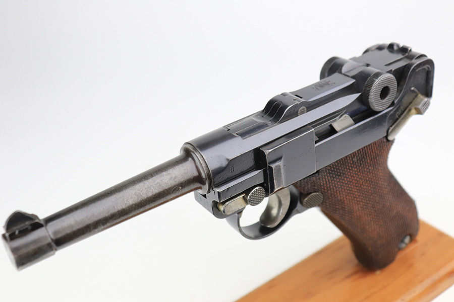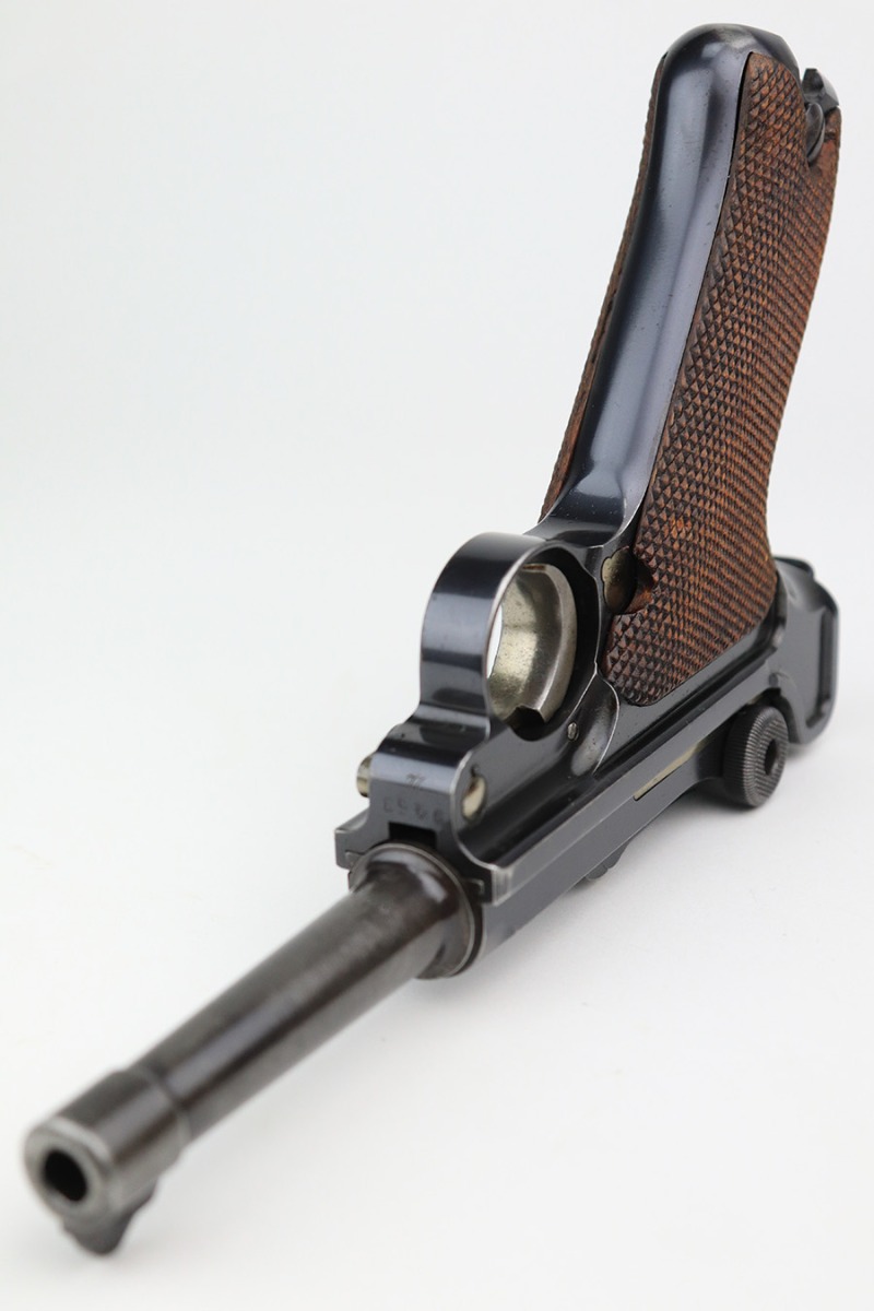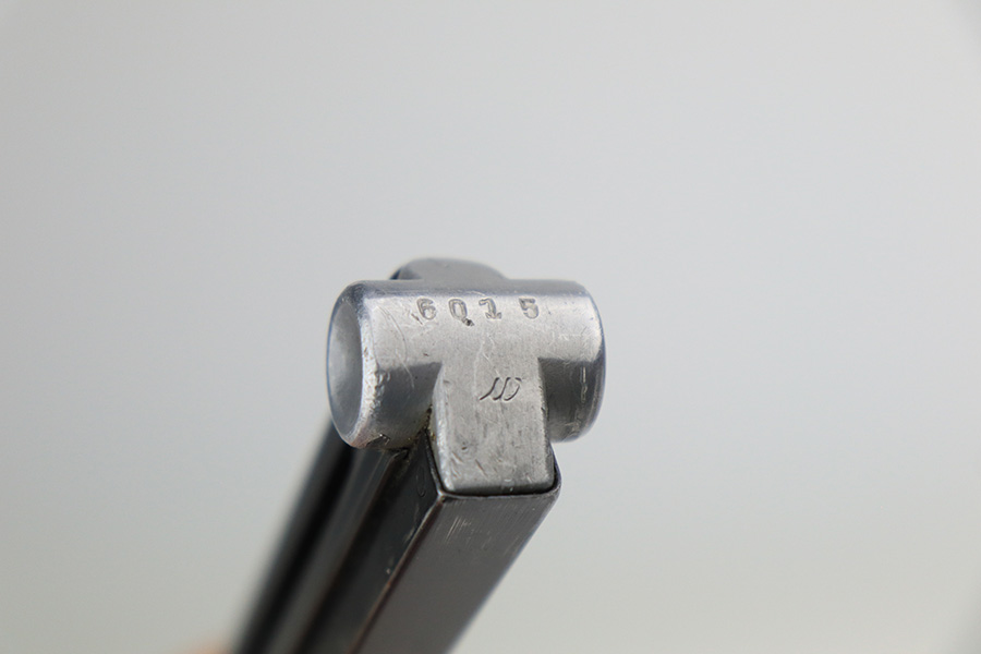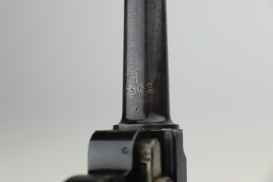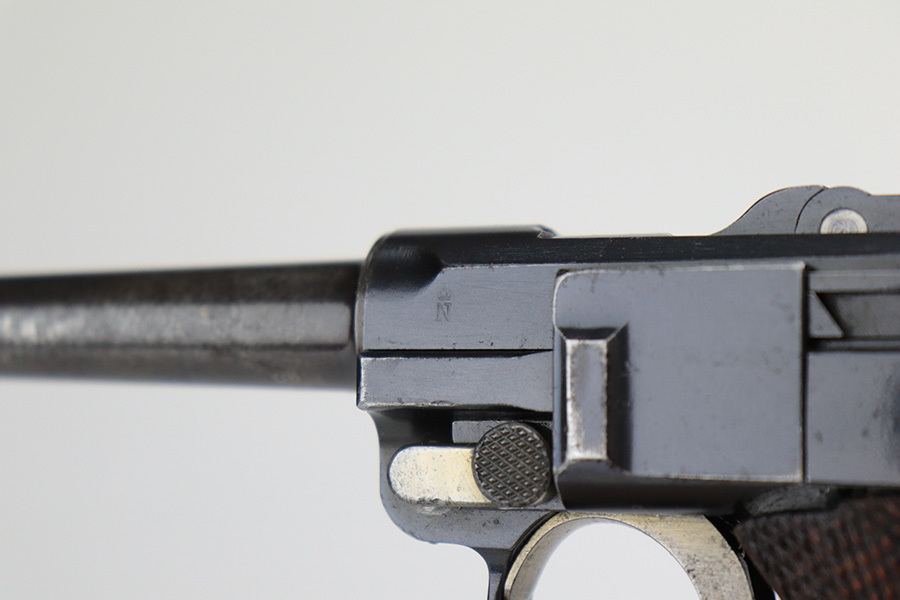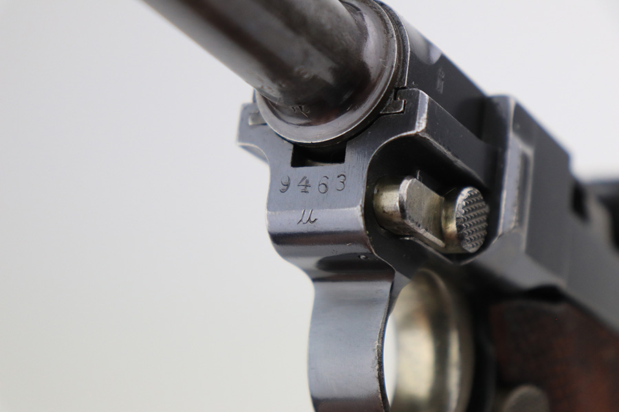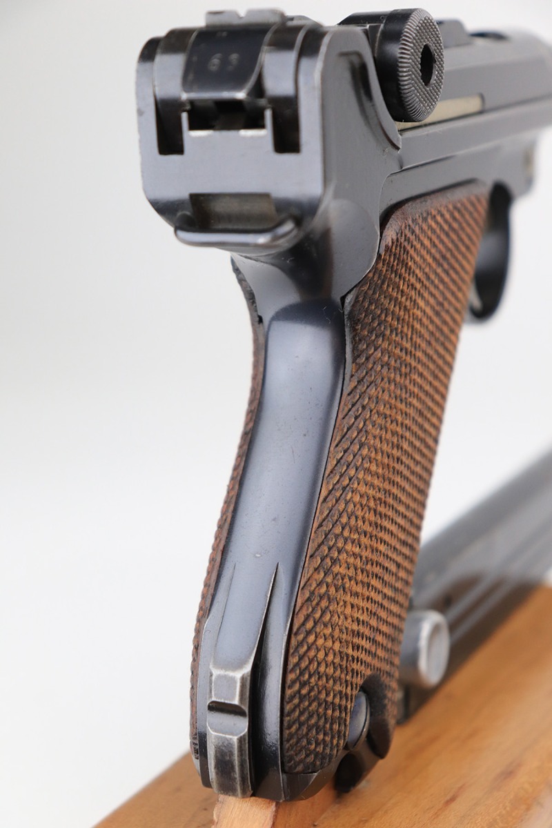 5/12/22 – This is a very nice example of a DWM Luger sold in the commercial market in the 1920’s. It is all matching and has the proper “Crown N” commercial proofs. There are hints of wear on the side plate and side rails, but the majority of the wear is on the the barrel, where there are also tiny dots of oxidation. The condition of the barrel does not match the rest of the gun, but it is matching and original. Our best guess is that the metal prep was not as good on this part. Comes with minty un-numbered wood grips. The left panel is marked “S/42”, denoting an armorer’s replacement. The left panel is a little loose. Also comes with a mismatched aluminum bottom magazine. The bore has good rifling, but there is minor frosting throughout.