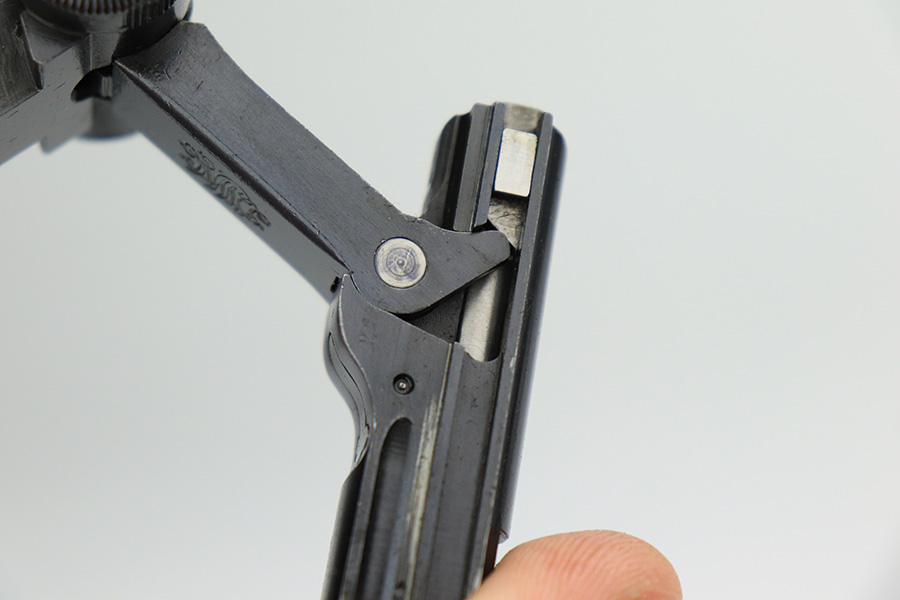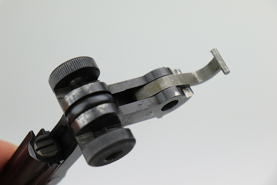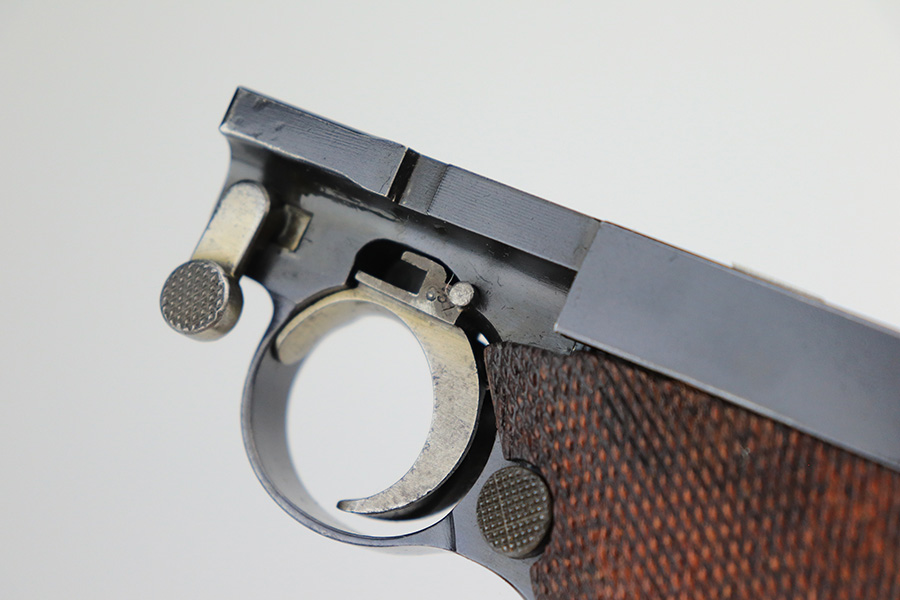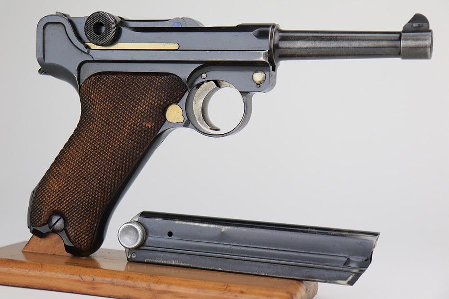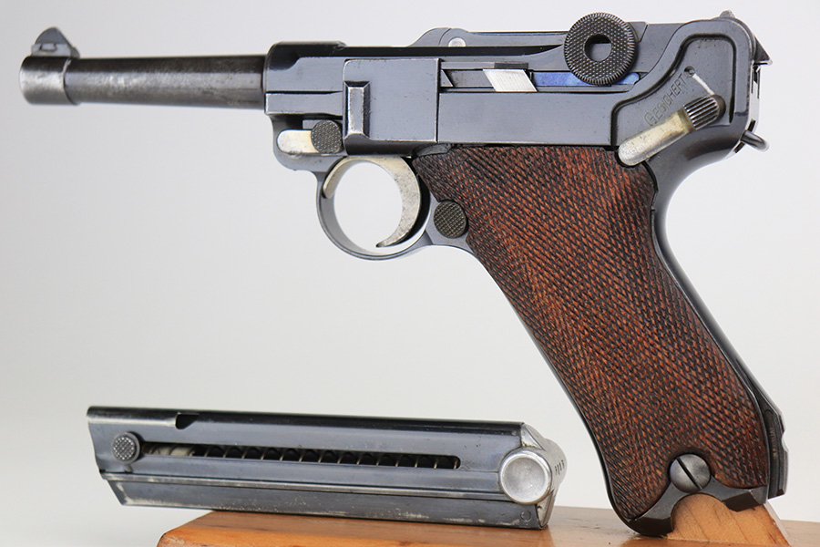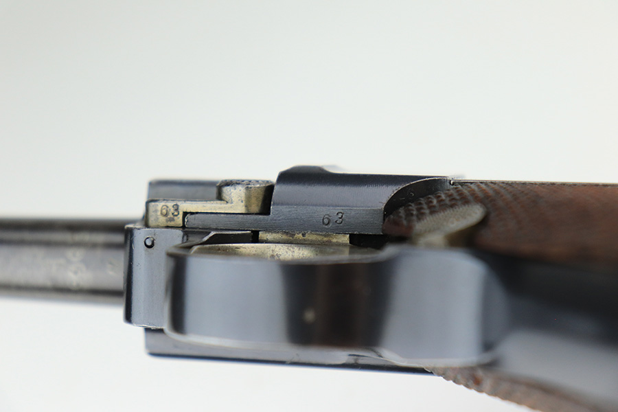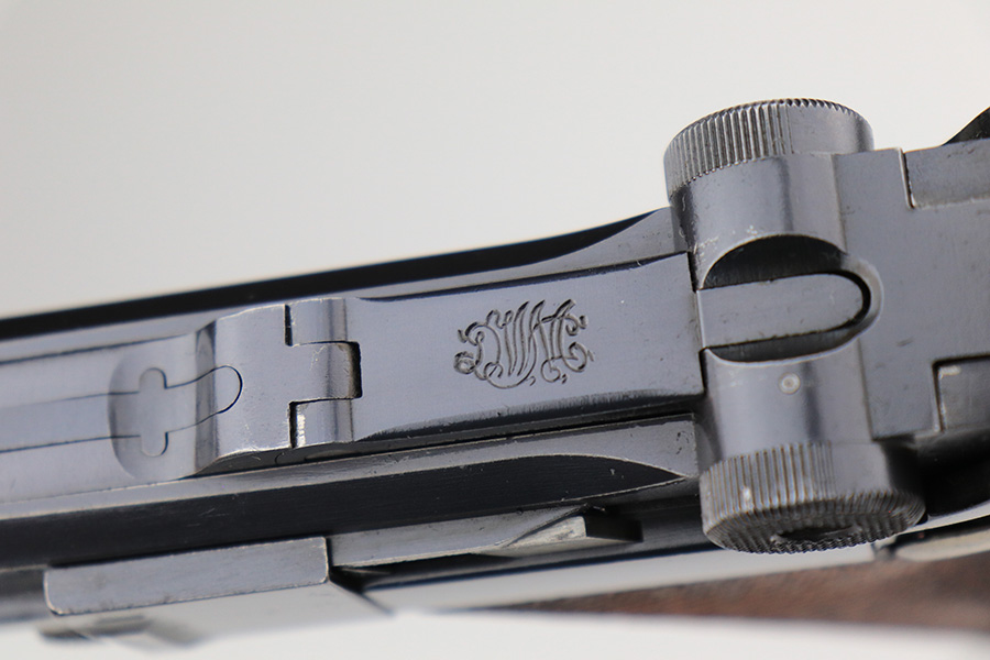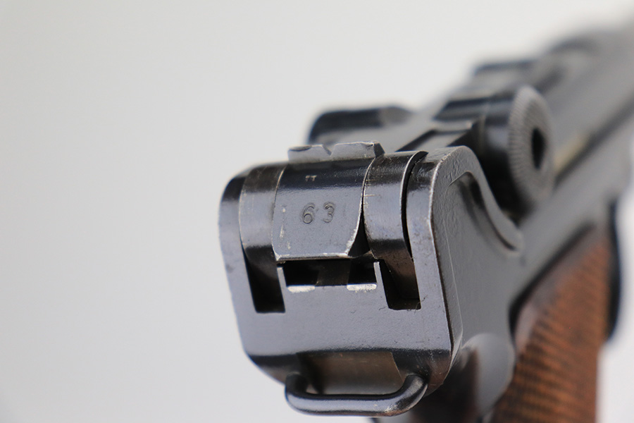 5/12/22 – This is a very nice example of a DWM Luger sold in the commercial market in the 1920’s. It is all matching and has the proper “Crown N” commercial proofs. There are hints of wear on the side plate and side rails, but the majority of the wear is on the the barrel, where there are also tiny dots of oxidation. The condition of the barrel does not match the rest of the gun, but it is matching and original. Our best guess is that the metal prep was not as good on this part. Comes with minty un-numbered wood grips. The left panel is marked “S/42”, denoting an armorer’s replacement. The left panel is a little loose. Also comes with a mismatched aluminum bottom magazine. The bore has good rifling, but there is minor frosting throughout.
