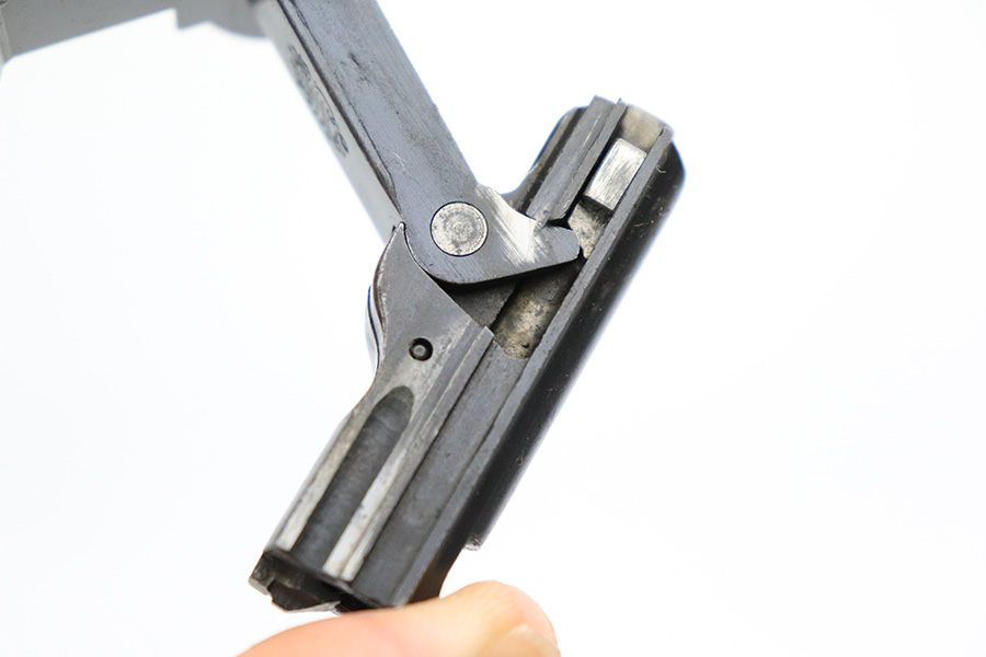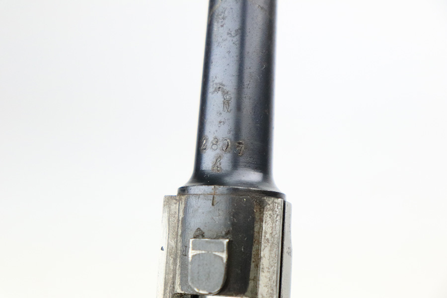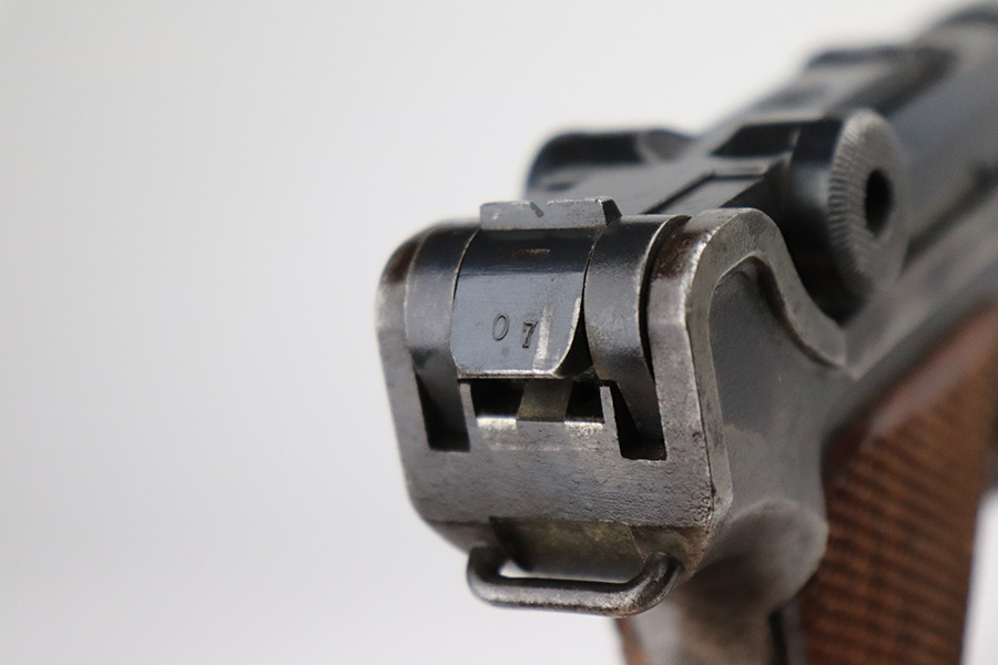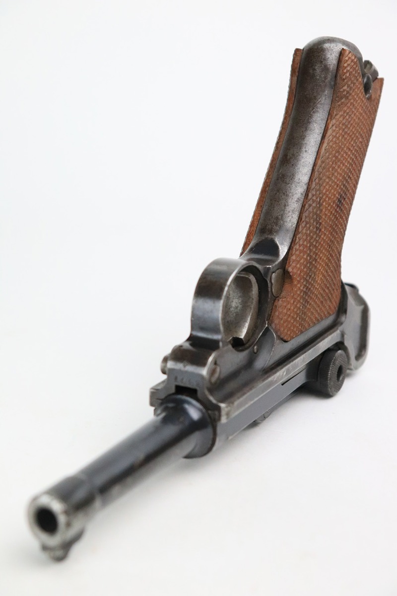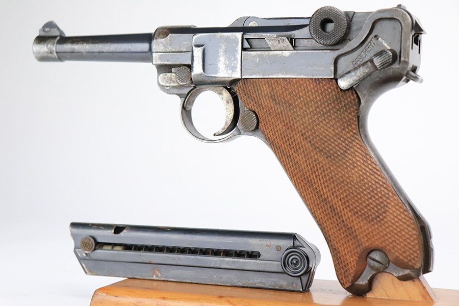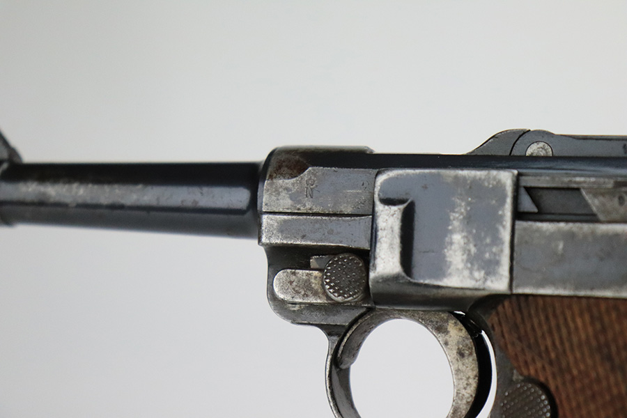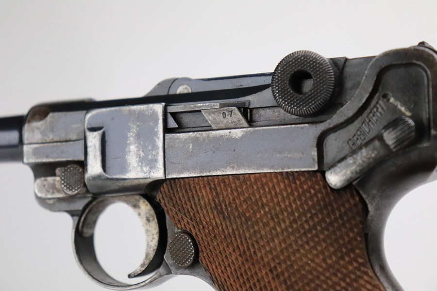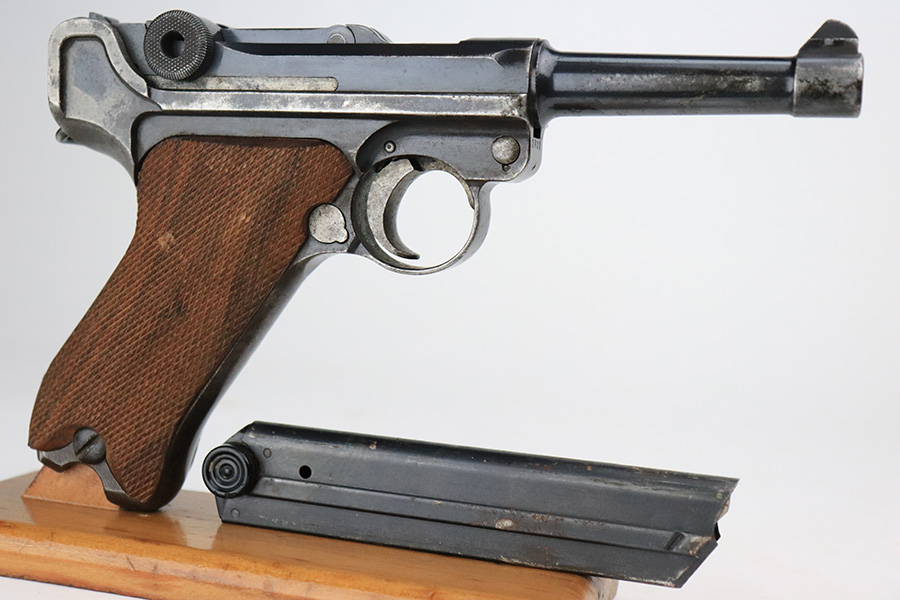 7/18/22 – This is a nice, shooter-grade example of a DWM Luger sold in the commercial market in the 1920’s and chambered in .30 Luger. All numbered parts are matching except for the side plate, and it does have the proper “Crown N” commercial proofs throughout. The gun has lost roughly half of its finish and the side plate appears to have been slightly buffed. There are areas of noticeable spotty wear and small dots of oxidation throughout. Comes with nice replacement wood grips and a reproduction magazine. The bore has good rifling with minor frosting in the grooves.