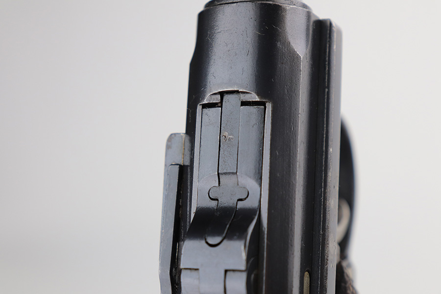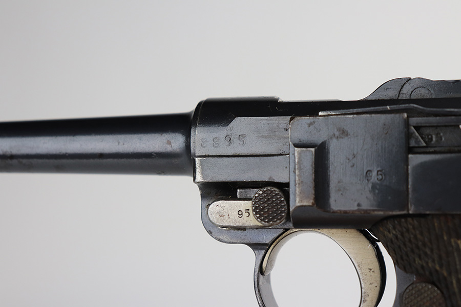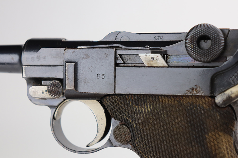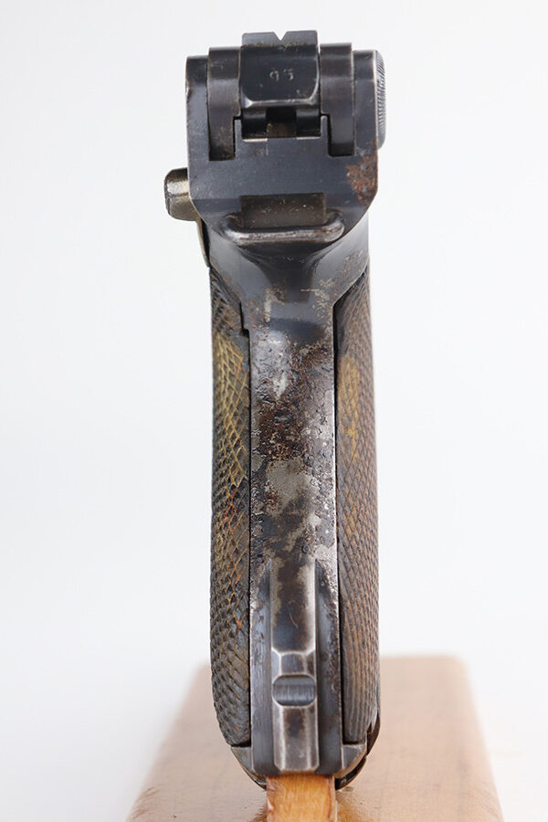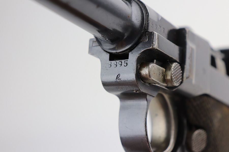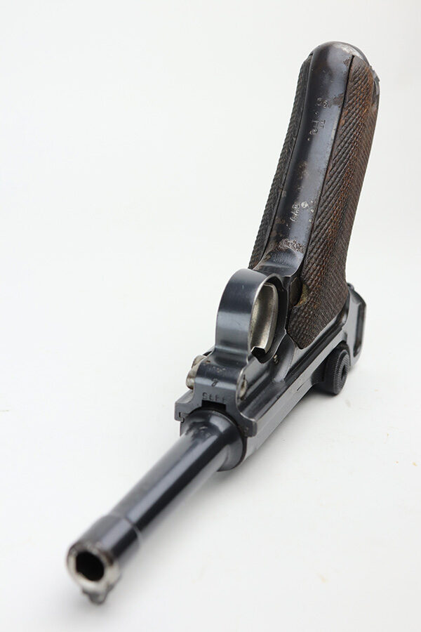 8/16/21 – This is a nice example of a 1920’s commercial DWM Luger that was later reworked and issued to the Nazi police. It is all matching, has an added police sear safety, has a matching WW2-era police-numbered magazine, and has a “S.Hn. 177” police unit marking on the front strap. We believe this stands for the Schutzpolizei of Hanover. It has retained about 85% of its finish. There is splotchy wear on the straps and right side rail. Minor wear on the high edges in general and around the muzzle. While there isn’t a ton of actual finish loss, there are areas of heavy pitting and heavy oxidation on the straps, left side of the frame, and on the left side of the barrel. It is most noticeable on the back strap. Comes with nice un-numbered grips. The bore is excellent – shiny with strong rifling.