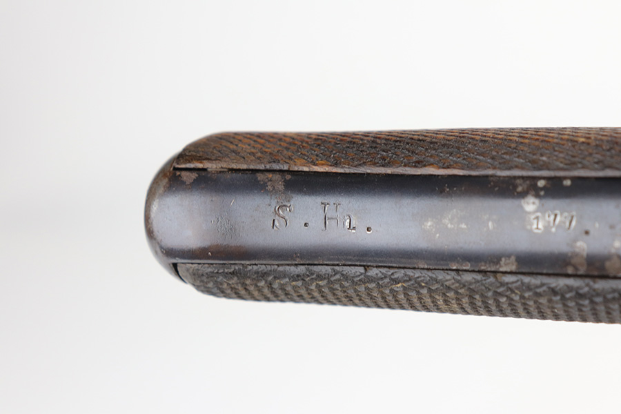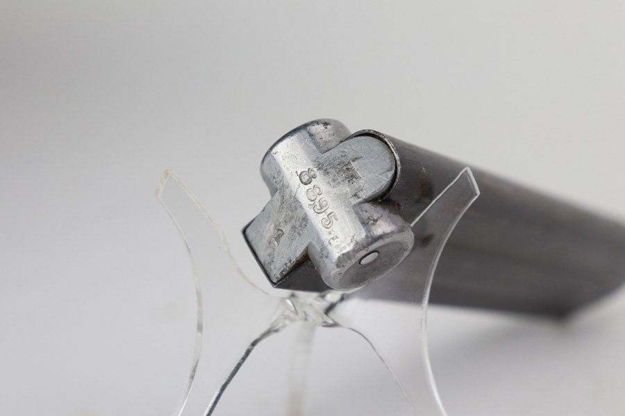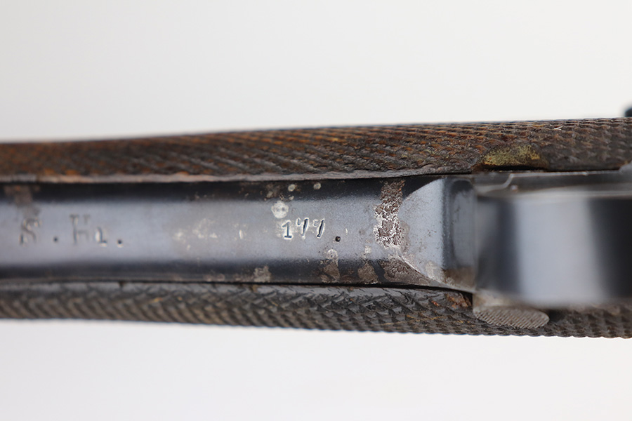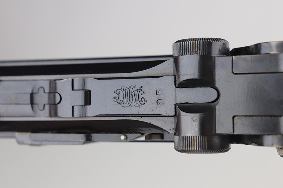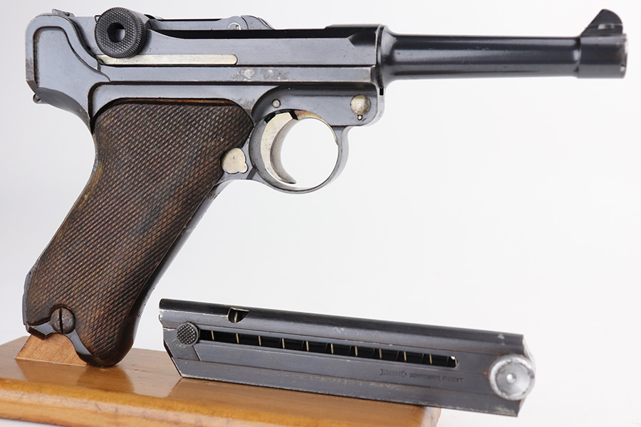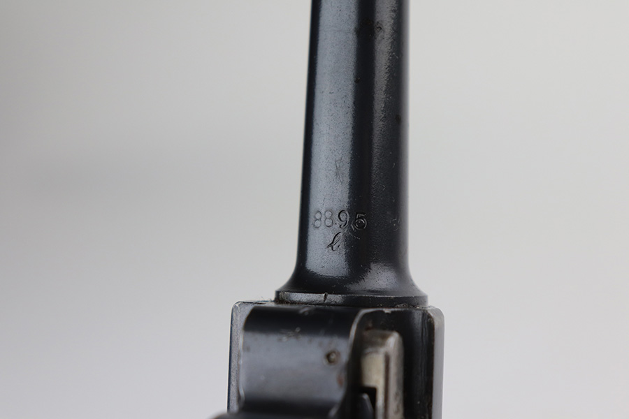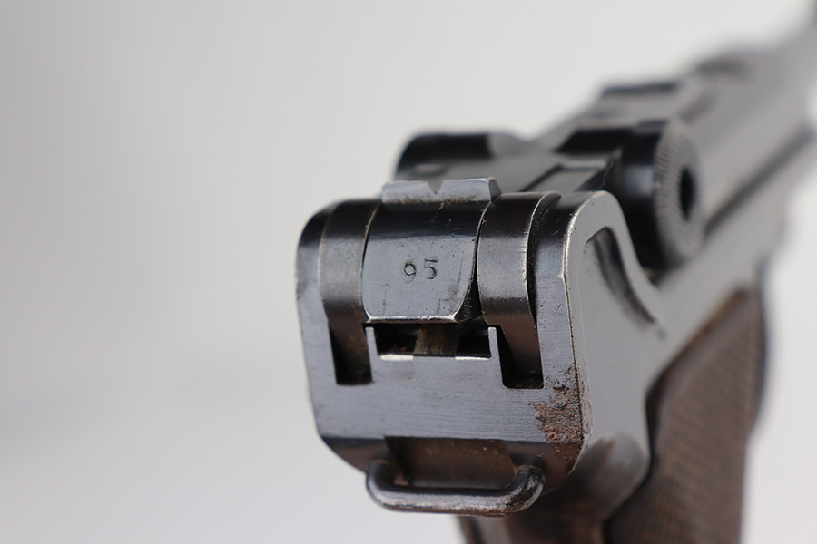 8/16/21 – This is a nice example of a 1920’s commercial DWM Luger that was later reworked and issued to the Nazi police. It is all matching, has an added police sear safety, has a matching WW2-era police-numbered magazine, and has a “S.Hn. 177” police unit marking on the front strap. We believe this stands for the Schutzpolizei of Hanover. It has retained about 85% of its finish. There is splotchy wear on the straps and right side rail. Minor wear on the high edges in general and around the muzzle. While there isn’t a ton of actual finish loss, there are areas of heavy pitting and heavy oxidation on the straps, left side of the frame, and on the left side of the barrel. It is most noticeable on the back strap. Comes with nice un-numbered grips. The bore is excellent – shiny with strong rifling.