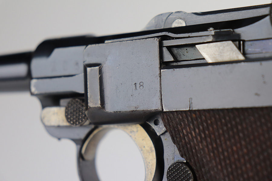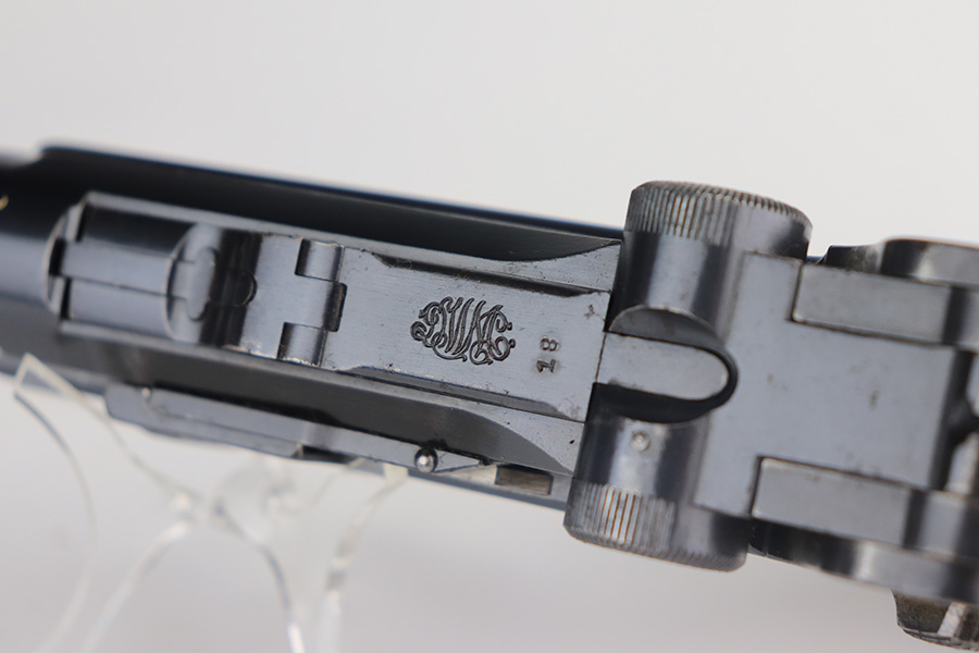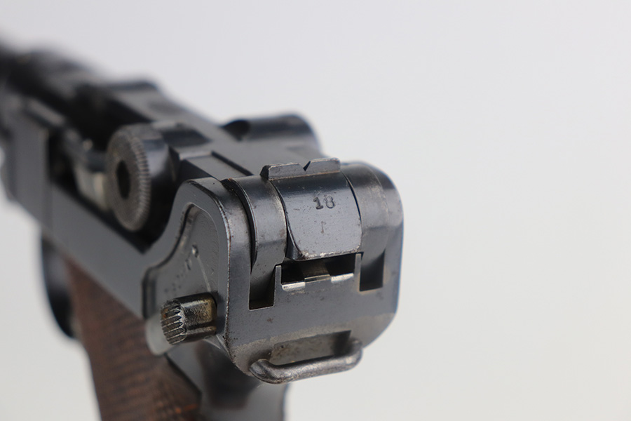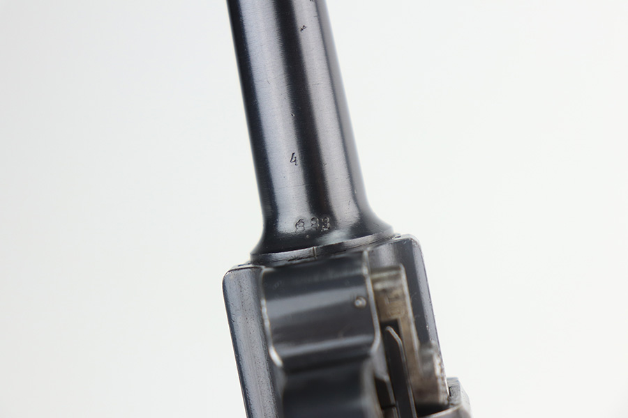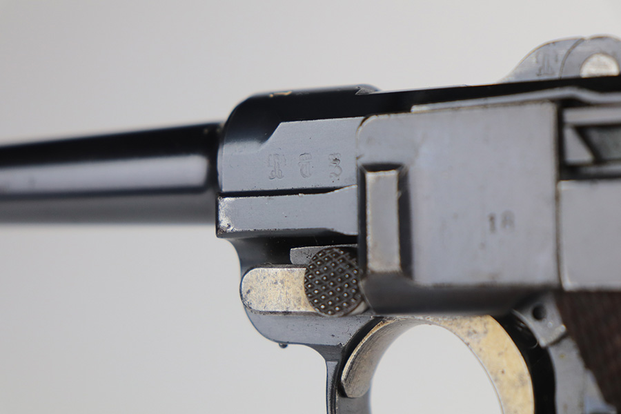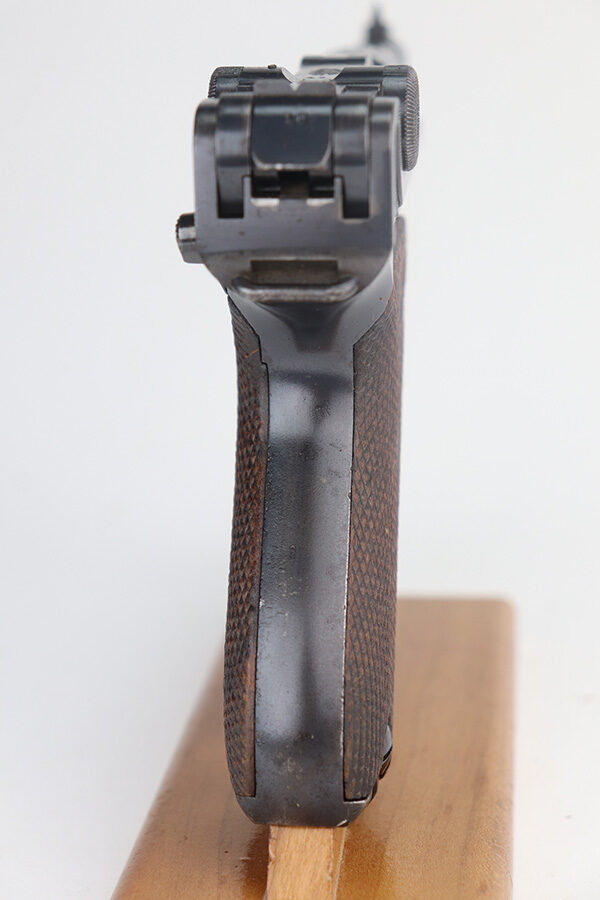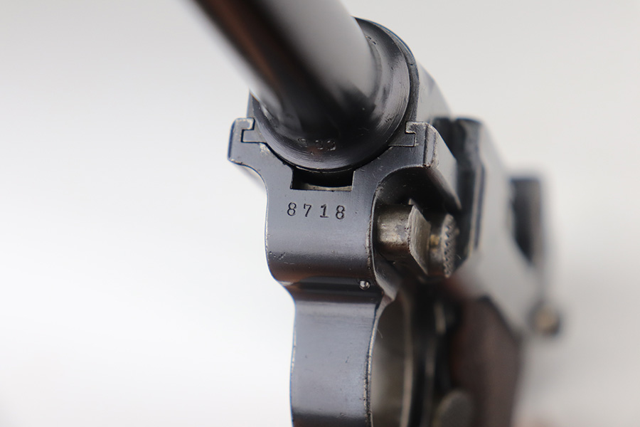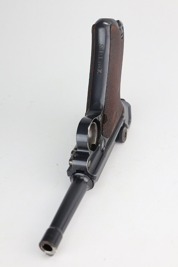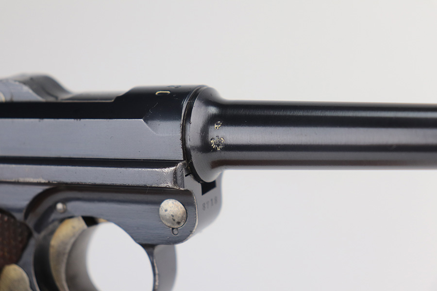 5/27/21 – This is a very nice example of a 1920’s DWM Commercial Luger that was converted for police use. It has a “1920” rework marking on the chamber. The barrel was replaced with a Simson barrel, a police sear safety was added, and there is a police unit marking on the front strap. It comes with two mismatched magazines, a mismatched luger tool, and a police holster that has police unit markings. The lift strap on the inside of the holster broke off but will be included with the holster. All numbered parts of the gun are matching. It has retained about 96% of its bluing. There is minor wear on the side plate, side rail, and around the muzzle. Tiny dots of oxidation throughout. Very minor pin-pricking on the straps. Excellent bore – shiny with strong rifling.