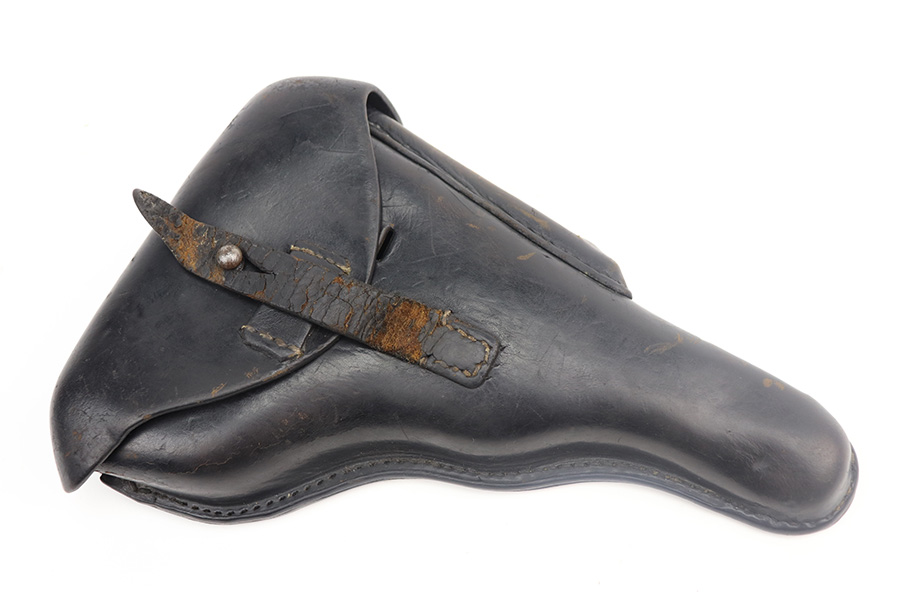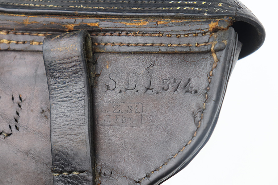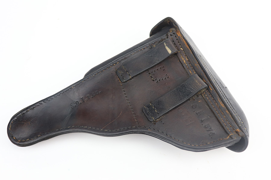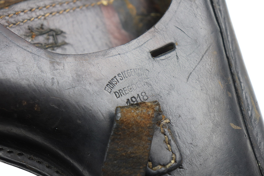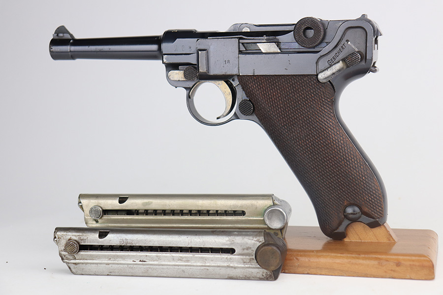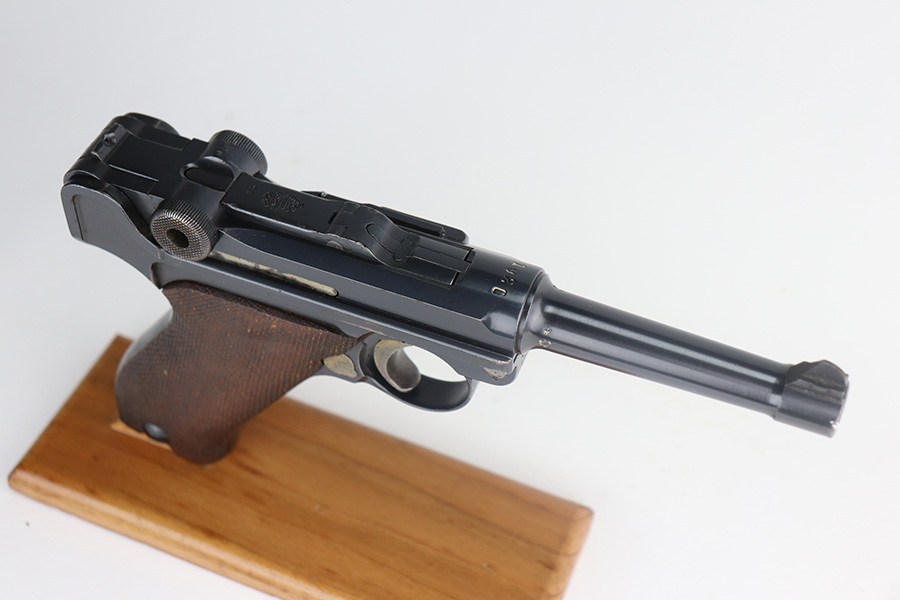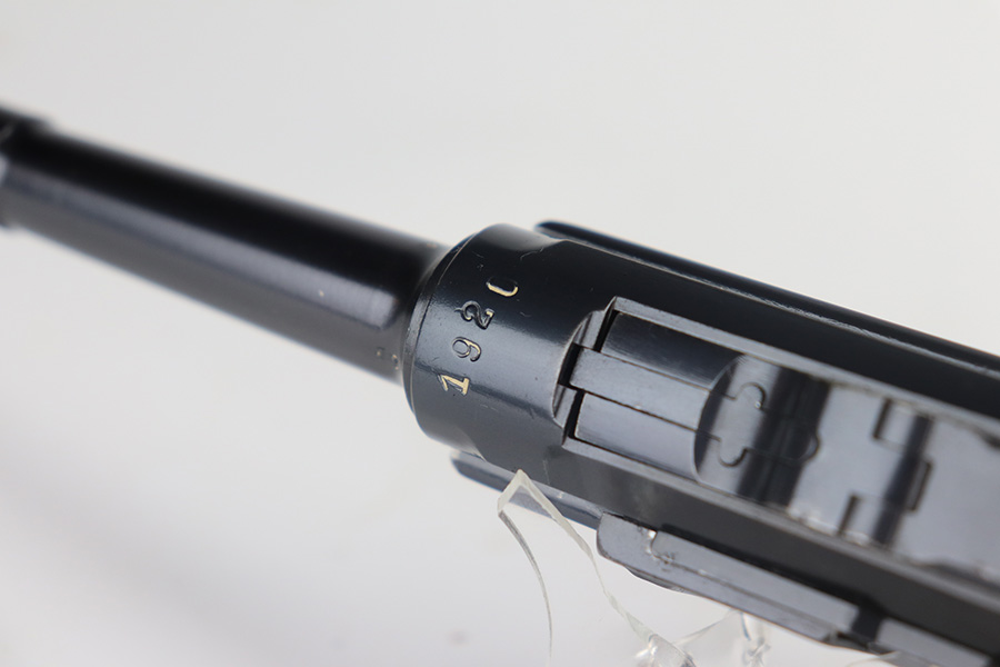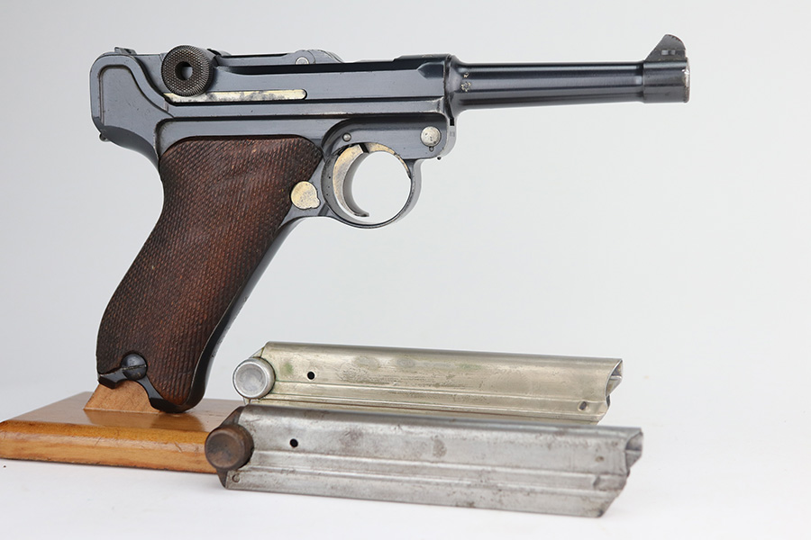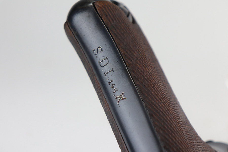 5/27/21 – This is a very nice example of a 1920’s DWM Commercial Luger that was converted for police use. It has a “1920” rework marking on the chamber. The barrel was replaced with a Simson barrel, a police sear safety was added, and there is a police unit marking on the front strap. It comes with two mismatched magazines, a mismatched luger tool, and a police holster that has police unit markings. The lift strap on the inside of the holster broke off but will be included with the holster. All numbered parts of the gun are matching. It has retained about 96% of its bluing. There is minor wear on the side plate, side rail, and around the muzzle. Tiny dots of oxidation throughout. Very minor pin-pricking on the straps. Excellent bore – shiny with strong rifling.
