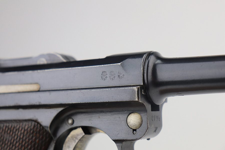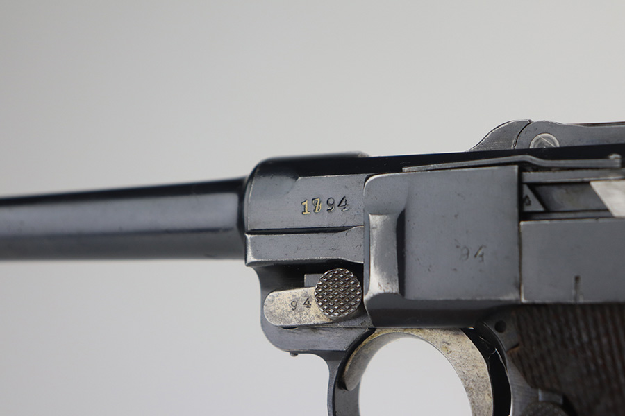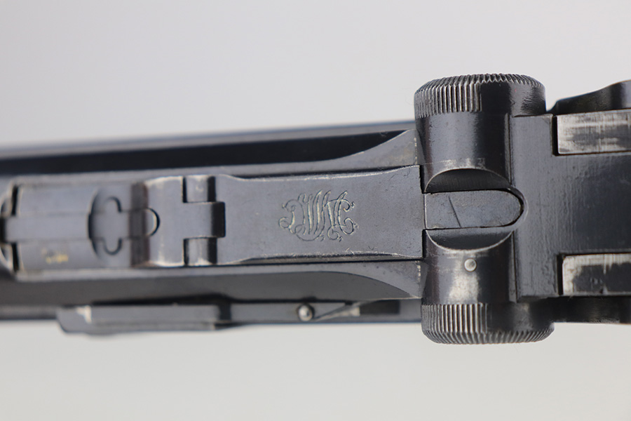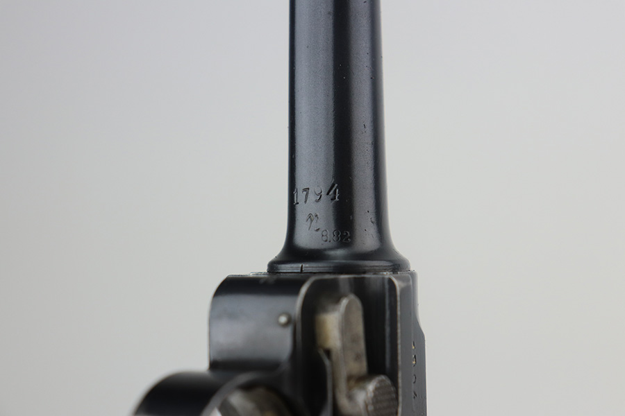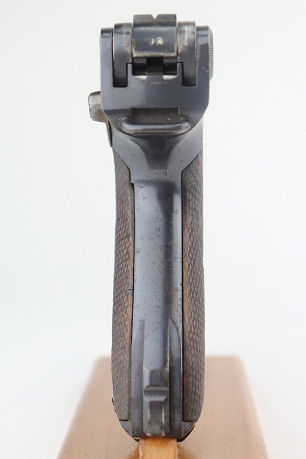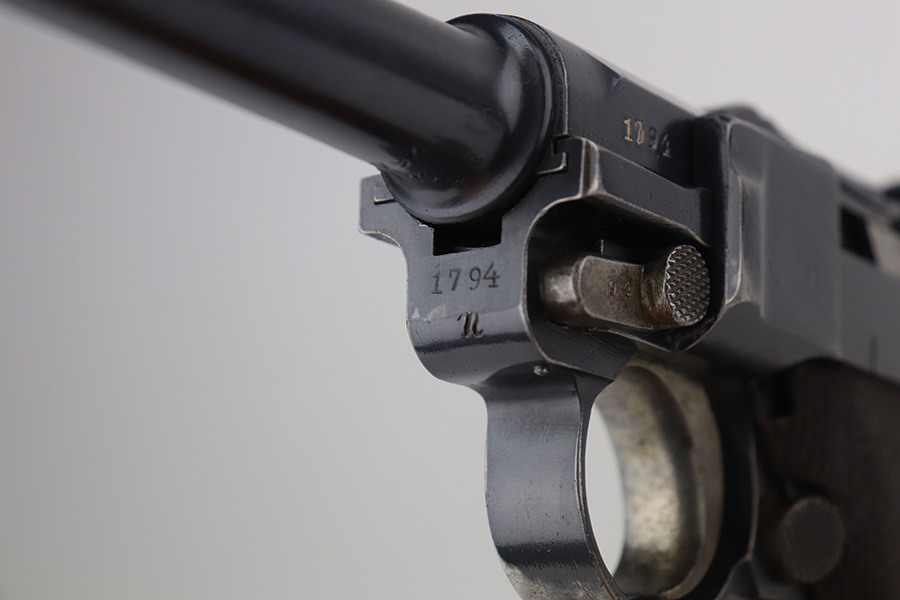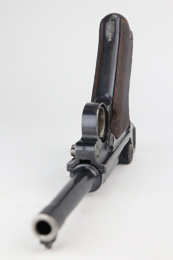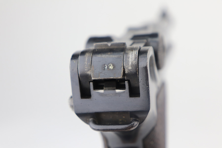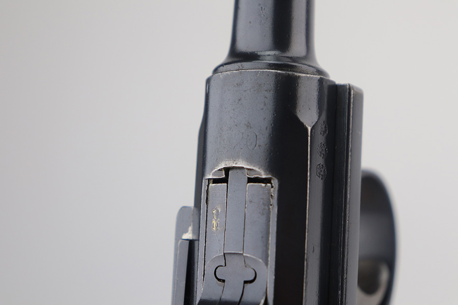6/3/21 – This is an excellent example of a 1920’s commercial Luger rig. During WW2, it was then issued to the Nazi police force, as evidenced by the “1920” rework marking on the chamber, added police sear safety, and police unit marking on the front strap. The unit marking is “S. D. VI. 855.”. From research, we believe this means it could have been issued to the Nazi Kriminal Polezei, or criminal police. The gun is matching and comes with an un-numbered WW2-era magazine, a matching-numbered tool (looks like it was re-numbered), and a matching-numbered 1916-dated police style Luger holster. The gun has retained about 97% of its original finish. There is very minor wear on the underside of the trigger guard, on the side plate, side rails, and around the muzzle. Spotty oxidation and freckling on the straps. Very minor pin-pricking on the chamber. Comes with slightly worn un-numbered grips. Excellent bore – shiny with strong rifling.