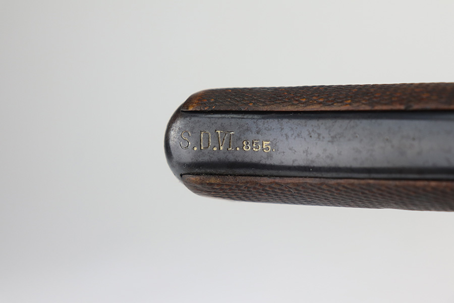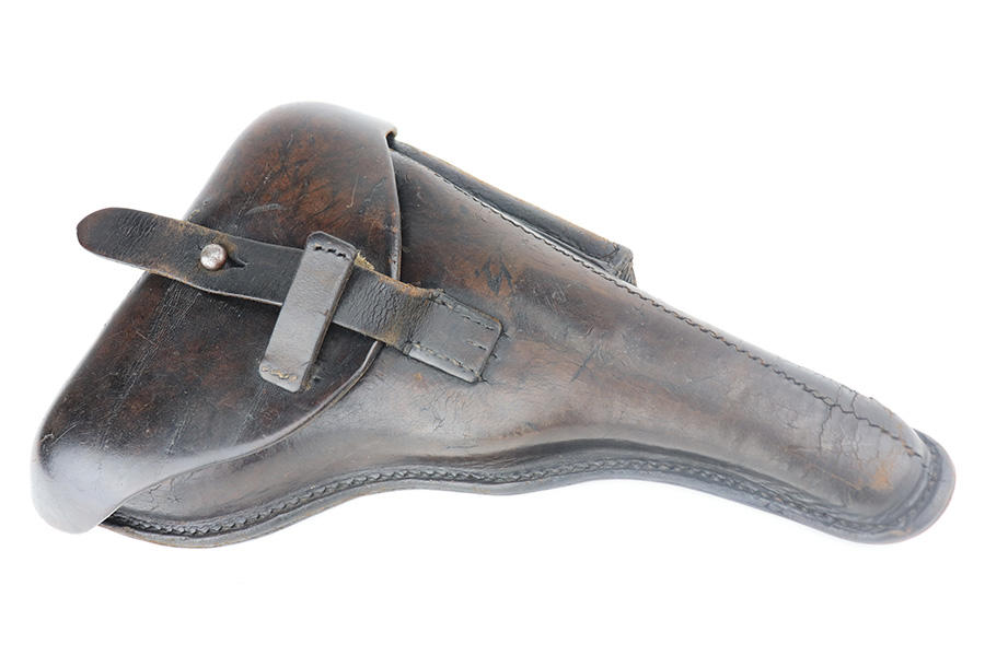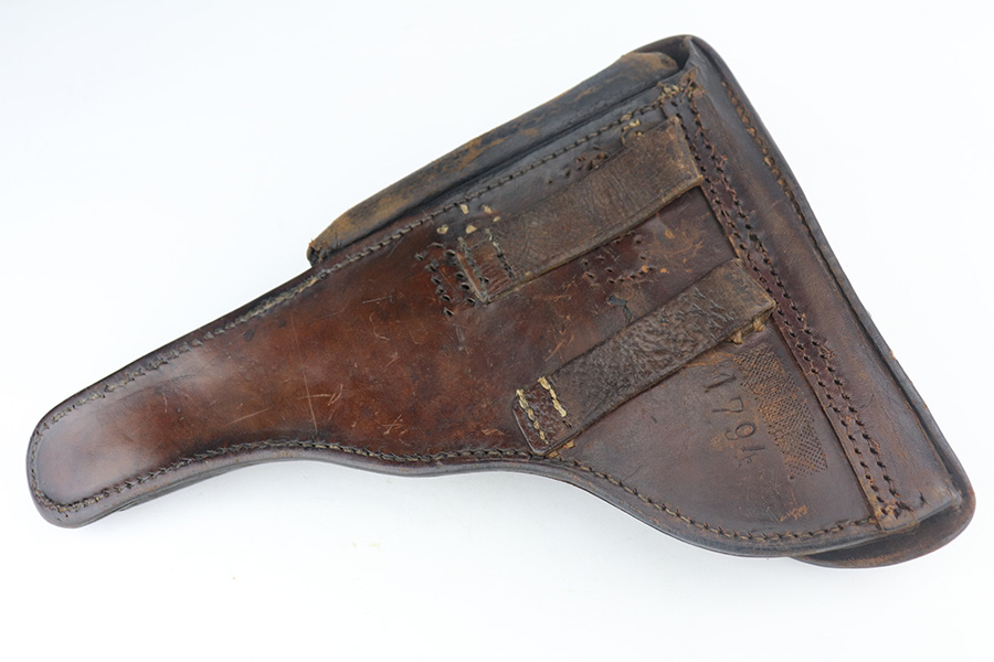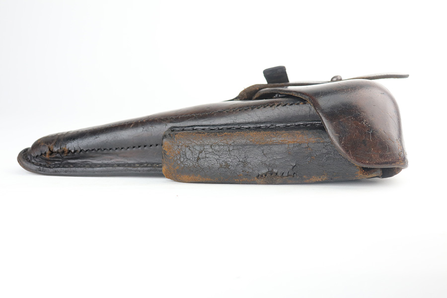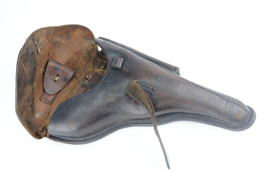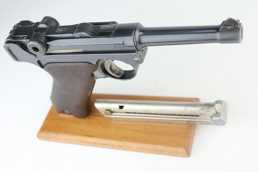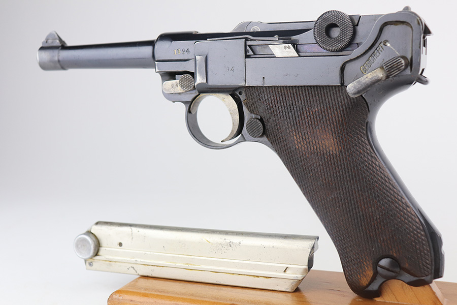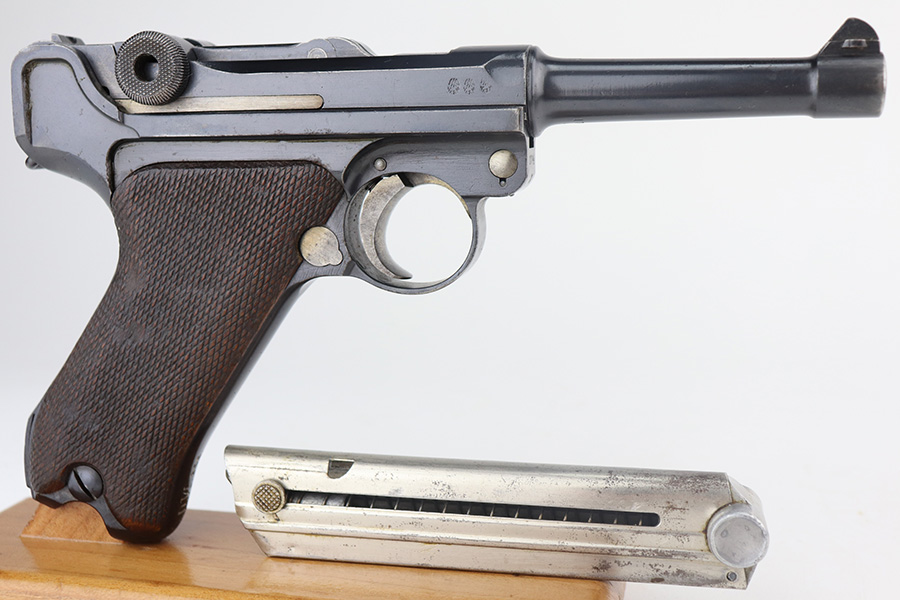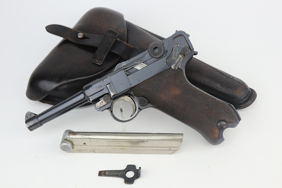 6/3/21 – This is an excellent example of a 1920’s commercial Luger rig. During WW2, it was then issued to the Nazi police force, as evidenced by the “1920” rework marking on the chamber, added police sear safety, and police unit marking on the front strap. The unit marking is “S. D. VI. 855.”. From research, we believe this means it could have been issued to the Nazi Kriminal Polezei, or criminal police. The gun is matching and comes with an un-numbered WW2-era magazine, a matching-numbered tool (looks like it was re-numbered), and a matching-numbered 1916-dated police style Luger holster. The gun has retained about 97% of its original finish. There is very minor wear on the underside of the trigger guard, on the side plate, side rails, and around the muzzle. Spotty oxidation and freckling on the straps. Very minor pin-pricking on the chamber. Comes with slightly worn un-numbered grips. Excellent bore – shiny with strong rifling.