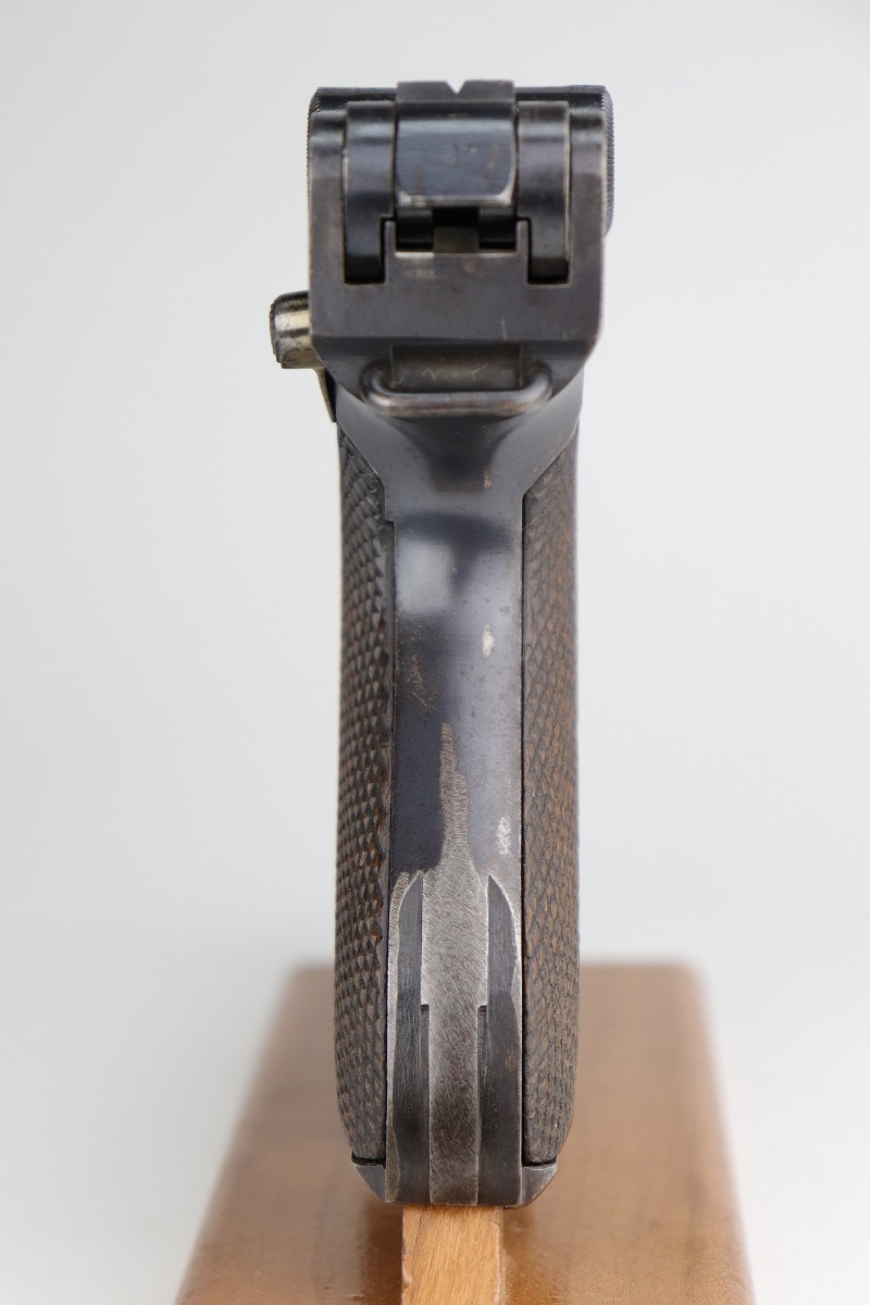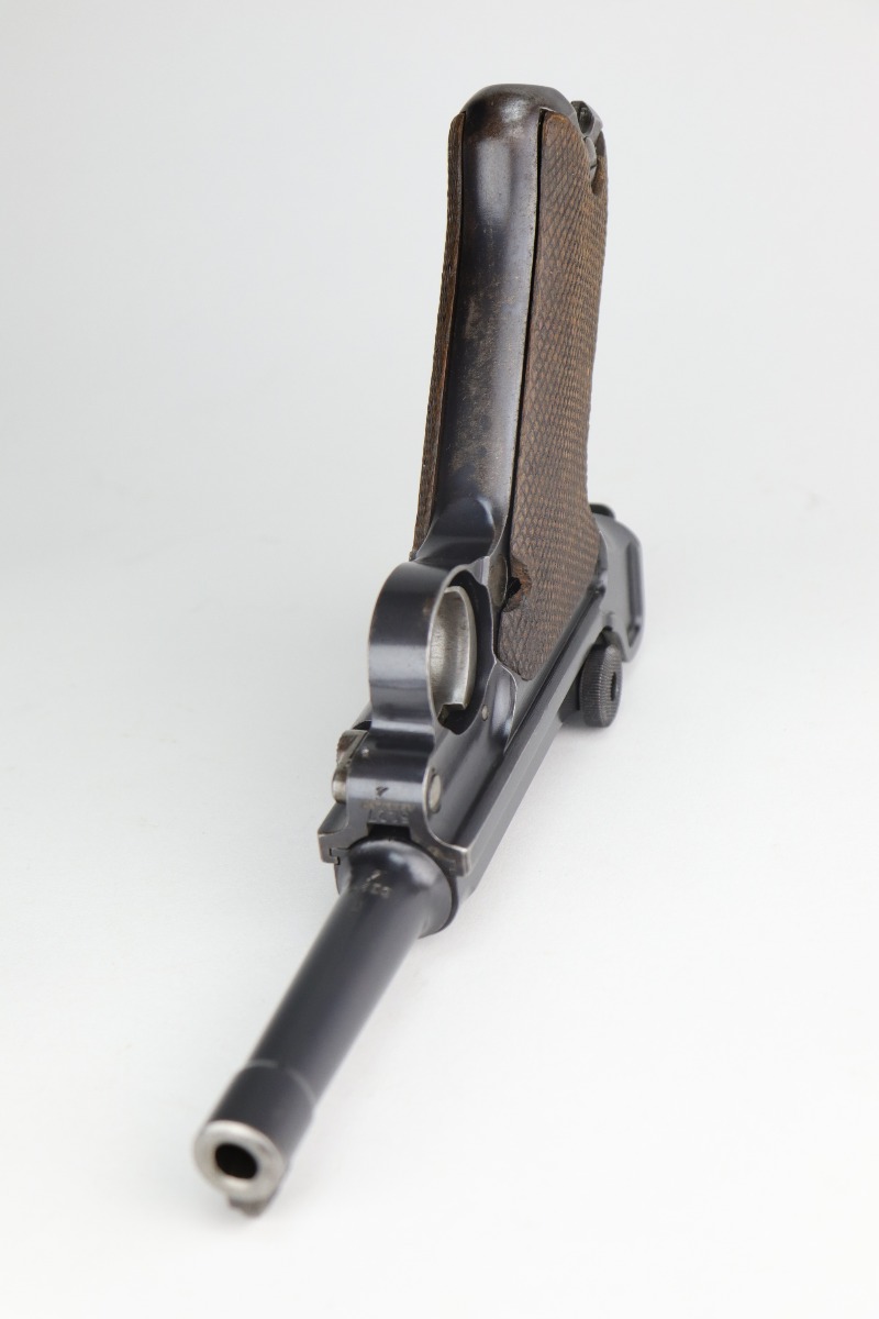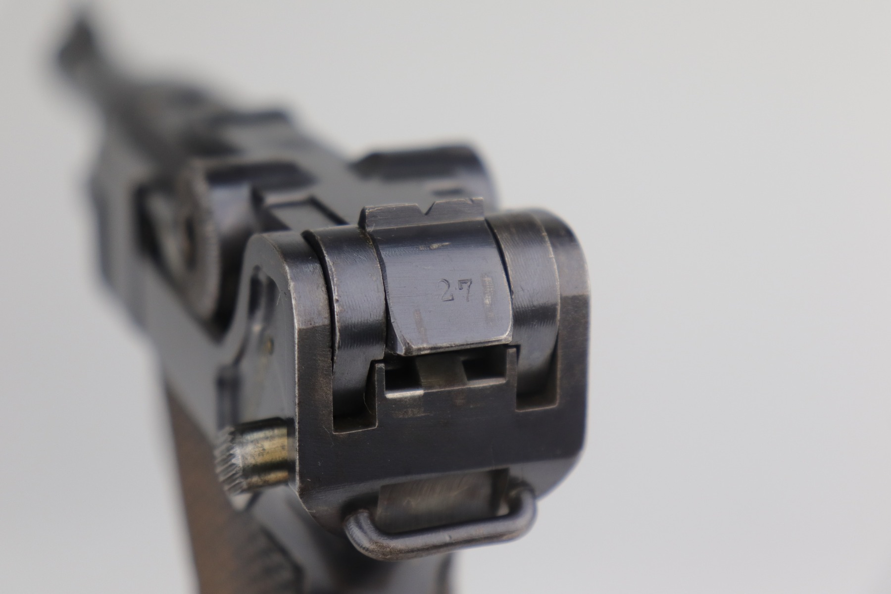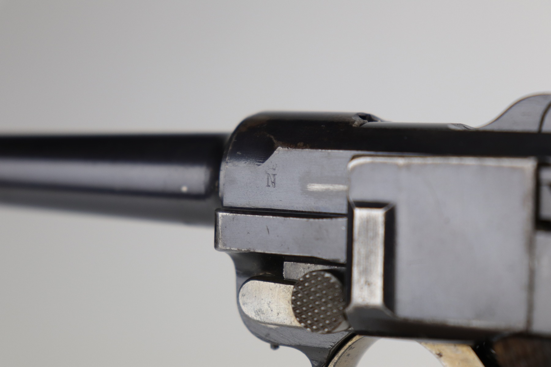 12/31/20 – This is a nice example of a commercial 1920’s DWM Luger. The “Germany” export mark on the front strap indicates it was sold in the international commercial market. This one is all matching and has “Crown N” proofs. It has retained somewhere between 85-90% of its original finish. There is wear around the muzzle, side plate, high edges of the frame, and spotty wear on both straps. A couple of dots of discoloration on the chamber. There are areas of oxidation most noticeable on the straps. The stock lug has been ground down. It comes with a numbered wood bottom magazine. The bore is excellent – shiny with strong rifling.