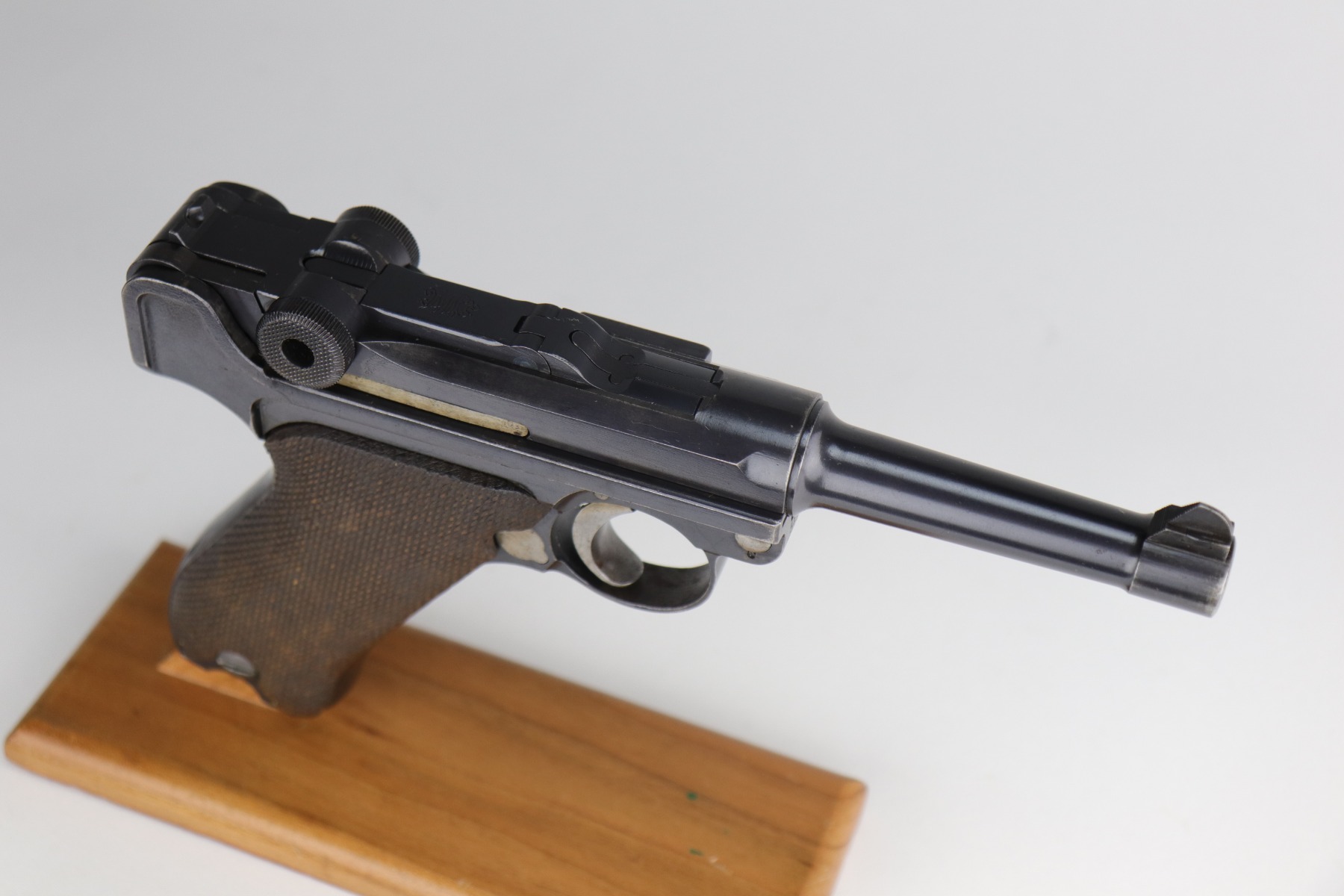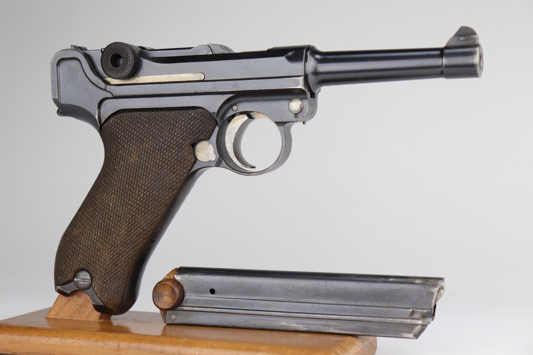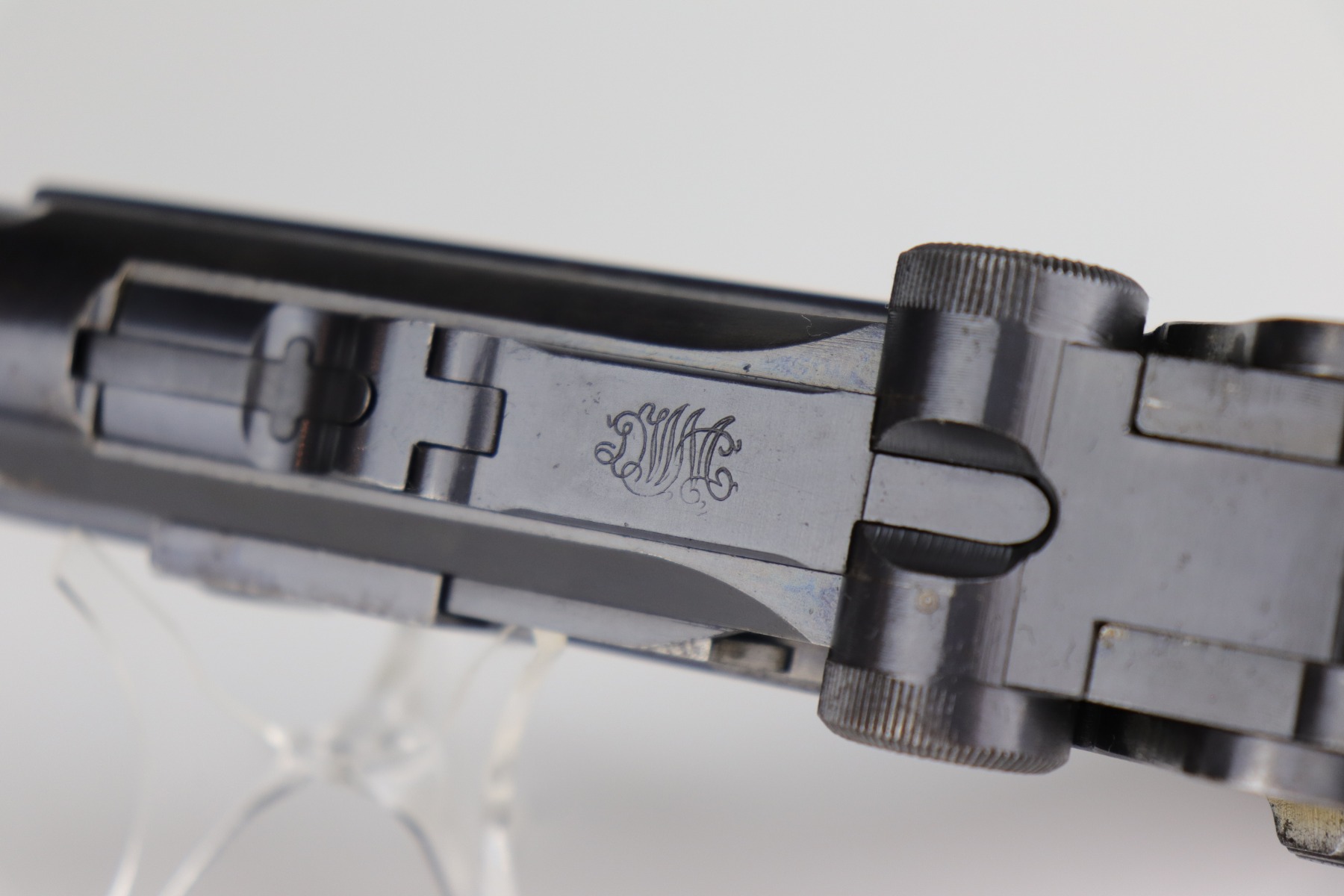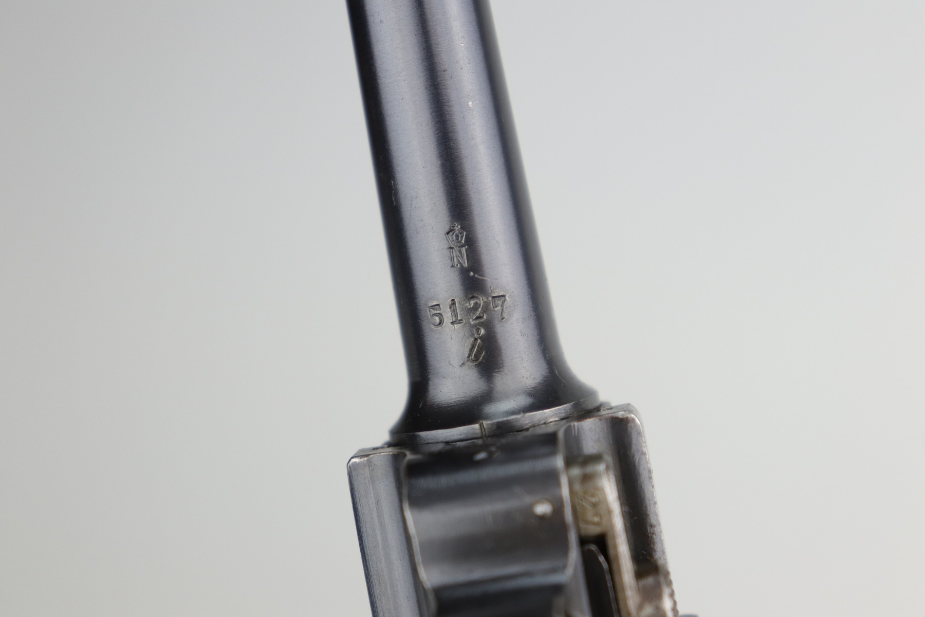 12/31/20 – This is a nice example of a commercial 1920’s DWM Luger. The “Germany” export mark on the front strap indicates it was sold in the international commercial market. This one is all matching and has “Crown N” proofs. It has retained somewhere between 85-90% of its original finish. There is wear around the muzzle, side plate, high edges of the frame, and spotty wear on both straps. A couple of dots of discoloration on the chamber. There are areas of oxidation most noticeable on the straps. The stock lug has been ground down. It comes with a numbered wood bottom magazine. The bore is excellent – shiny with strong rifling.