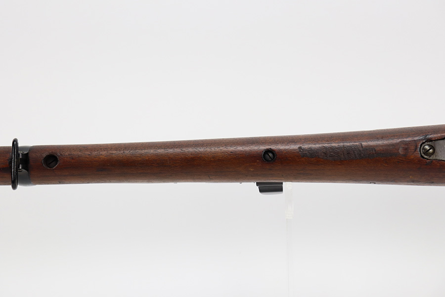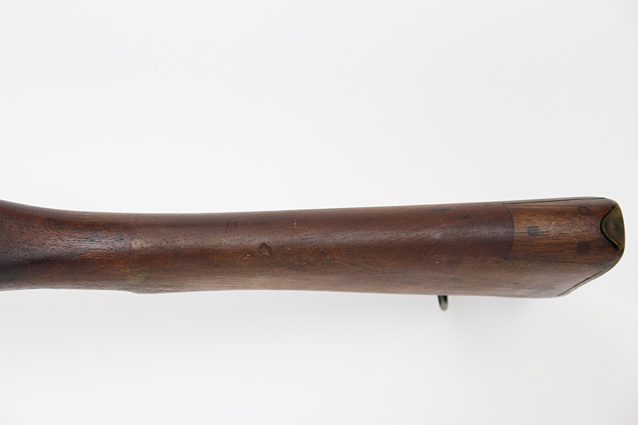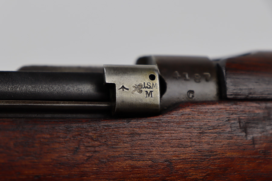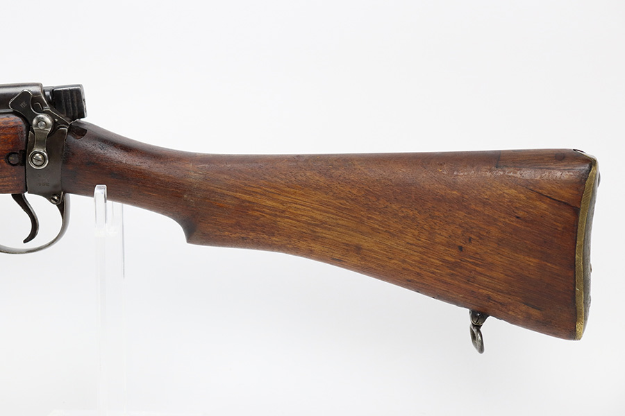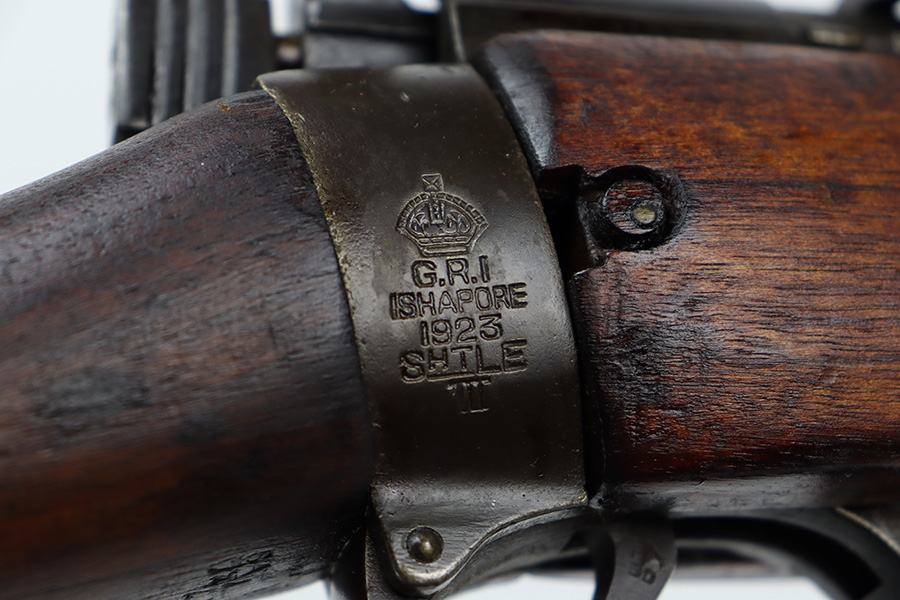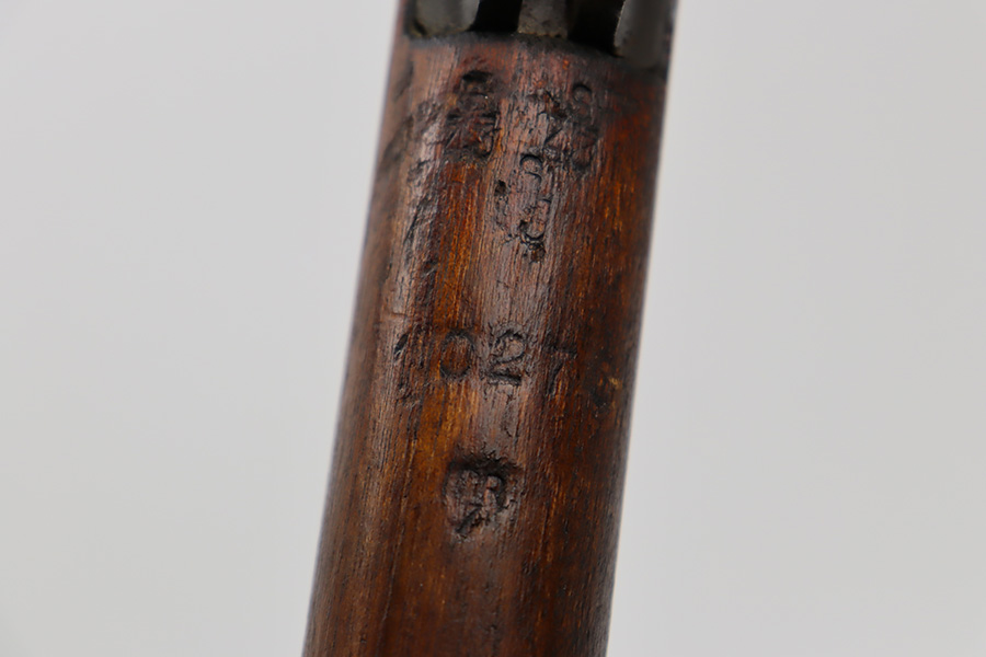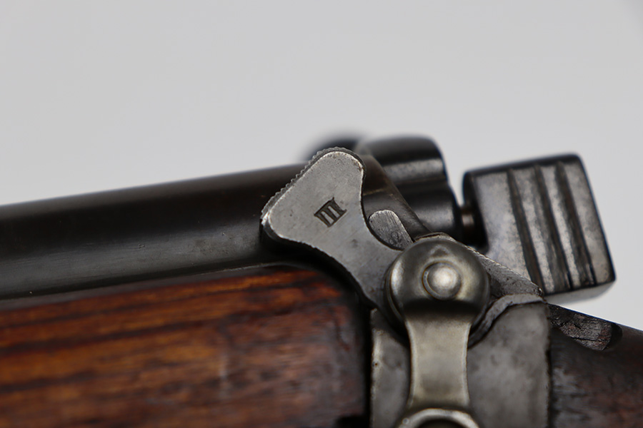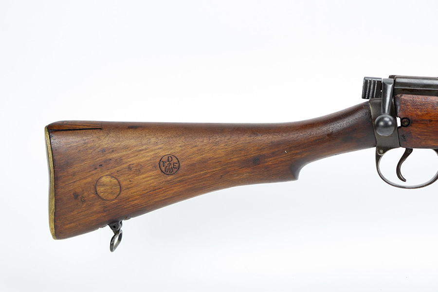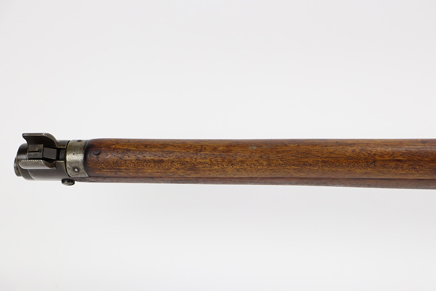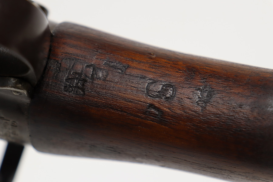 6/16/23 – This gun started its life in 1923, when it was manufactured by Ishapore as an SHTLE III. In 1932, it was converted to a .410 riot shotgun configuration. The conversion to .410 included giving it a smooth bore and securing a wooden block in the magazine well. These shotguns were issued to police units, jail guards & riot police. The gun is mismatched and has RFI markings throughout. The metal parts have retained roughly 75% of their finish. Generally, there is wear around the high edges and around the muzzle. Light brown patina throughout. Excellent wood stock. Excellent, shiny smooth bore.