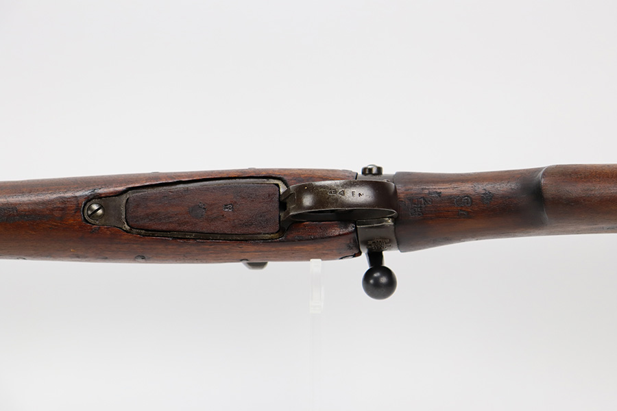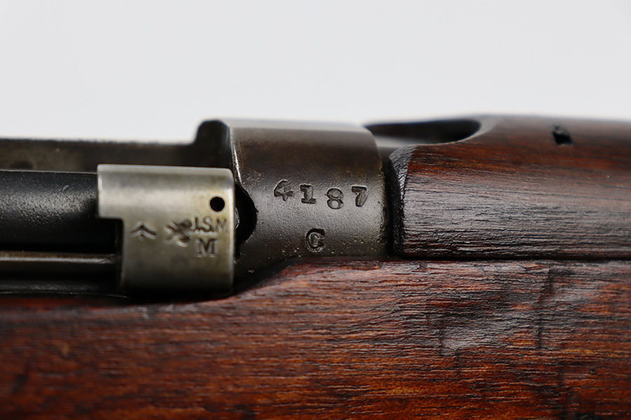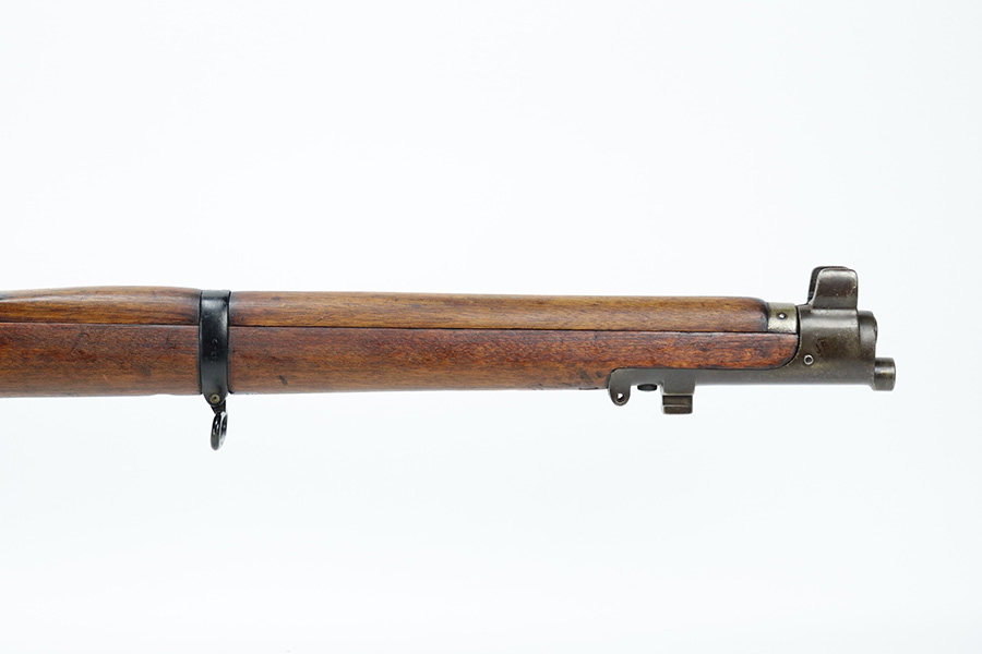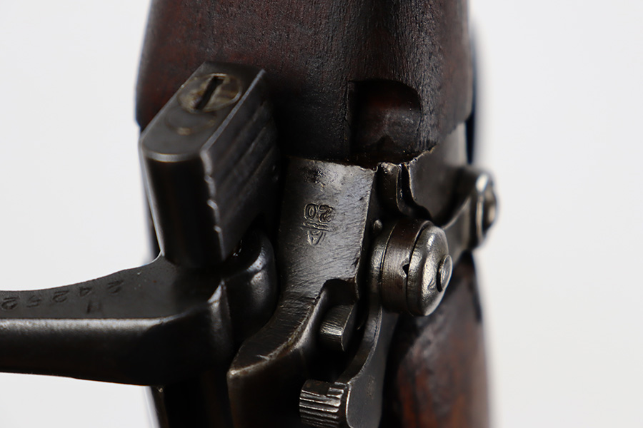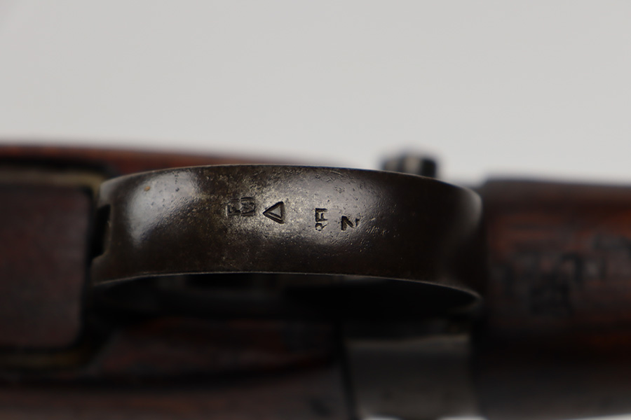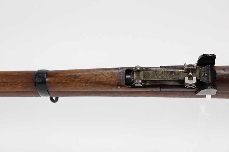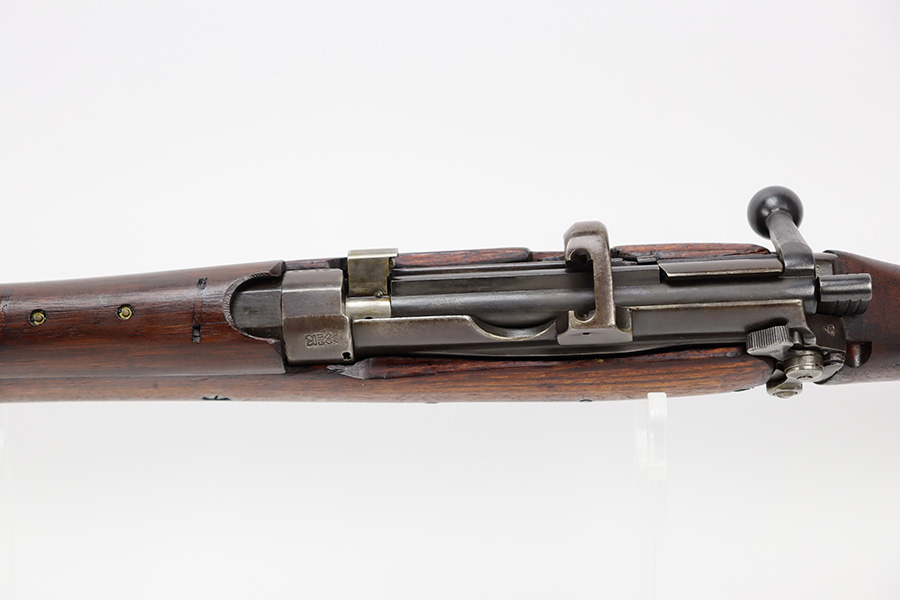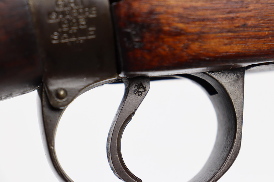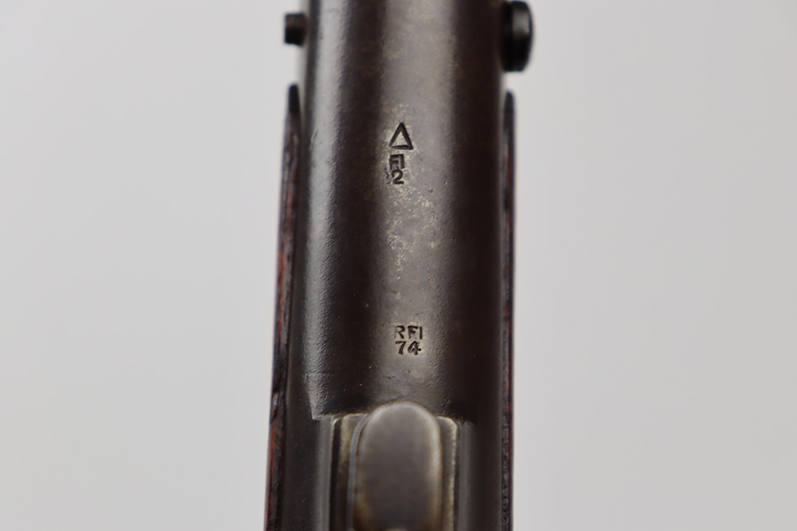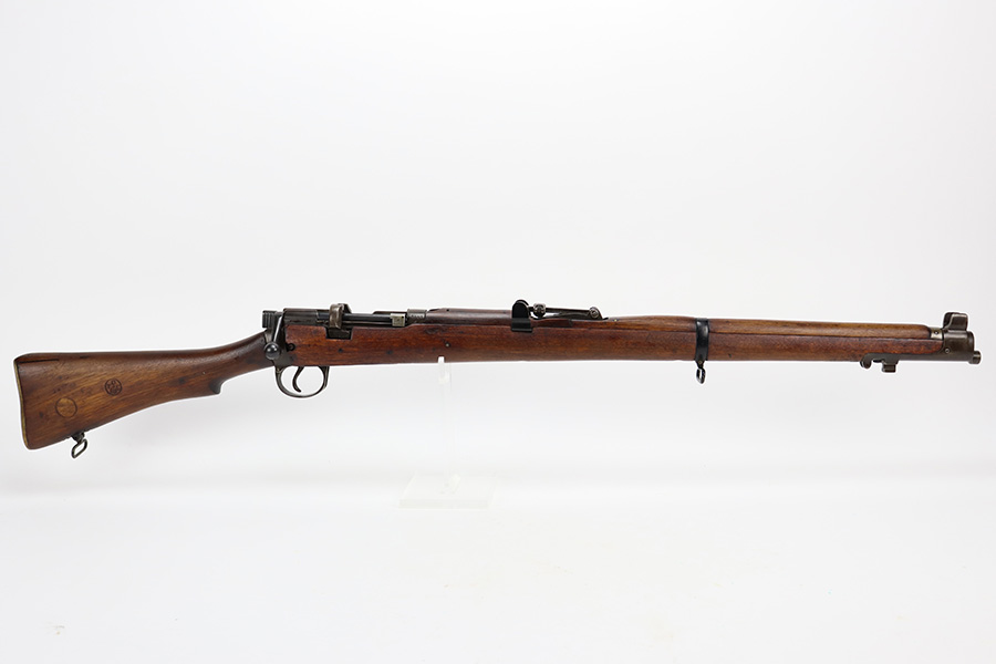 6/16/23 – This gun started its life in 1923, when it was manufactured by Ishapore as an SHTLE III. In 1932, it was converted to a .410 riot shotgun configuration. The conversion to .410 included giving it a smooth bore and securing a wooden block in the magazine well. These shotguns were issued to police units, jail guards & riot police. The gun is mismatched and has RFI markings throughout. The metal parts have retained roughly 75% of their finish. Generally, there is wear around the high edges and around the muzzle. Light brown patina throughout. Excellent wood stock. Excellent, shiny smooth bore.