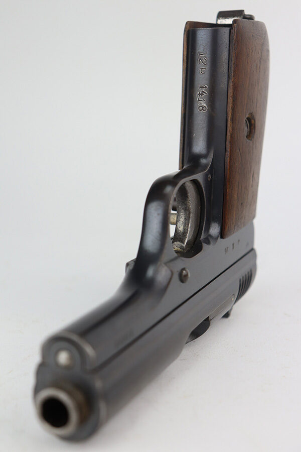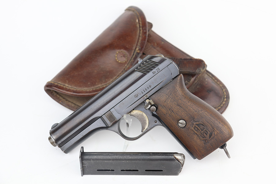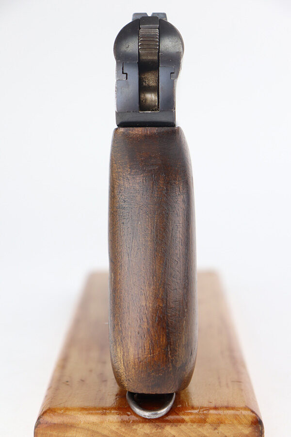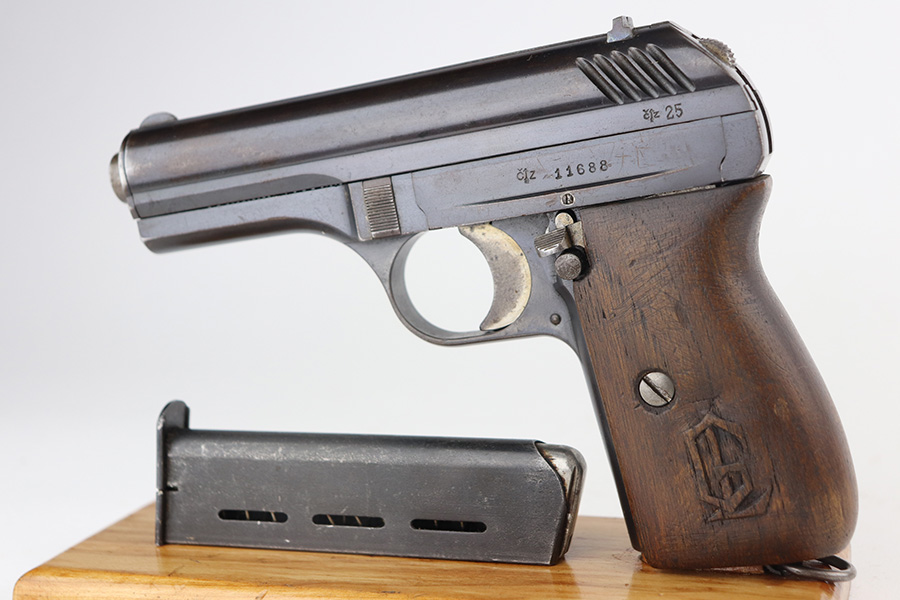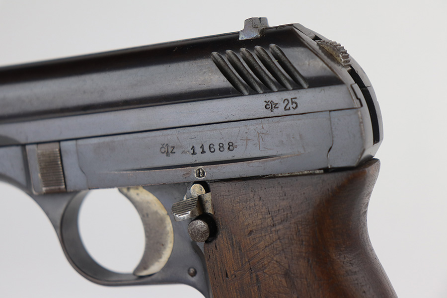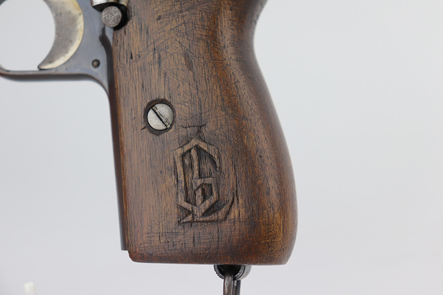 6/21/21 – This is a very nice example of a CZ vz 24 rig issued to the Czech military in 1926. The gun is all matching, has the proper Czech lion proofs, and has a “12P 1418” infantry marking on the front strap. Comes with a nice period-correct holster and a period-correct magazine that was numbered on the bottom, but the numbering was crossed out. The gun has retained roughly 85% of its original finish. There is spotty wear on the front strap and along the round edges of the slide. Spotty patina along the slide and well. Some light scratches on the left side of the frame. Comes with a very nice custom-engraved wood grip. The bore is excellent – shiny with strong rifling.