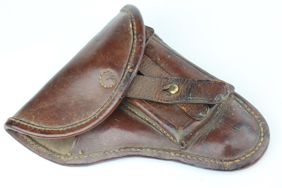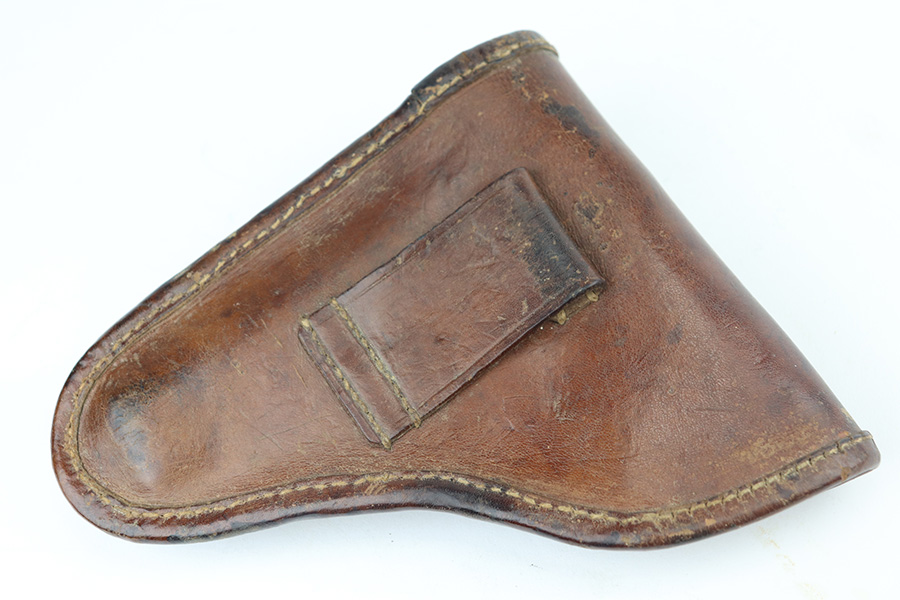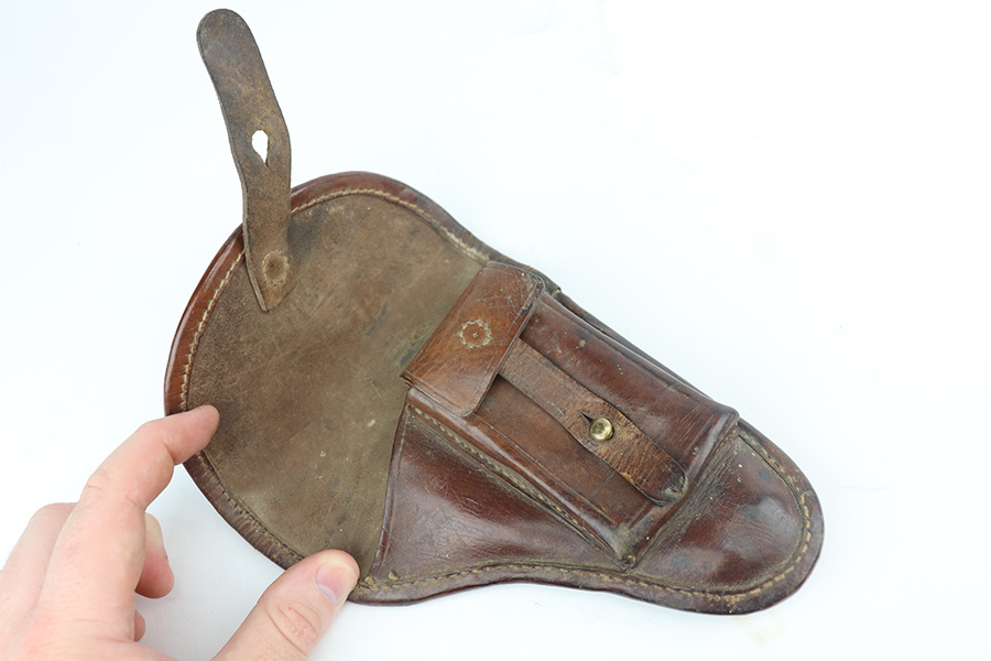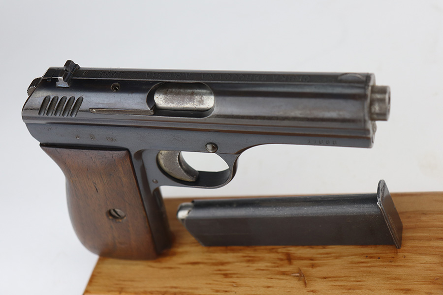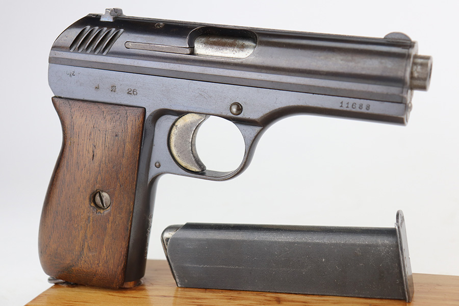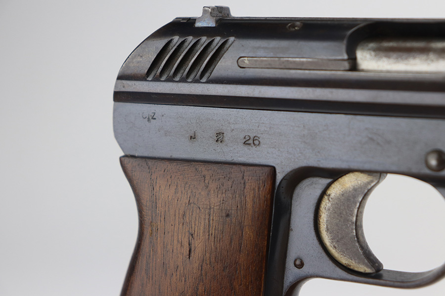 6/21/21 – This is a very nice example of a CZ vz 24 rig issued to the Czech military in 1926. The gun is all matching, has the proper Czech lion proofs, and has a “12P 1418” infantry marking on the front strap. Comes with a nice period-correct holster and a period-correct magazine that was numbered on the bottom, but the numbering was crossed out. The gun has retained roughly 85% of its original finish. There is spotty wear on the front strap and along the round edges of the slide. Spotty patina along the slide and well. Some light scratches on the left side of the frame. Comes with a very nice custom-engraved wood grip. The bore is excellent – shiny with strong rifling.
