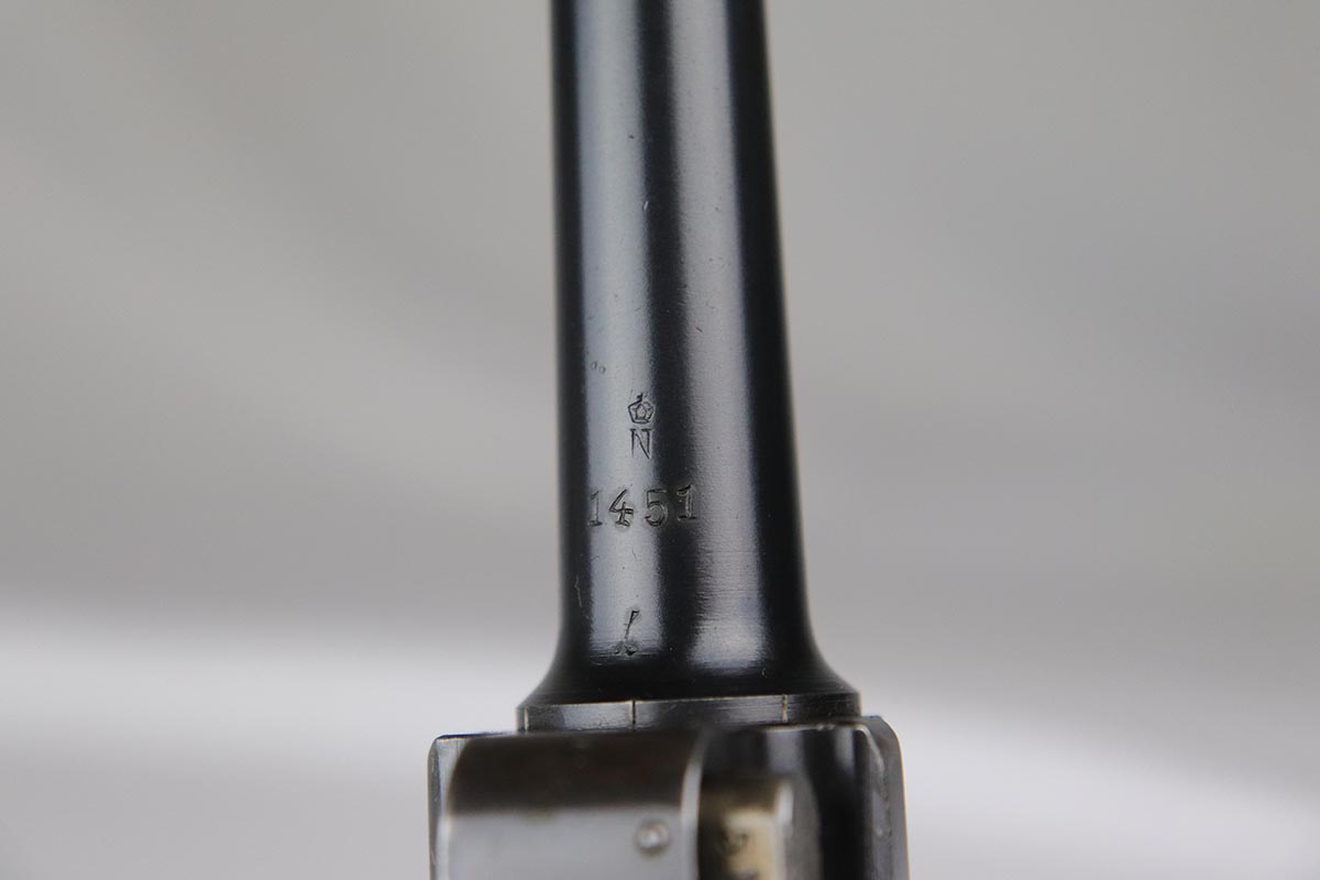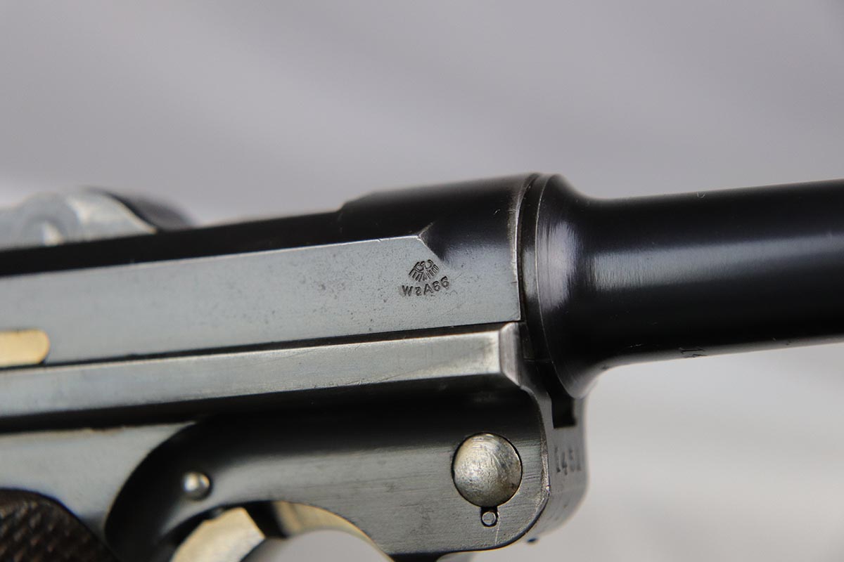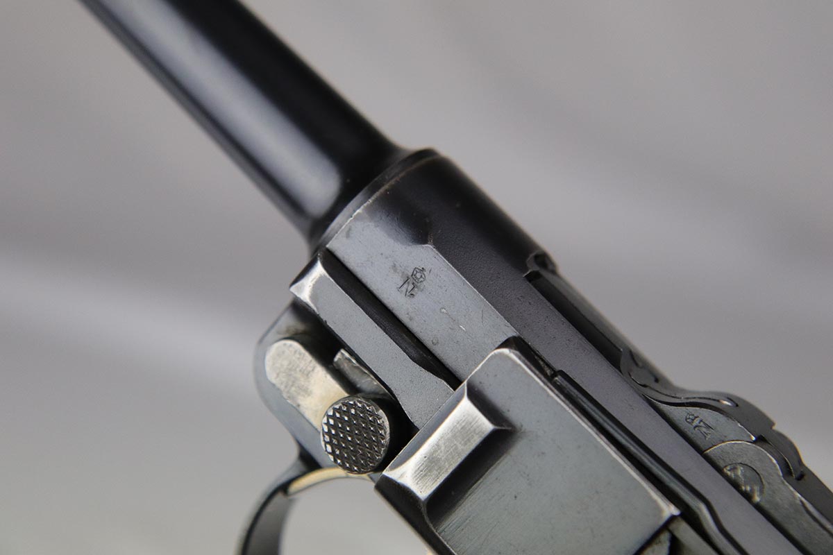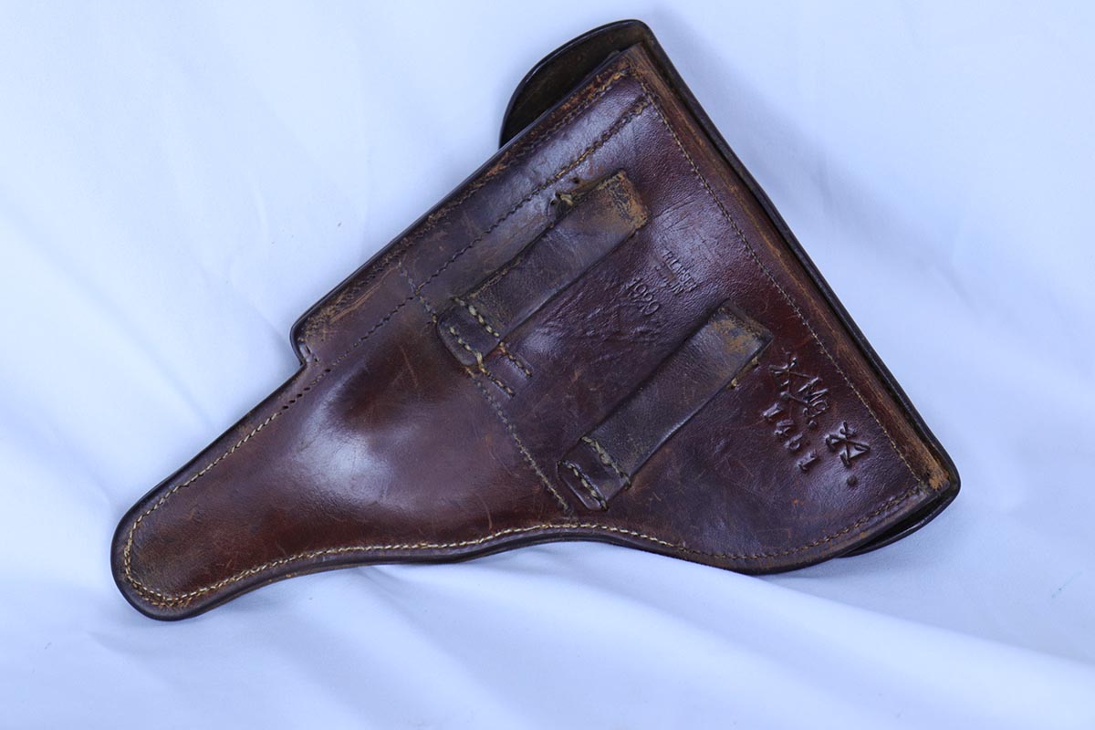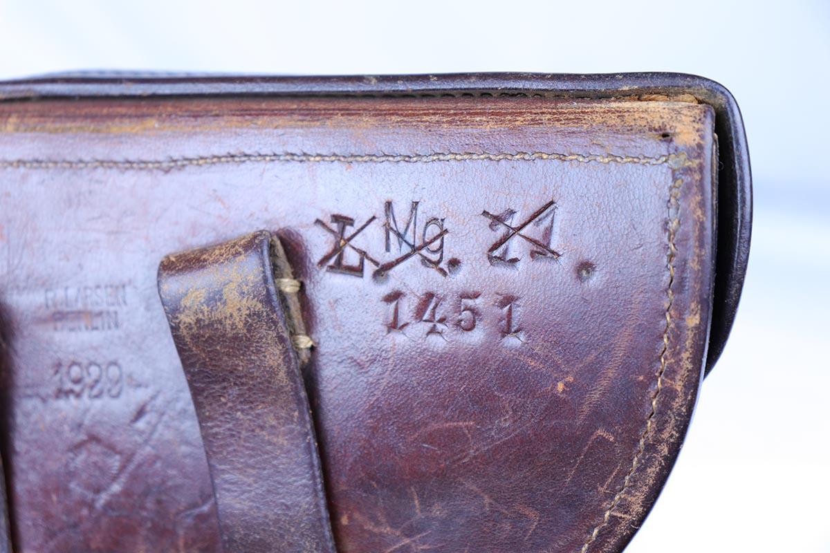 4/3/18 – This is an interesting luger that started out as a 1929 DWM commercial luger. It has no chamber date and Crown/N proofs on the receiver and barrel. At some point, instead of going to the commercial market, it went to the police. The L. Mg. 11 marking means Landjagerei Magdeburg pistol #11. This unit marking is on the front strap, the magazine and the holster. In the process of issuing to the police it must have been re-worked as the gun has the police altered sear safety as well as the additional grip safety on the upper left grip. The gun is all matching including all small parts, the magazine (numbered in the police style), AND the holster. The grips are not numbered probably because it started out as a commercial gun and there is the typical small chip in the grip under the safety lever. The original finish rates about 90-92% with high edge wear and a thin front strap. The bore is still shiny with strong rifling. Finally, the gun has Nazi era re- work proofs. There is a droop wing eagle WaA66 on the right of the receiver. The gun comes with a police style holster which has the same MG.11 Unit mark and serial numbered to match the gun. It is very rare to see the gun and original holster all matching like this. The holster is also dated 1929.