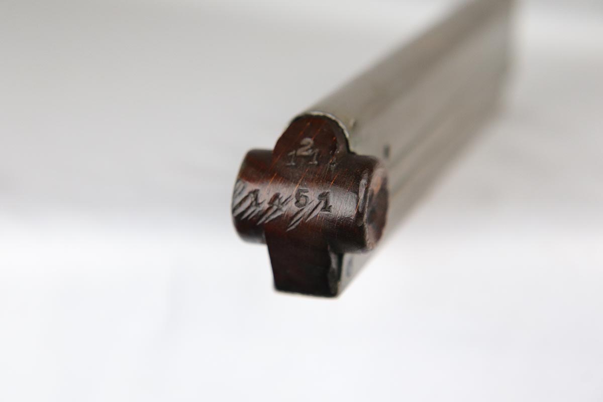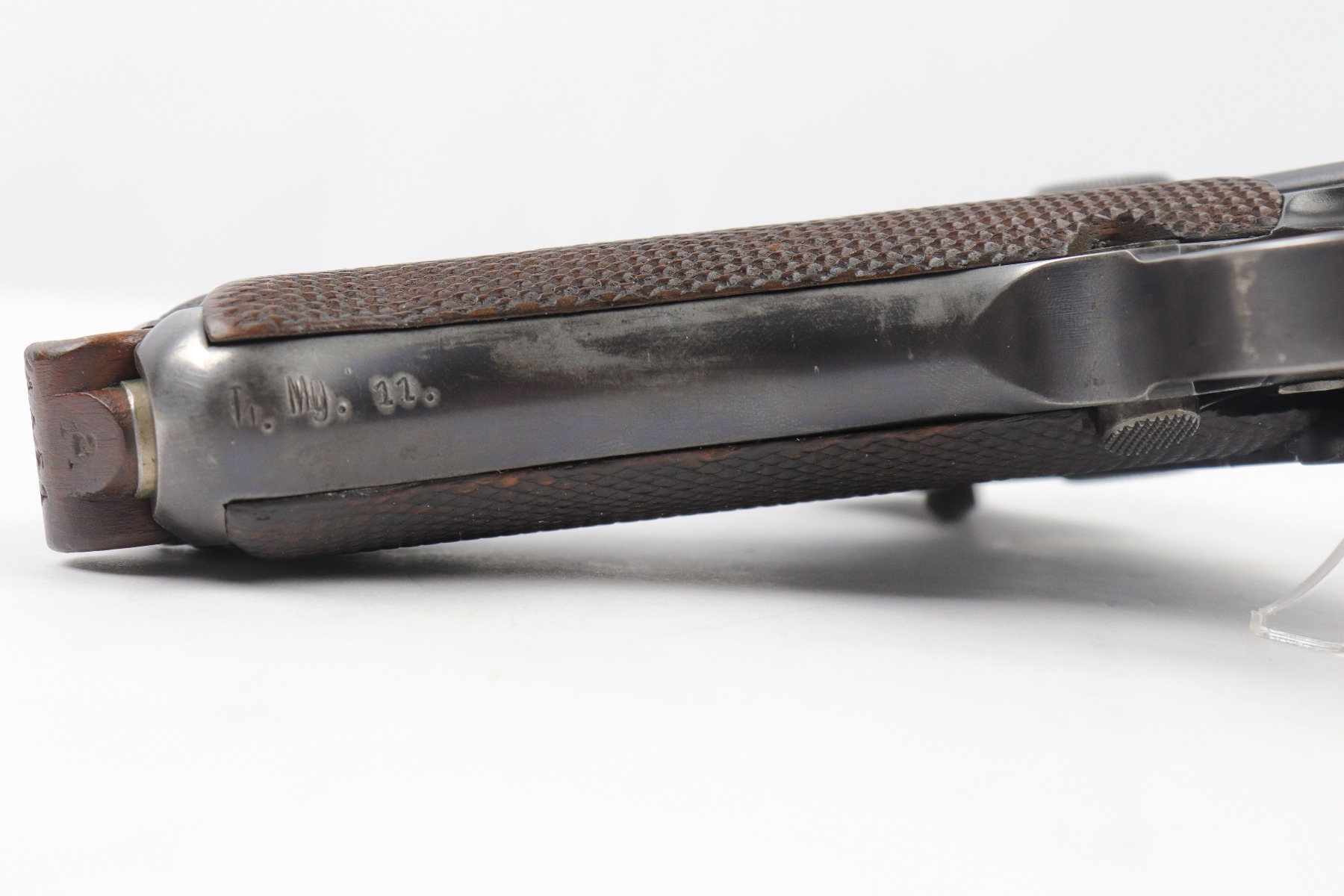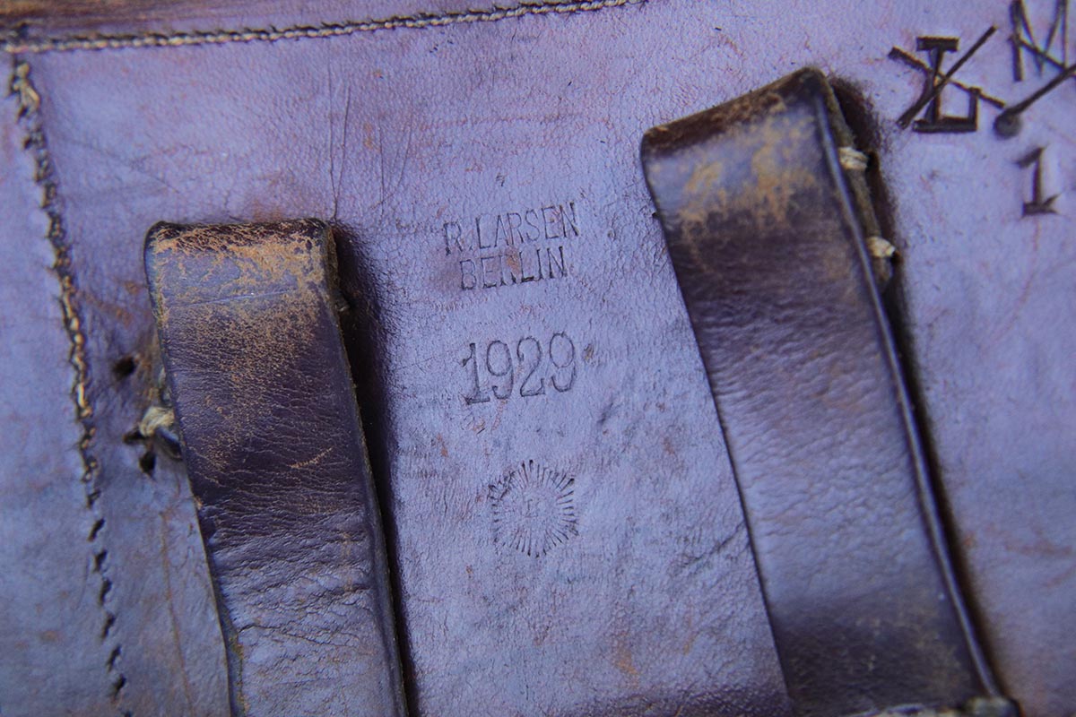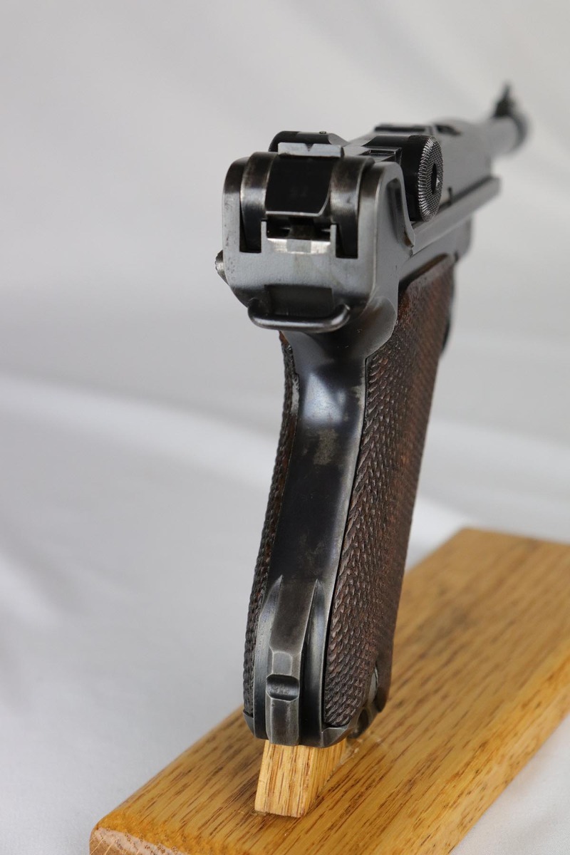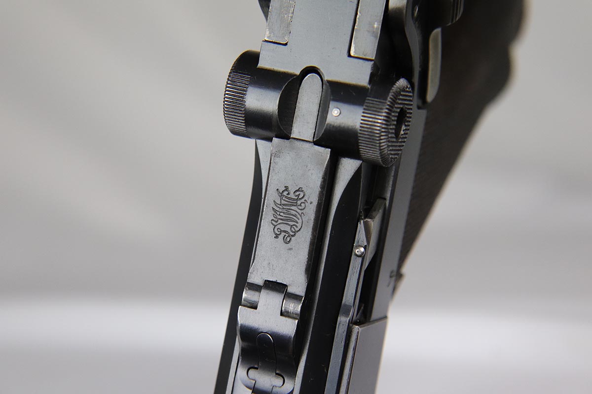 4/3/18 – This is an interesting luger that started out as a 1929 DWM commercial luger. It has no chamber date and Crown/N proofs on the receiver and barrel. At some point, instead of going to the commercial market, it went to the police. The L. Mg. 11 marking means Landjagerei Magdeburg pistol #11. This unit marking is on the front strap, the magazine and the holster. In the process of issuing to the police it must have been re-worked as the gun has the police altered sear safety as well as the additional grip safety on the upper left grip. The gun is all matching including all small parts, the magazine (numbered in the police style), AND the holster. The grips are not numbered probably because it started out as a commercial gun and there is the typical small chip in the grip under the safety lever. The original finish rates about 90-92% with high edge wear and a thin front strap. The bore is still shiny with strong rifling. Finally, the gun has Nazi era re- work proofs. There is a droop wing eagle WaA66 on the right of the receiver. The gun comes with a police style holster which has the same MG.11 Unit mark and serial numbered to match the gun. It is very rare to see the gun and original holster all matching like this. The holster is also dated 1929.