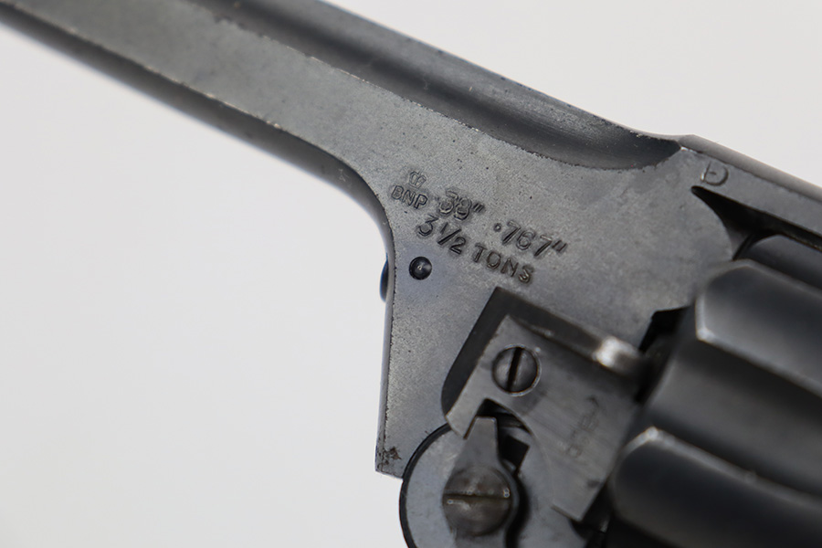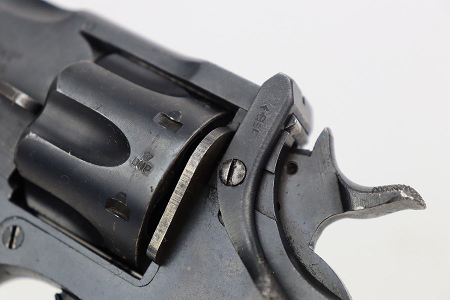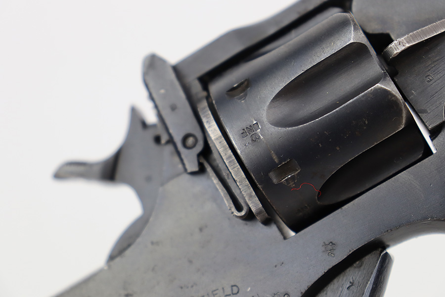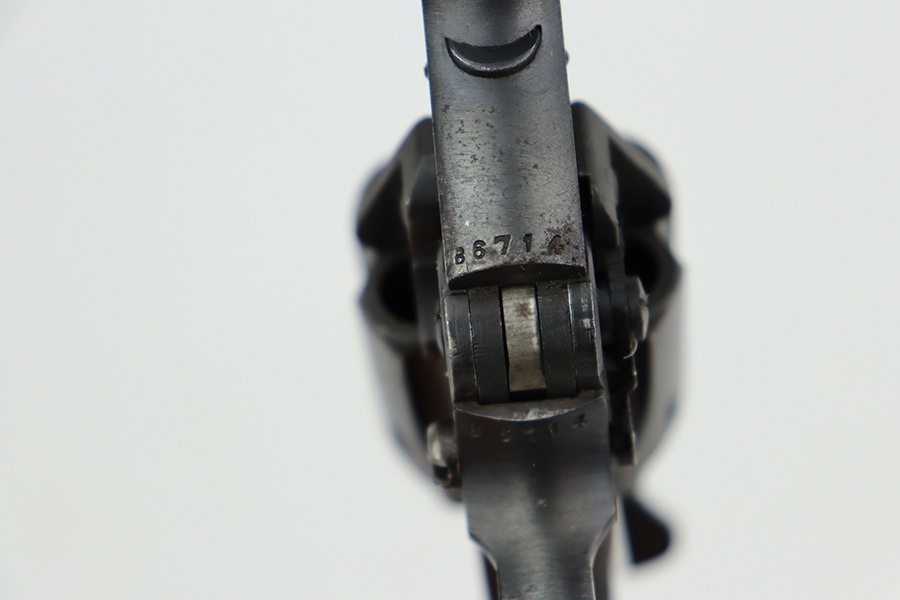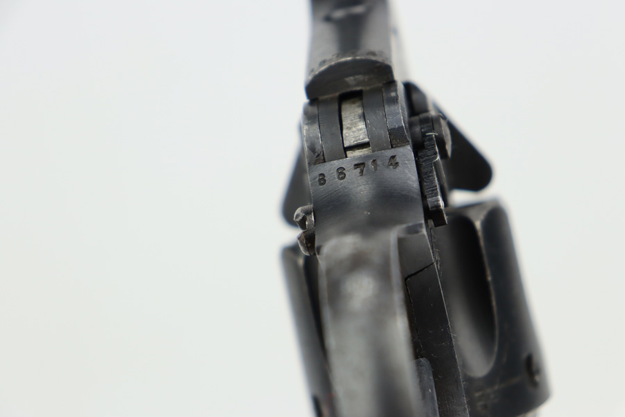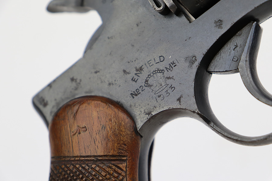 7/28/23 – This is an excellent example of an Enfield No 2 MK 1 revolver issued to the British military in 1933. All matching with the proper British proofs throughout. It has retained about 97% of its finish with just minor wear on the high edges. While there is very little actual finish loss, there are some areas of freckling here and there and some spots of heavy oxidation and a few tiny pits on the front strap and butt of the frame. Fitted with nice checkered wood grips – two notches on the left side. The bore is shiny with strong rifling for the most part, but there is some minor fouling around the cylinder end.