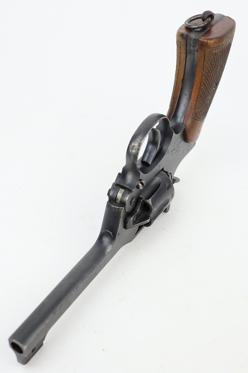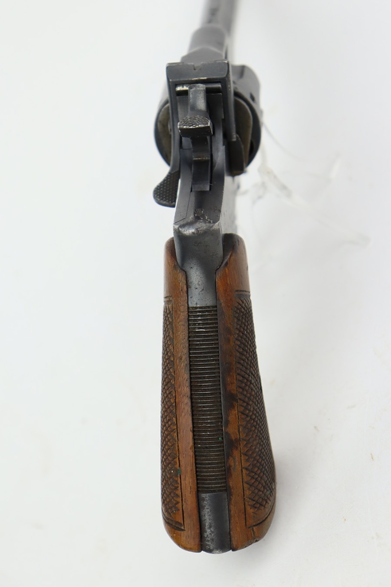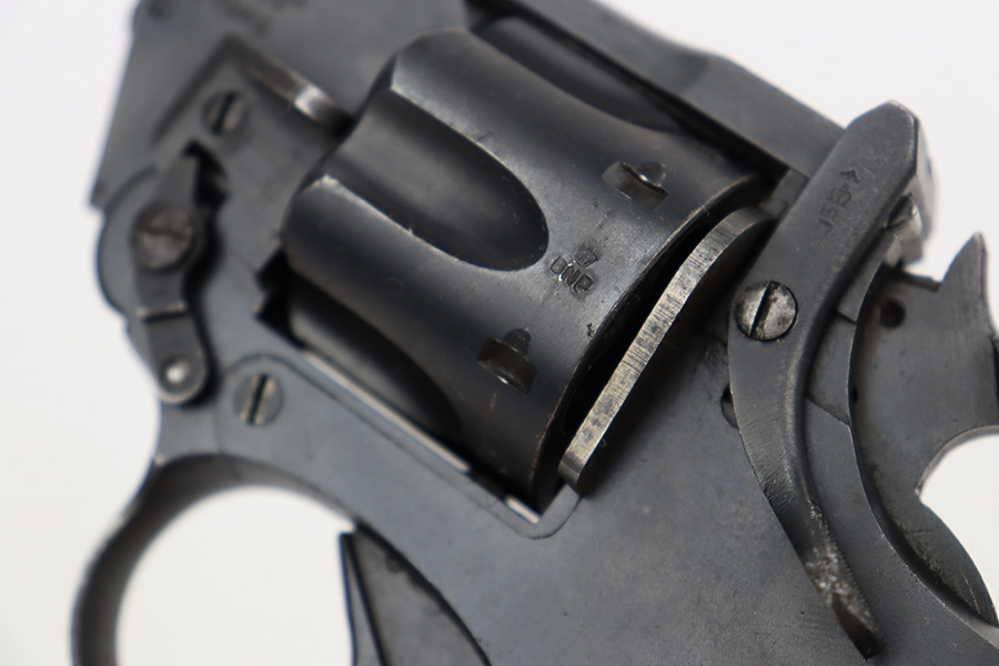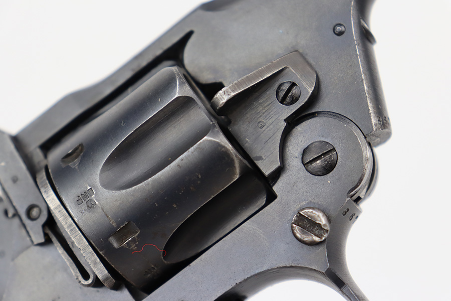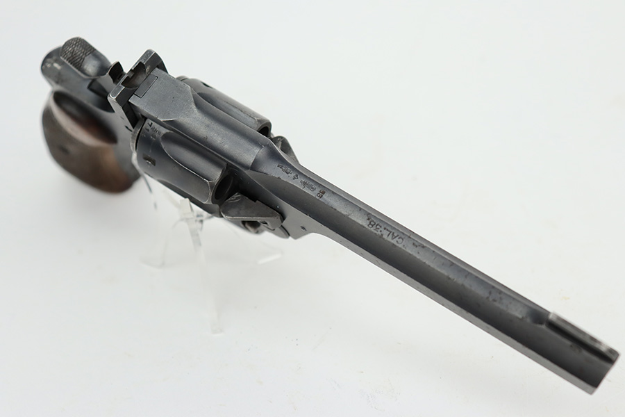 7/28/23 – This is an excellent example of an Enfield No 2 MK 1 revolver issued to the British military in 1933. All matching with the proper British proofs throughout. It has retained about 97% of its finish with just minor wear on the high edges. While there is very little actual finish loss, there are some areas of freckling here and there and some spots of heavy oxidation and a few tiny pits on the front strap and butt of the frame. Fitted with nice checkered wood grips – two notches on the left side. The bore is shiny with strong rifling for the most part, but there is some minor fouling around the cylinder end.