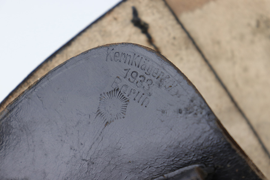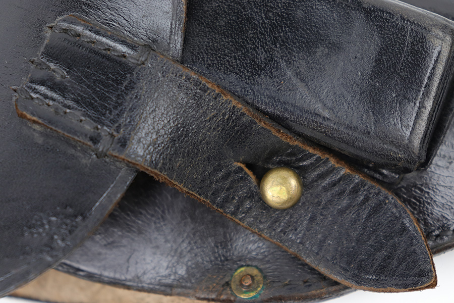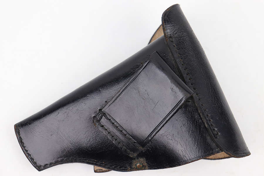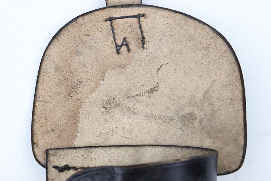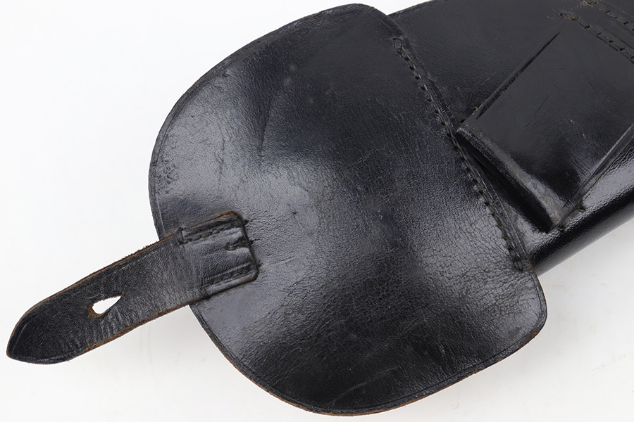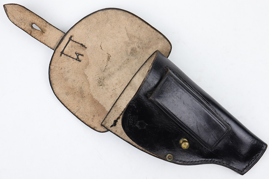 4/7/23 – This is an excellent, unissued condition holster for a Police 6.35mm pistol such as a Sauer Behorden or Mauser model 1910. The holster is maker stamped and dated on the front leather with a sunburst star Police proof stamp. The black leather has some mild surface wrinkling throughout, but is strong with minimal pliability. Clean interior leather and excellent stitching throughout.