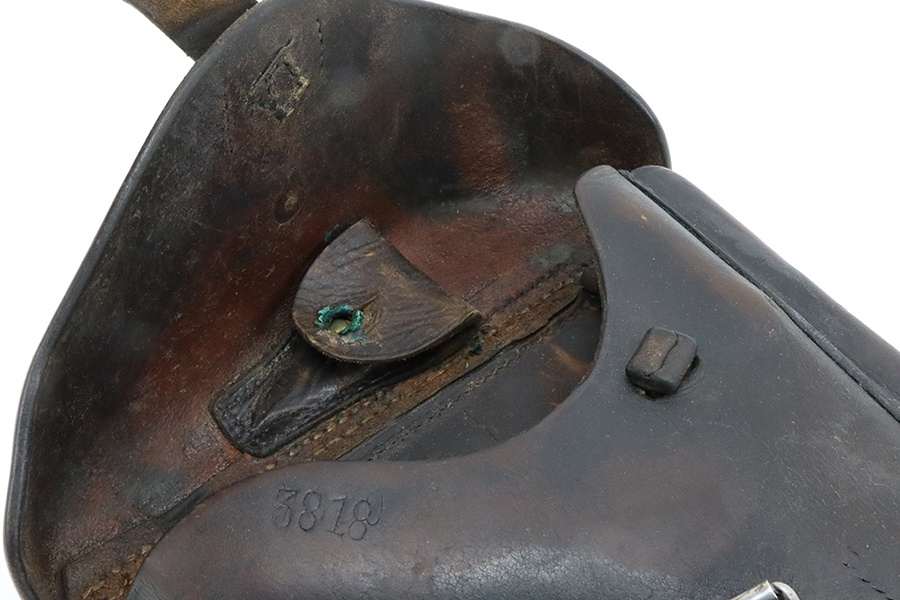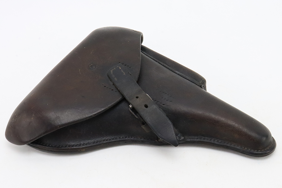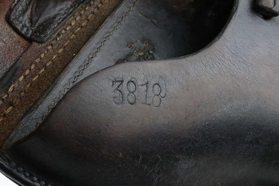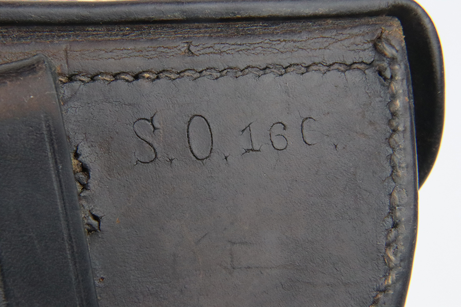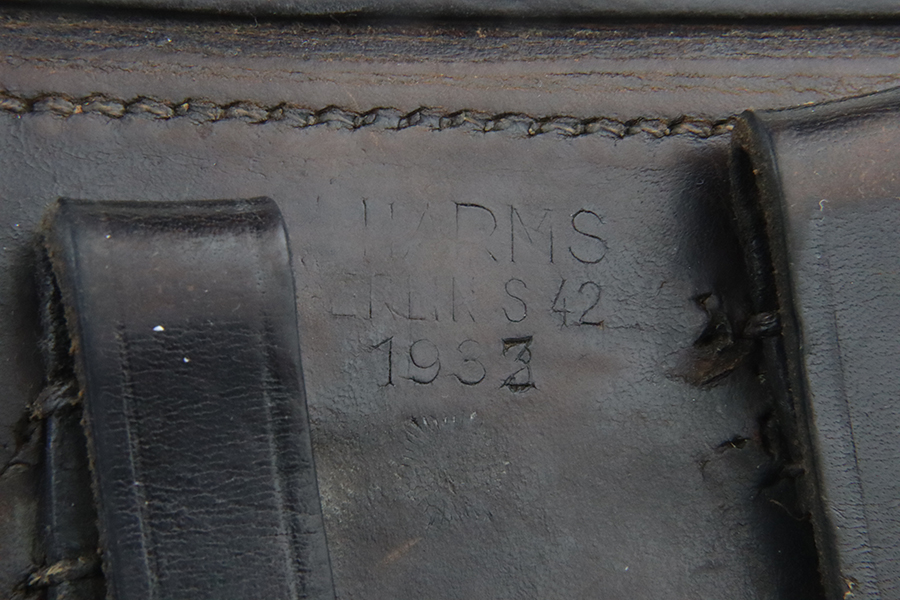 3/19/24 – This is a police Luger holster from 1933 that has been converted to a military configuration (closure strap replaced). It is maker marked, dated 1933, and has two different police unit markings. Nice condition overall, but there are obvious signs of use and wear.