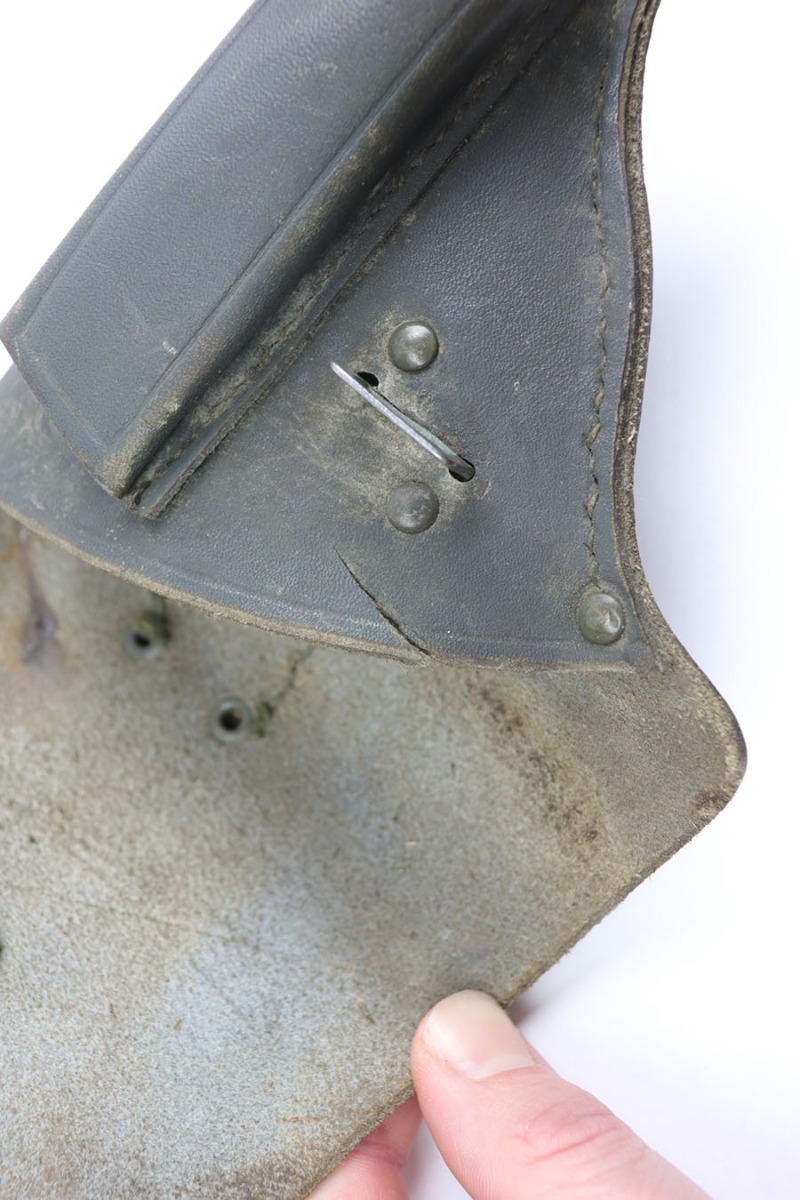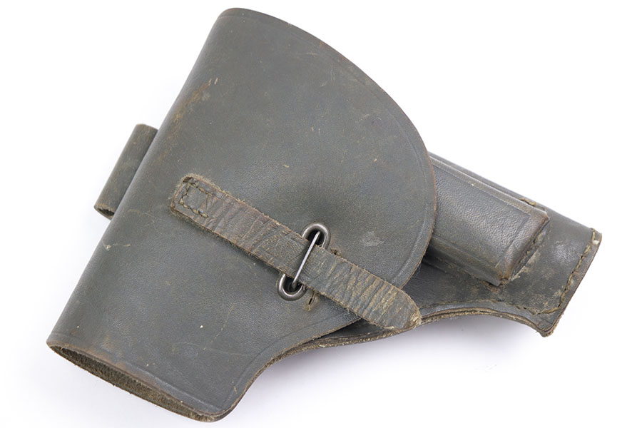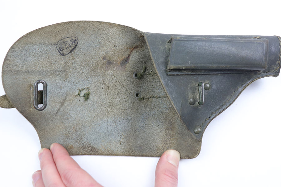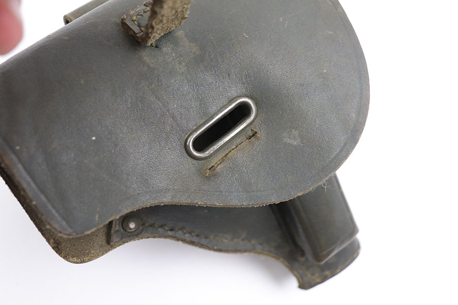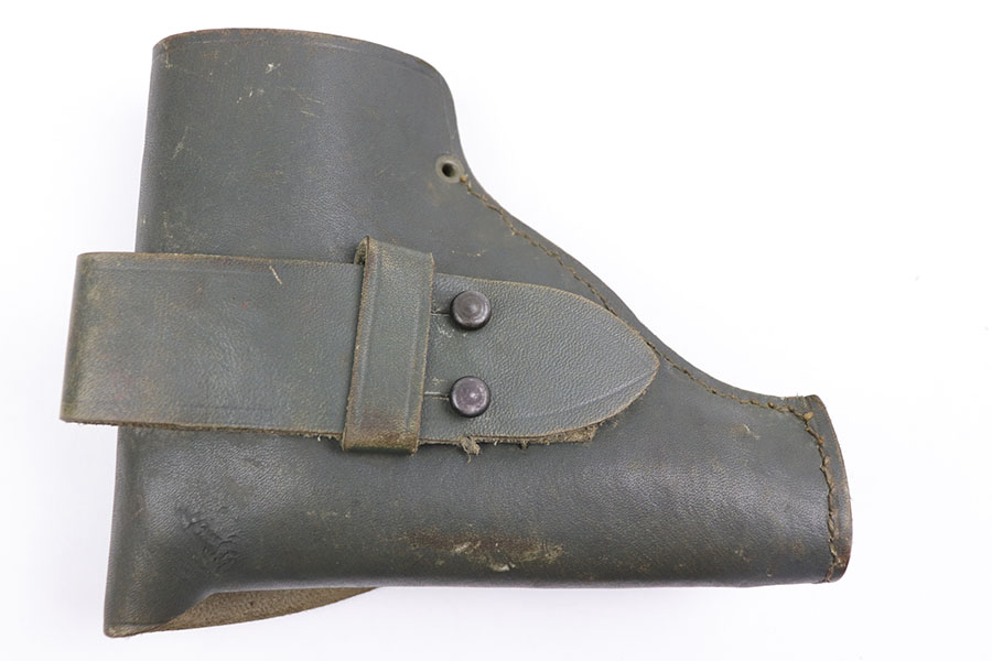 12/10/20 – This is an original WW2 era (or earlier) Italian Beretta holster. The holster has green colored leather and is in good overall condition. There are two appealingly intentional cuts in the leather, one being on the front underneath the “eye hole” and the other under the flap as shown in photos. The leather is fairly rigid and clean otherwise. Royal Italian stamped on the interior with maker initials ATS. No other markings. Stitching is all in tact.