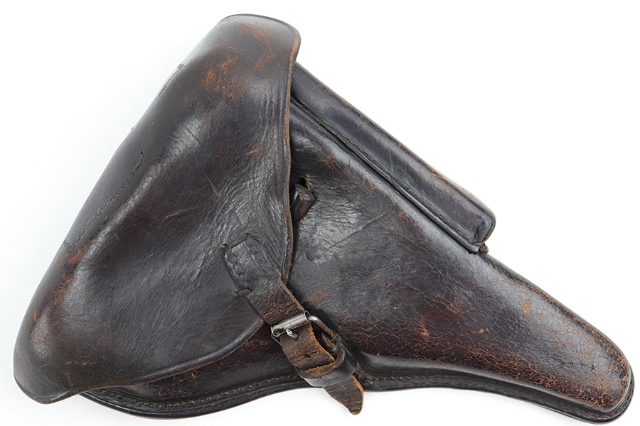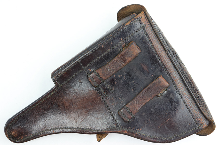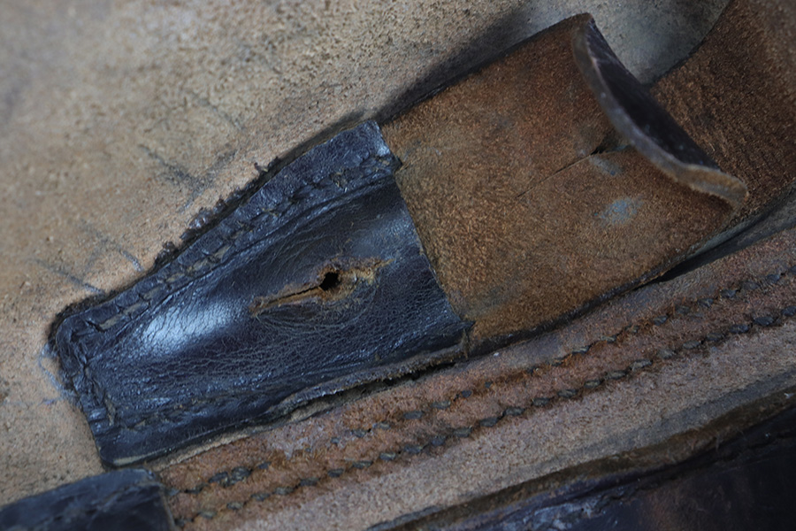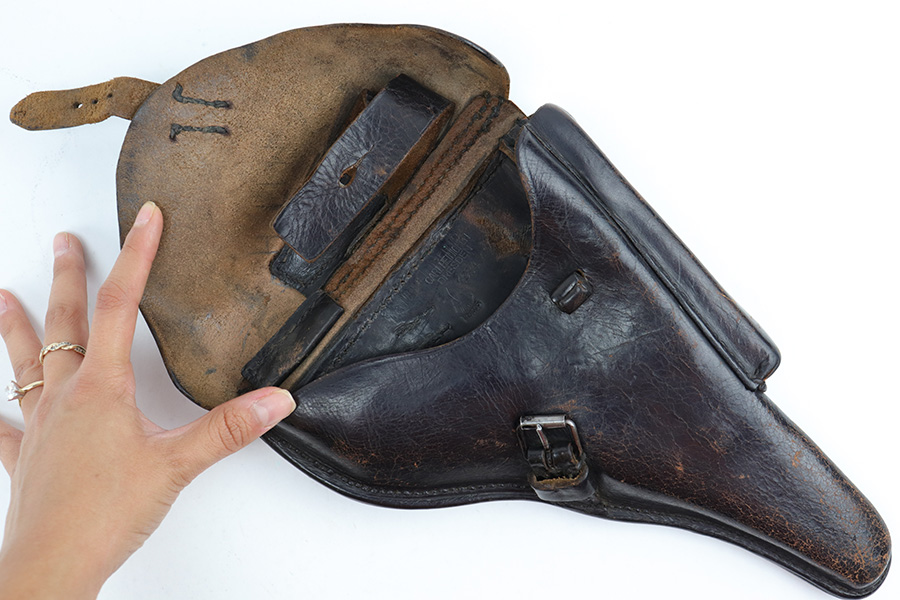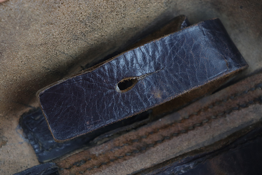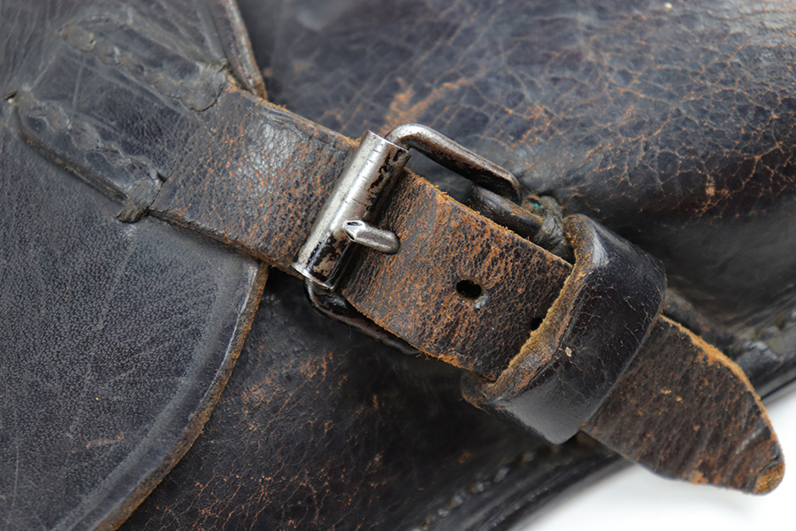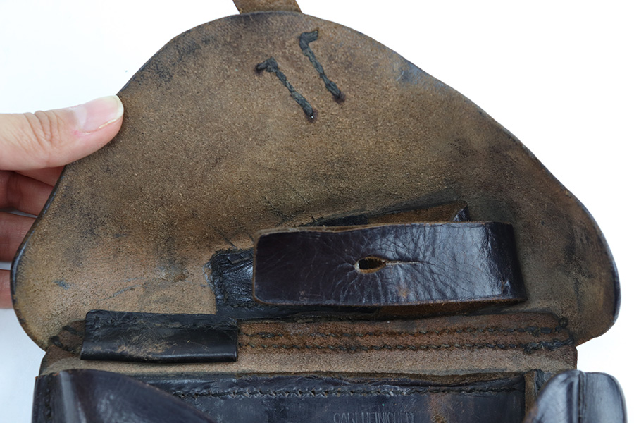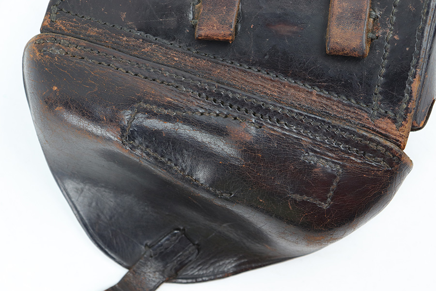 7/25/23 – This is an original, early WW2 production 1934 dated Luger holster. The holster features a maker stamp, date, and droop winged eagle military proof stamp on the interior leather. The leather is soft and pliable and has light surface wrinkling throughout the front leather. The back leather has some mild surface scuffing and light aging wear, plus the black dye is worn in areas. The leather has normal pliability. There are no stitching issues and the stitching is original throughout. The biggest takeaway is that the interior knob for the cleaning rod and tool pouches is missing. Priced accordingly.