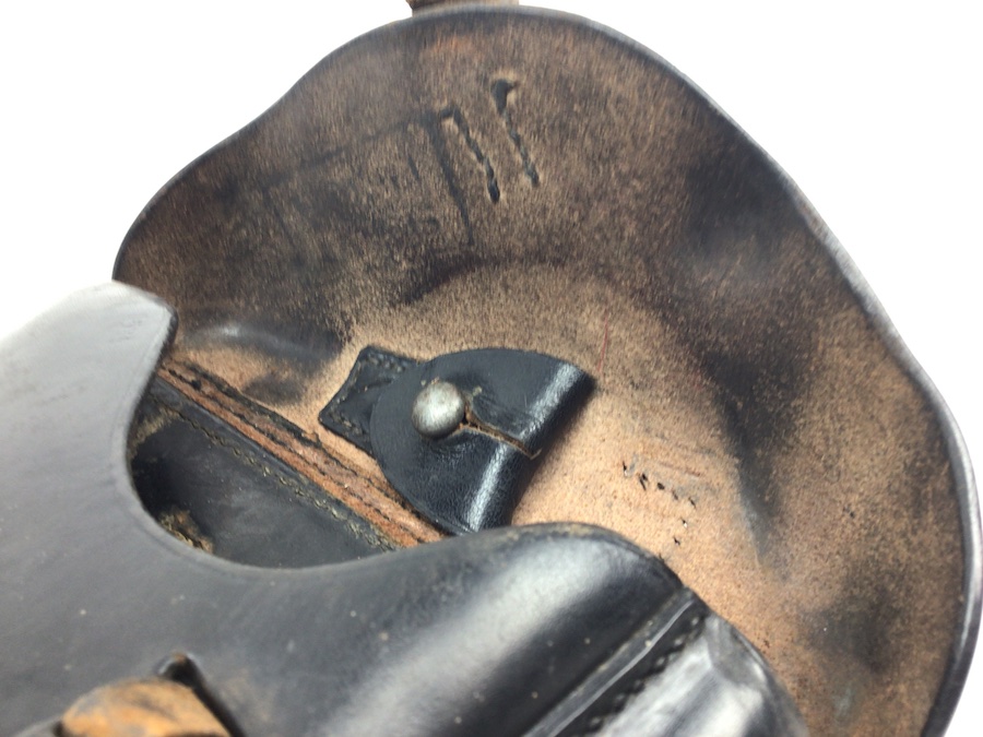11/3/20 – This is an original, and good condition K Date Luger holster. These early 1934 dated holsters are fairly scarce and desirable. This particular holster has clean leather and stitching. The leather has normal pliability and surface wrinkling, mostly near the toe, and on the closure strap. The brown leather is maker stamped and dated along with the early waffen stamp. However the interior cleaning rod holder is missing. Priced accordingly.