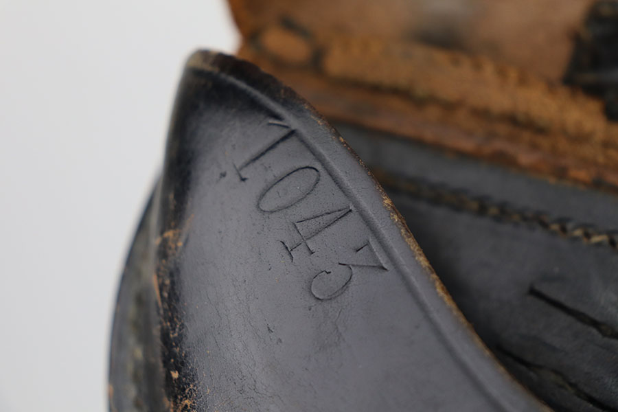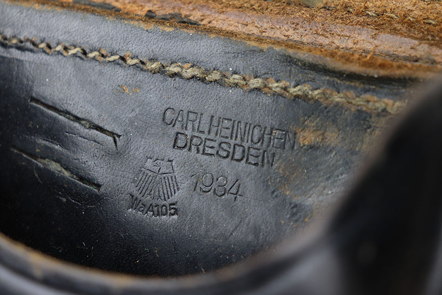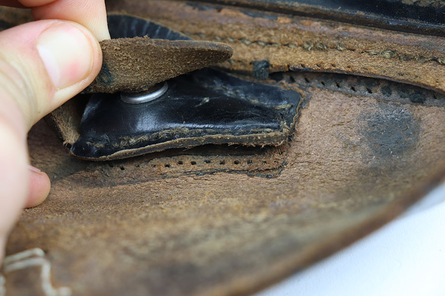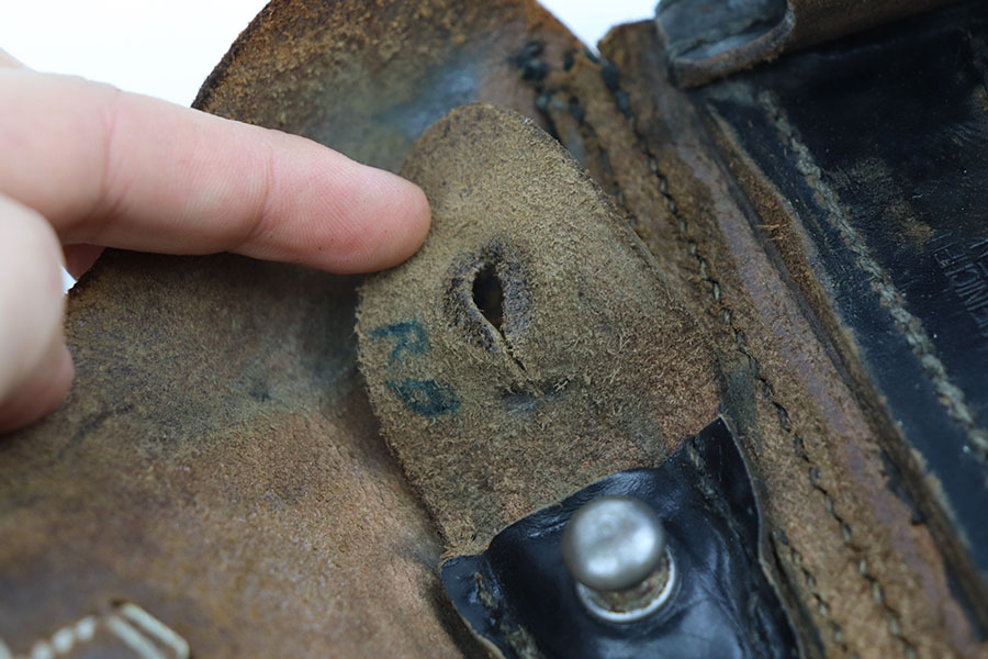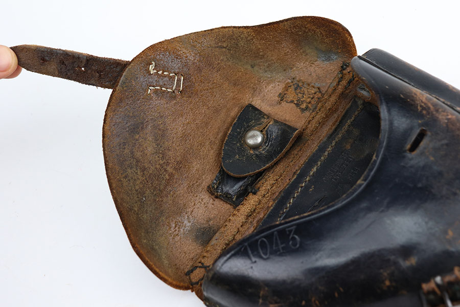 3/16/21 – This is an original K Date luger holster. the holster is maker stamped and dated on the interior leather. Also stamped with a droop winged eagle proof stamp. The front leather is number stamped “1043” which is likely a unit number stamp. The leather is scuffed on the exterior as shown. This is surface wear, but consistent throughout the leather. The lift strap is missing, and the closure strap appears to be replacement stitching. The rest of the stitching is original. Price reduced accordingly.