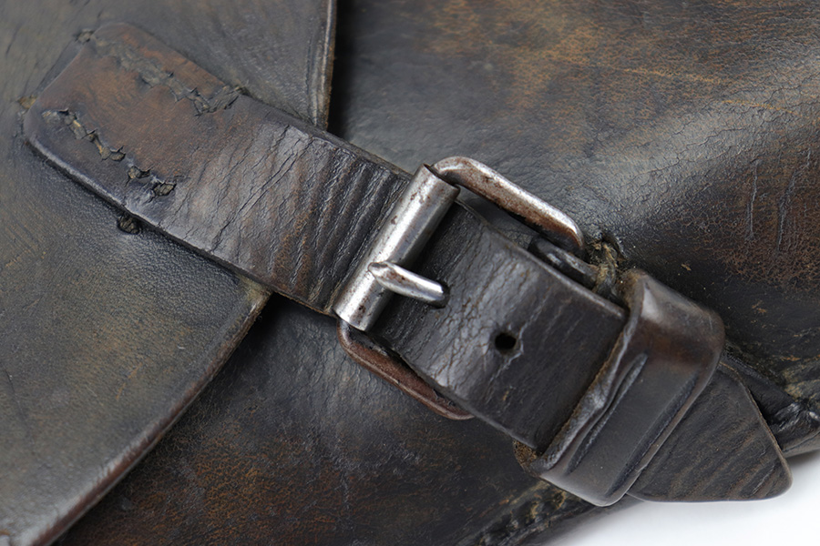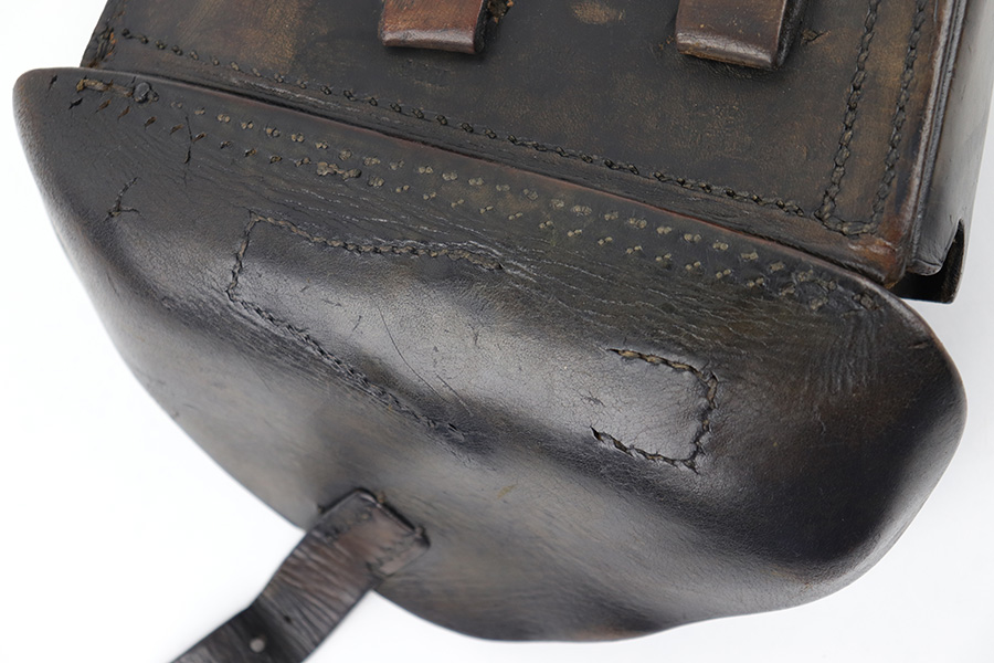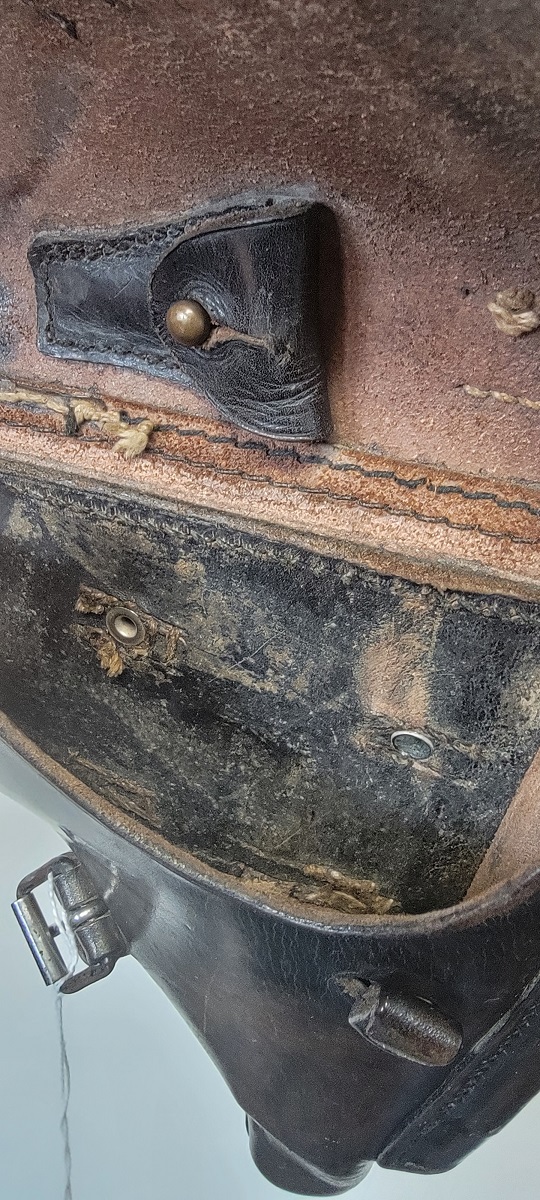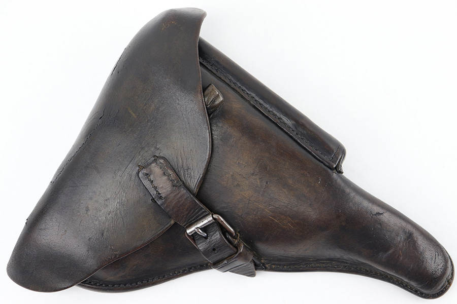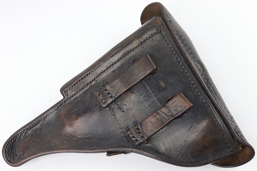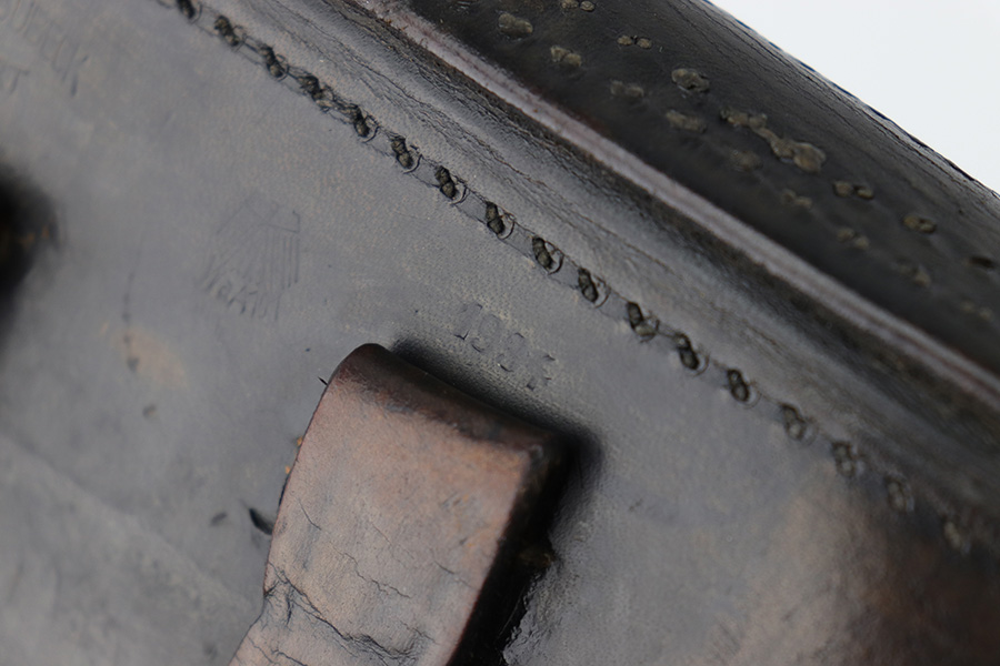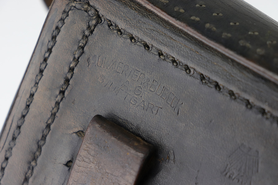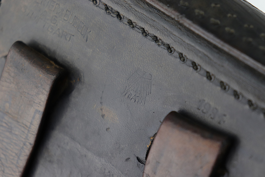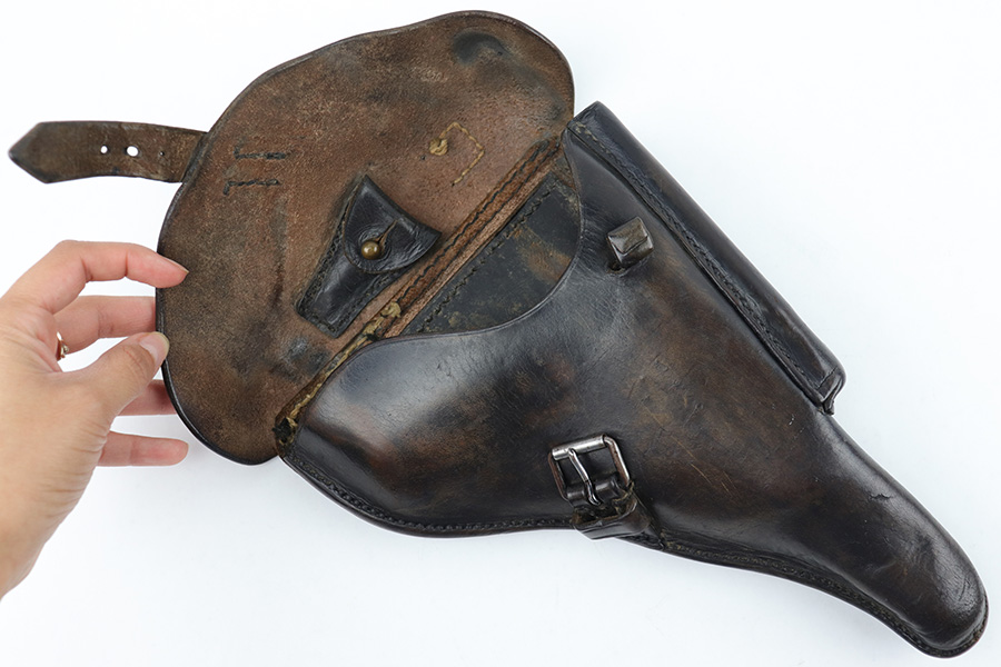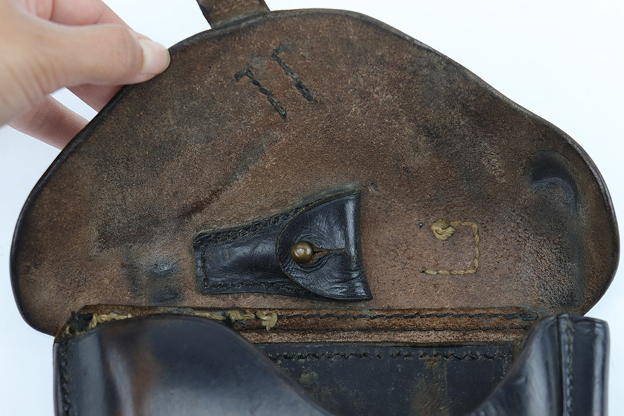 5/23/23 – This is an original 1934 dated, ‘K Date’ Luger holster from WW2. The holster has all original leather, but most of the stitching has been replaced. The top of each belt loop has also been reinforced with a rivet, as shown in photos. The leather has normal pliability and light surface wear throughout. The black dye has mostly faded throughout the holster as well, a typical sign of aging and use wear. The back leather is maker stamped, dated, and waffen proof stamped.