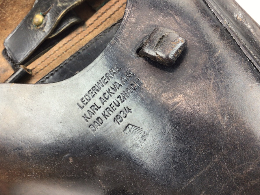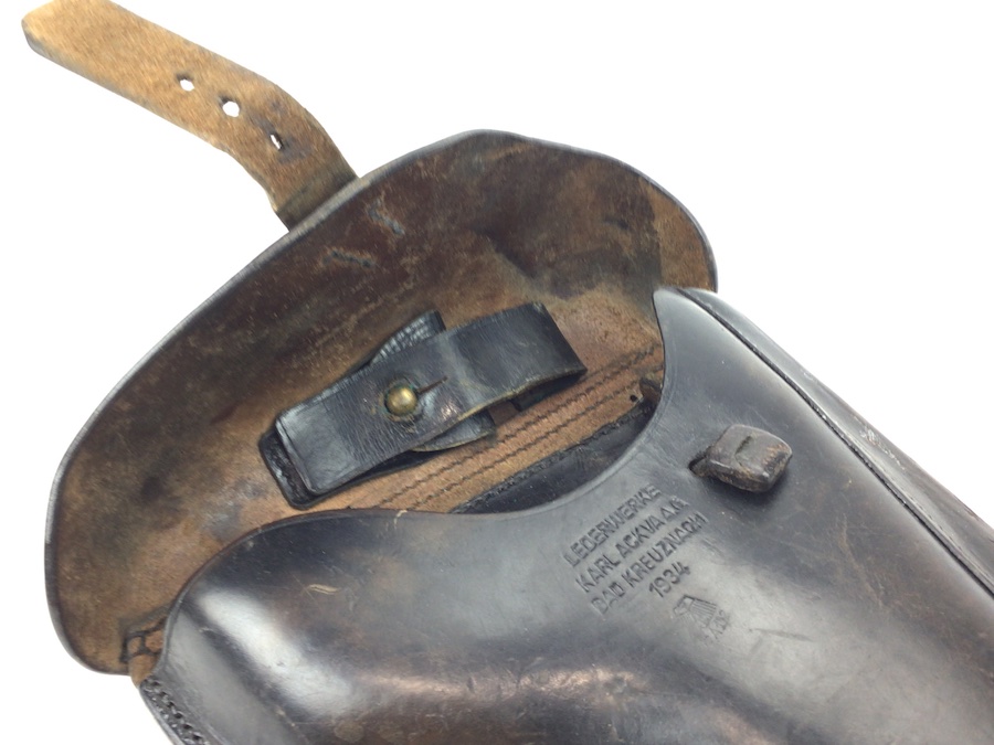 7/14/21 – Original and excellent condition. 1934 K date holster, cleaning rod and B90 take down tool. The holster is maker and date stamped on the front “LEDERWERKE KARL ACKVA” along with Weimar waffen stamp. Minimal wear and great chocolate brown color. Fully intact and secure stitching. Excellent condition tool and cleaning rod. The cleaning rod has an early variation brass rounded tip. Nice assembly for your K date luger.