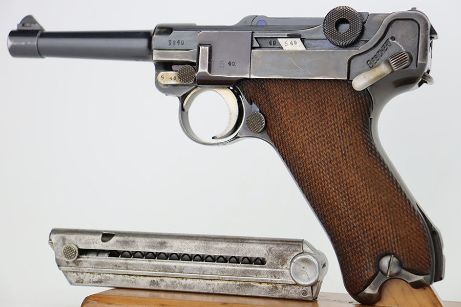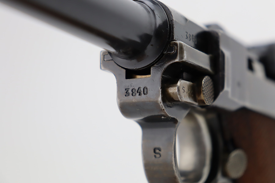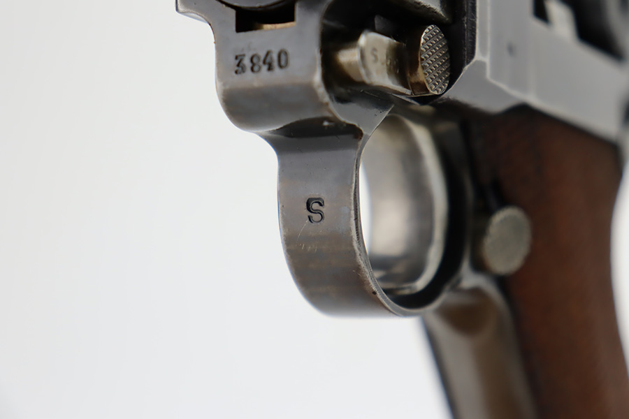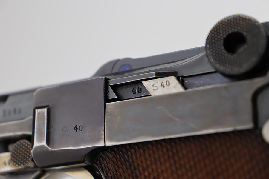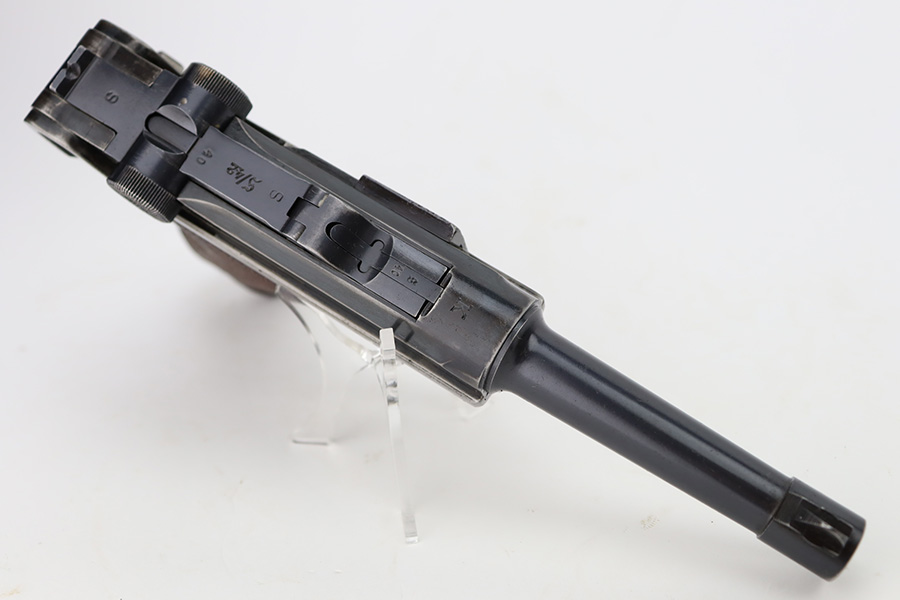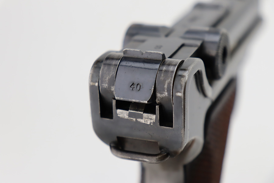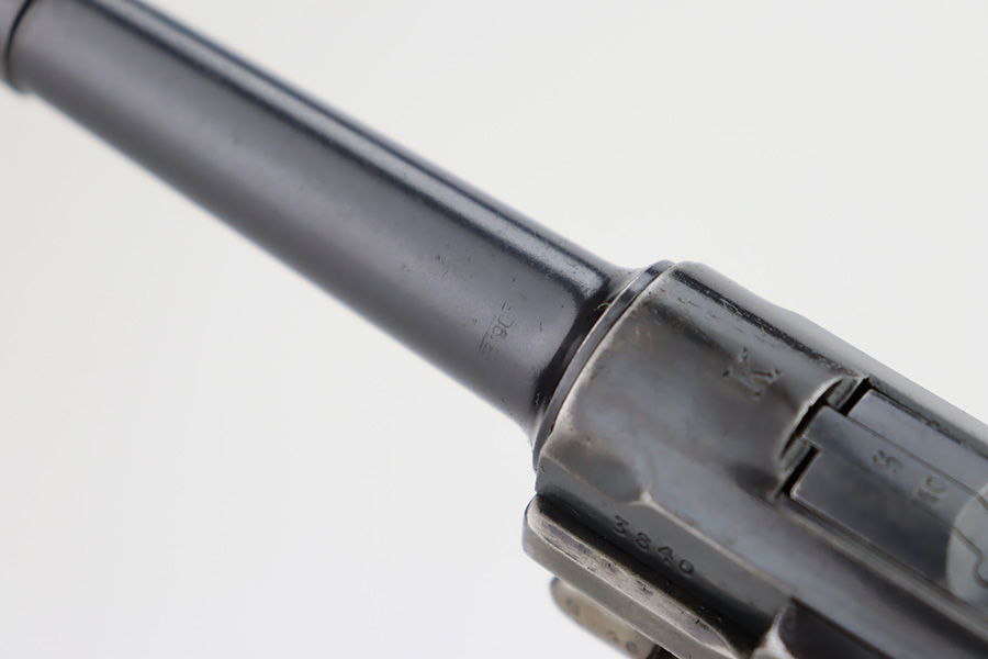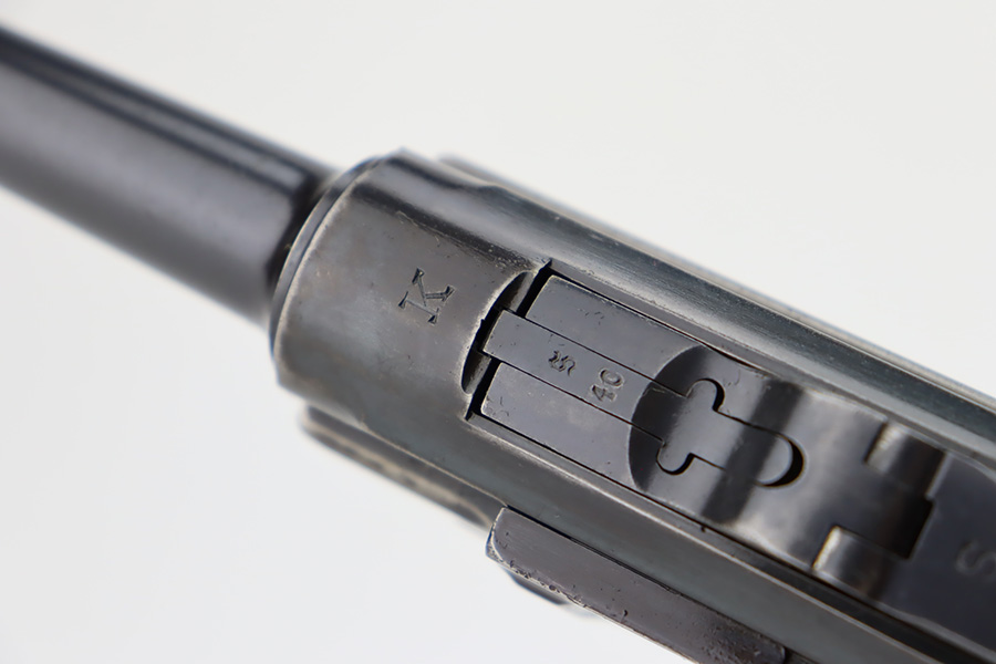 10/12/23 – This is a “K Date” Luger issued to the Nazi military in 1934. It is all matching with the proper “K Date” military acceptance proofs. It comes as a rig with a rare “K Date” holster and a proper “K Date” magazine that is mismatched to the gun. The gun itself has retained roughly half of its finish with significant finish loss on the grip straps and areas of wear on the upper of the gun, concentrated mostly around the high edges. Some discoloration on the left side of the frame. Fitted with minty matching-numbered wood grips. The bore has decent rifling, but there is pin-pricking throughout.