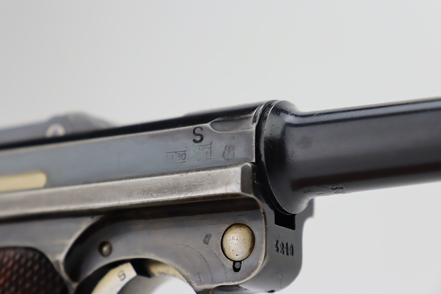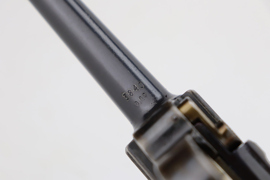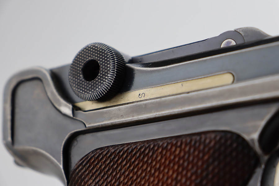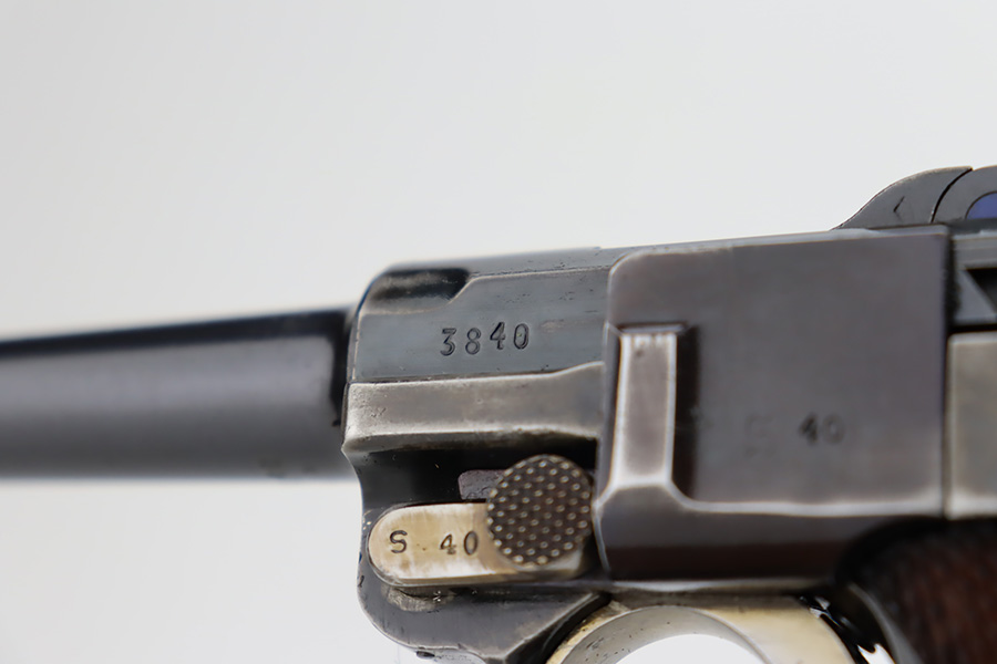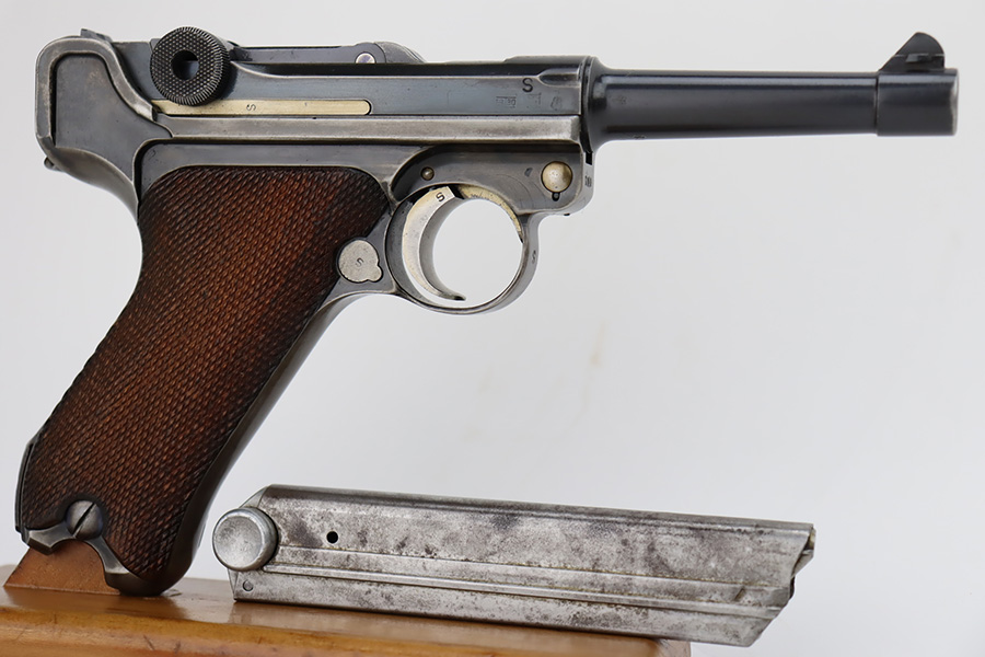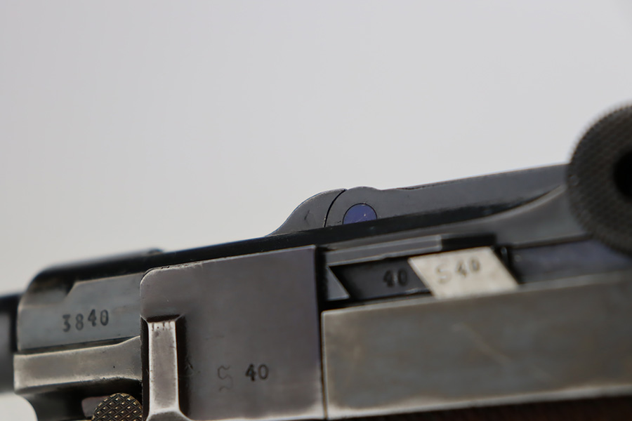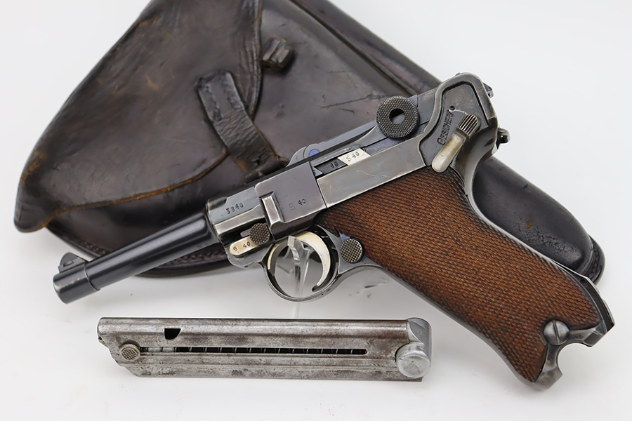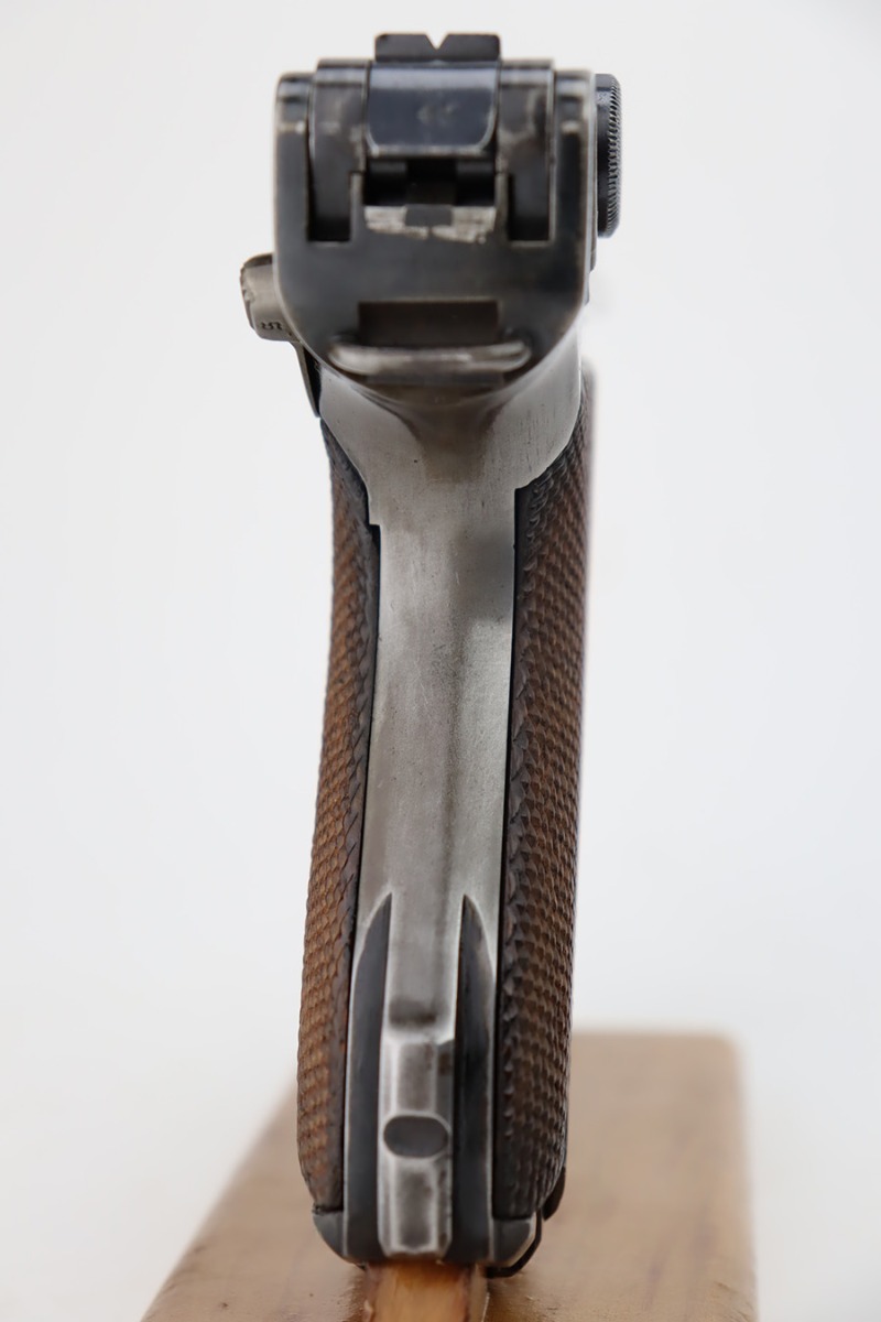 10/12/23 – This is a “K Date” Luger issued to the Nazi military in 1934. It is all matching with the proper “K Date” military acceptance proofs. It comes as a rig with a rare “K Date” holster and a proper “K Date” magazine that is mismatched to the gun. The gun itself has retained roughly half of its finish with significant finish loss on the grip straps and areas of wear on the upper of the gun, concentrated mostly around the high edges. Some discoloration on the left side of the frame. Fitted with minty matching-numbered wood grips. The bore has decent rifling, but there is pin-pricking throughout.