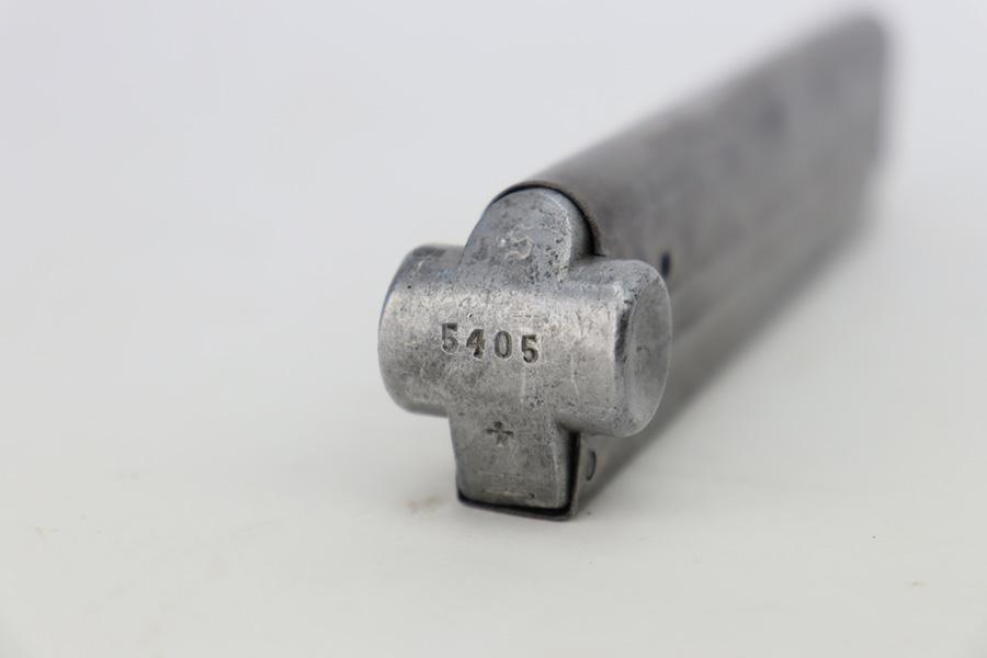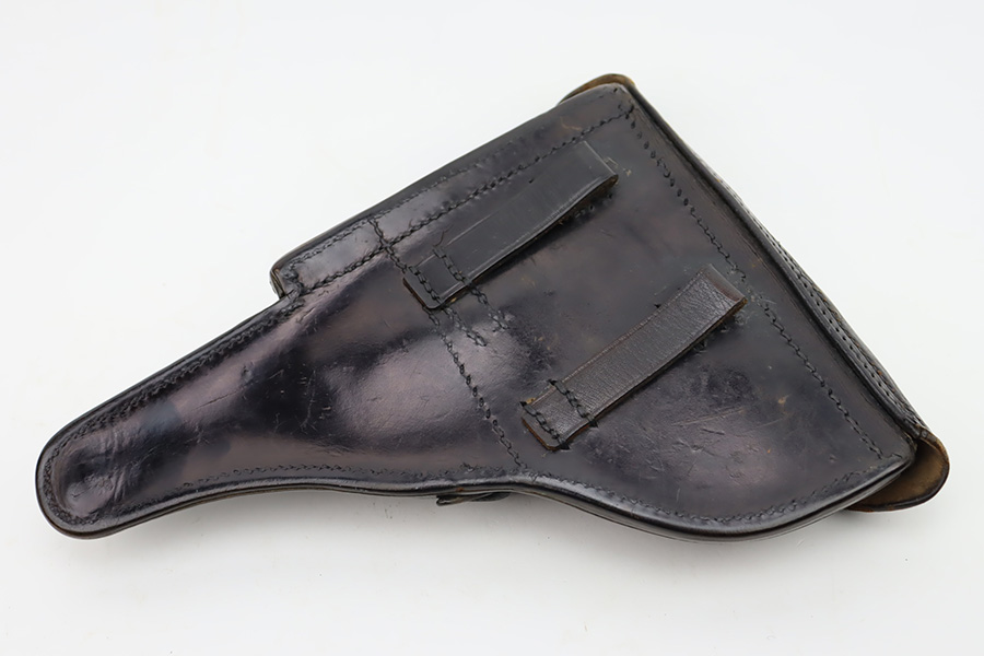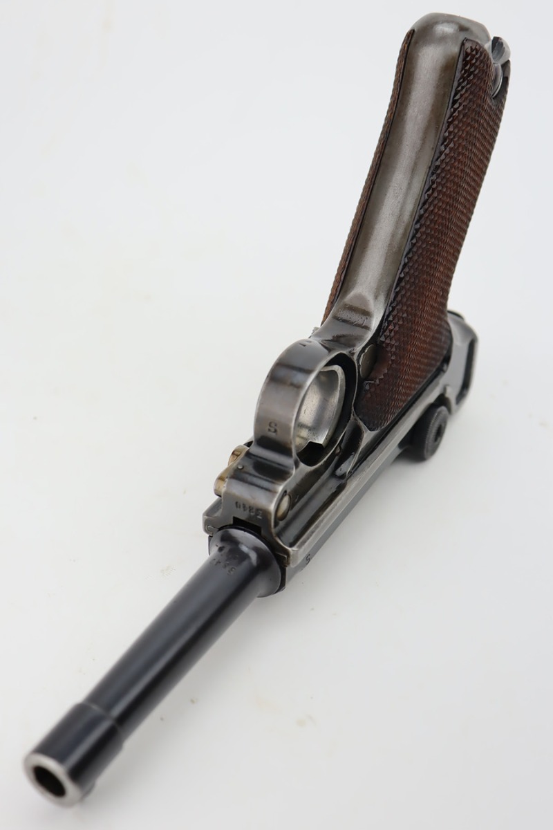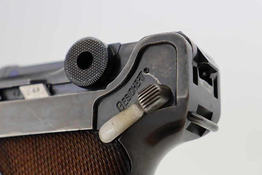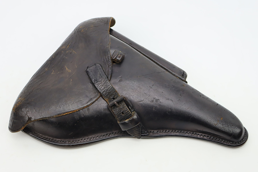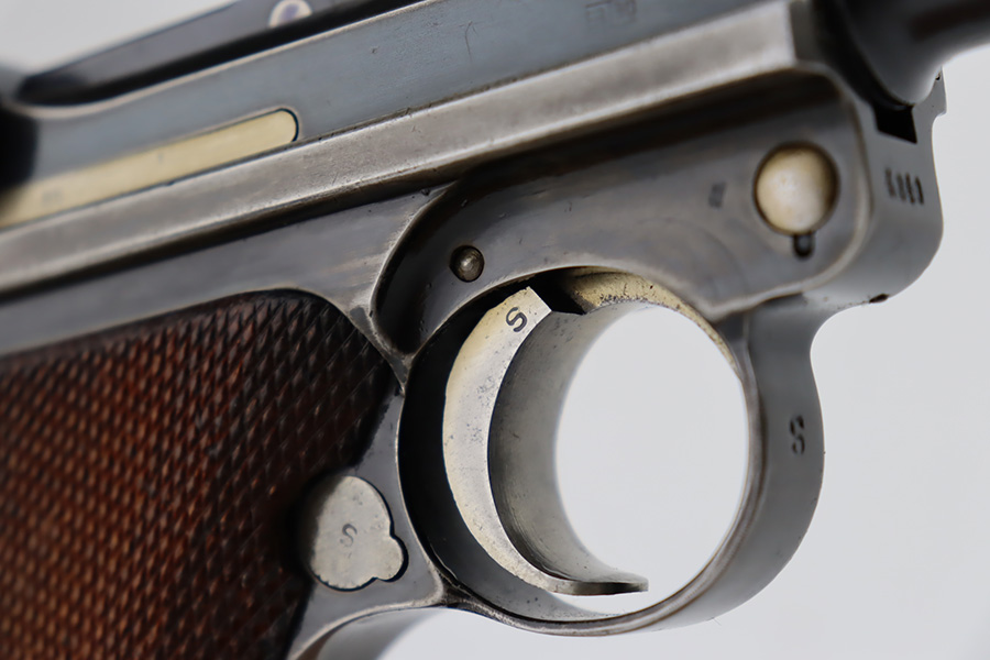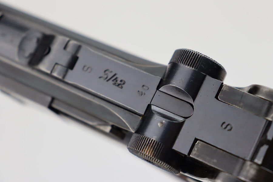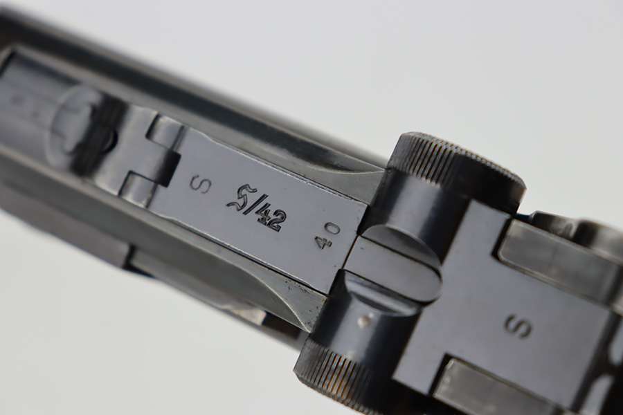 10/12/23 – This is a “K Date” Luger issued to the Nazi military in 1934. It is all matching with the proper “K Date” military acceptance proofs. It comes as a rig with a rare “K Date” holster and a proper “K Date” magazine that is mismatched to the gun. The gun itself has retained roughly half of its finish with significant finish loss on the grip straps and areas of wear on the upper of the gun, concentrated mostly around the high edges. Some discoloration on the left side of the frame. Fitted with minty matching-numbered wood grips. The bore has decent rifling, but there is pin-pricking throughout.
