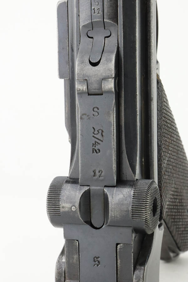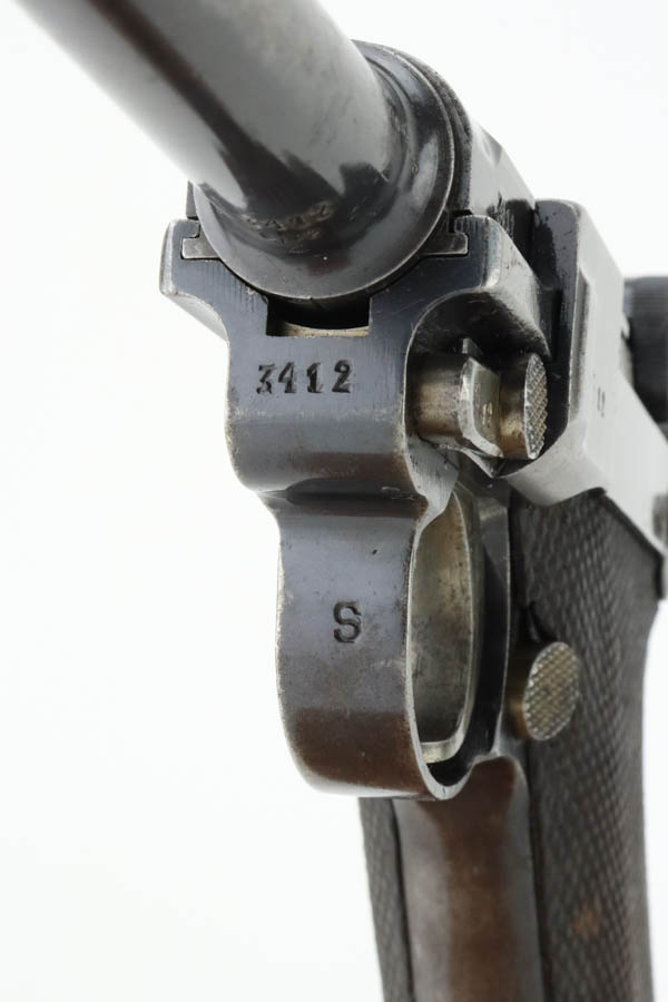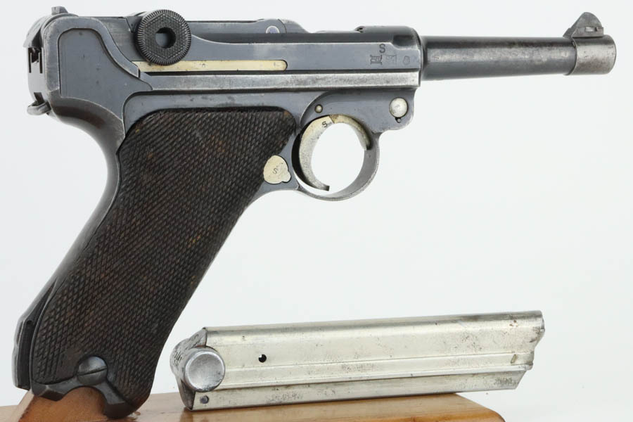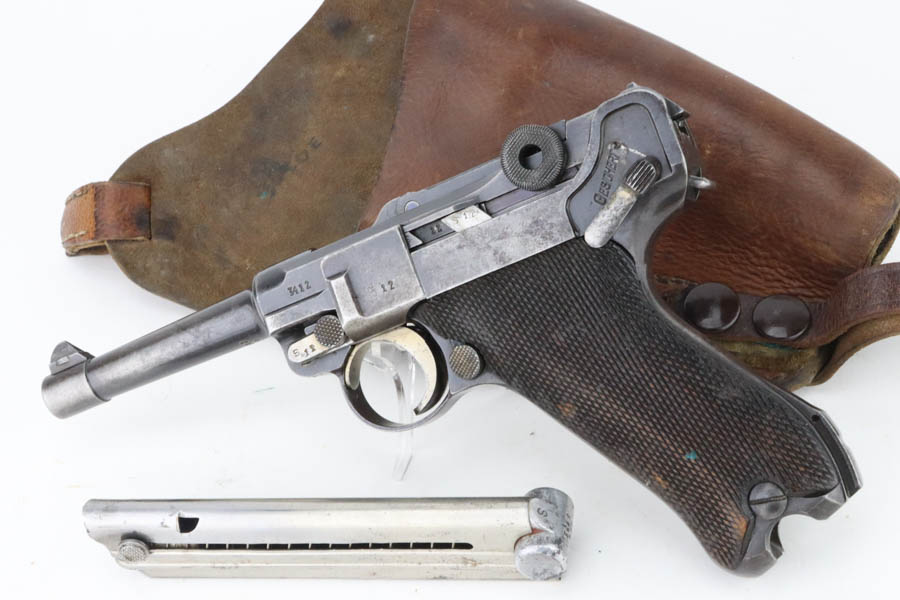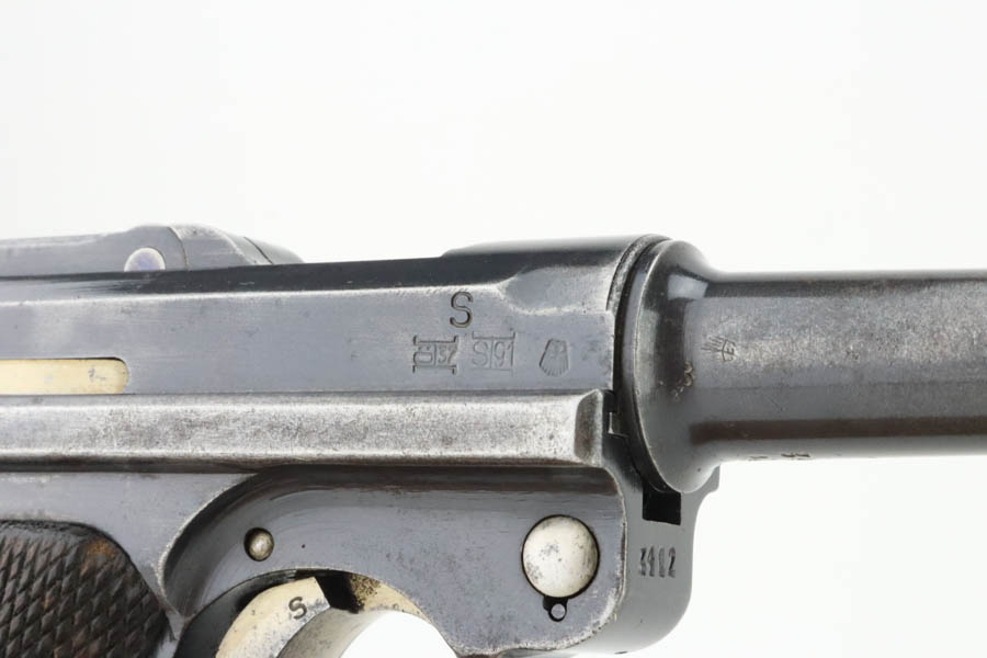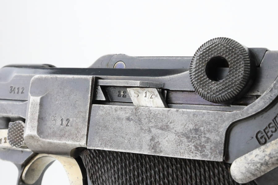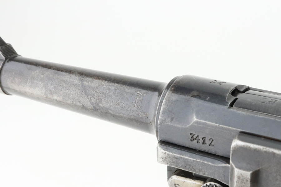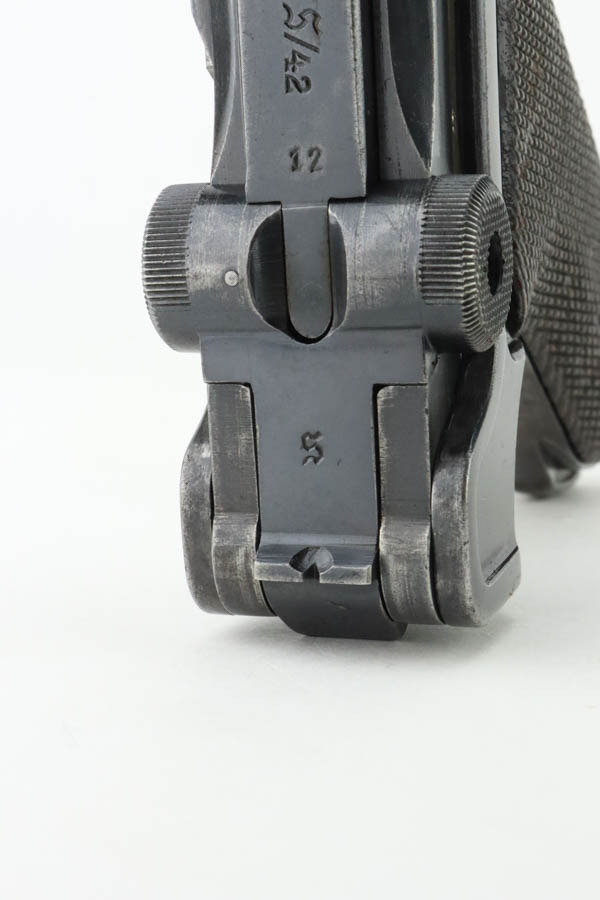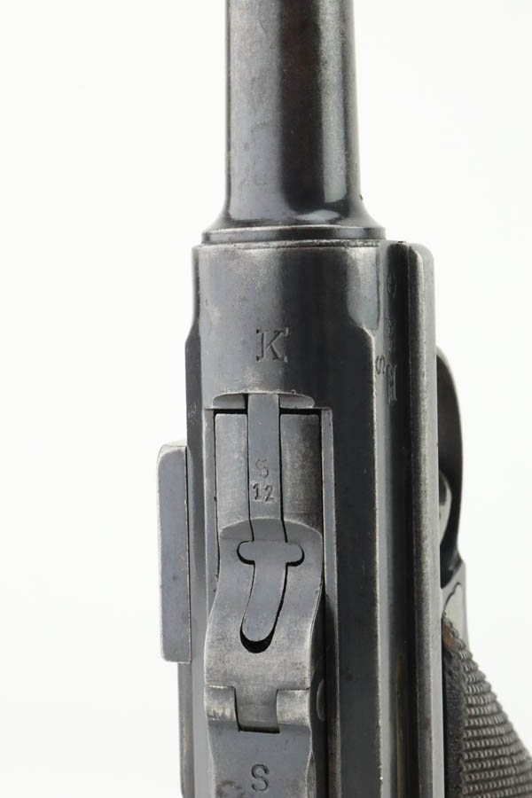 6/14/24 – This is a scarce K Date Mauser Luger issued to the Nazi military in 1934. All matching with the proper “O37” and “S91” military proofs. K Date “S” proofs throughout. It comes as a rig with a period-correct but mismatched “B90” proofed magazine and a generic leather shoulder holster. The gun itself has retained roughly 60% of its original finish with obvious wear throughout. Some areas of brown patina and light oxidation here and there. Fitted with matching-numbered wood grips. The bore has good rifling with light frosting throughout.
