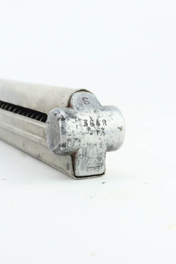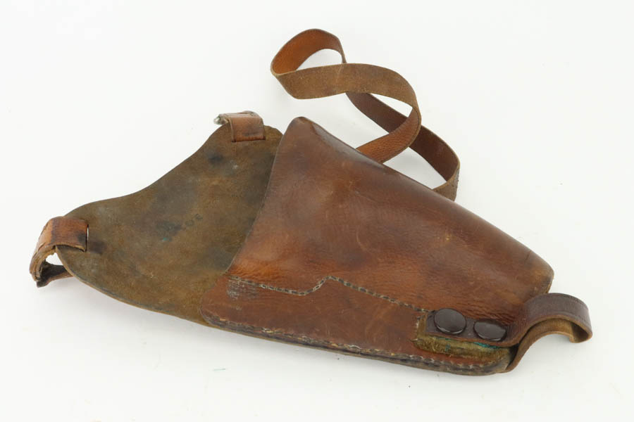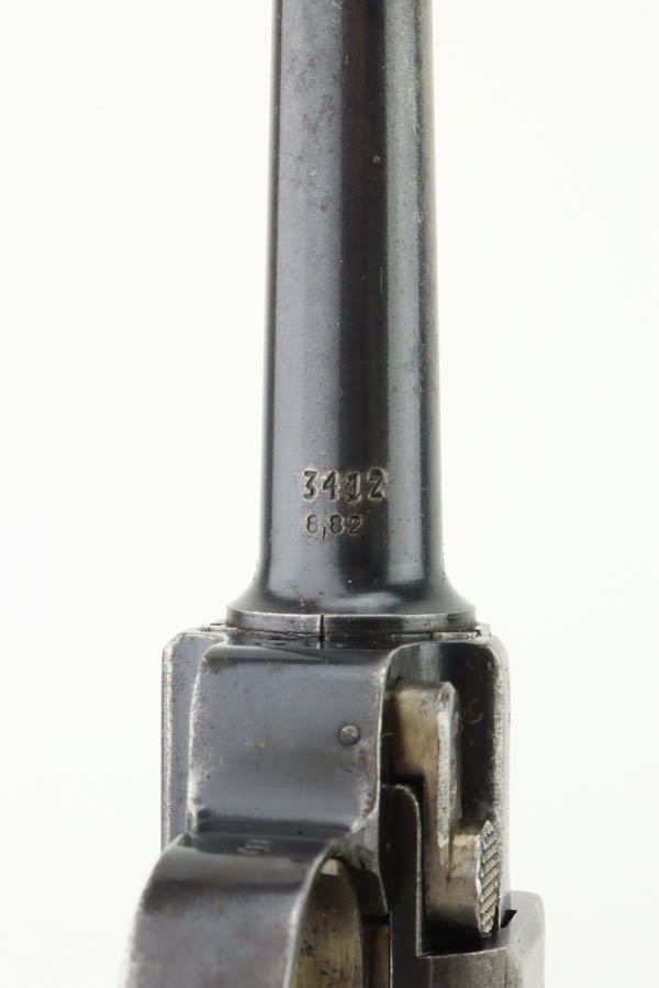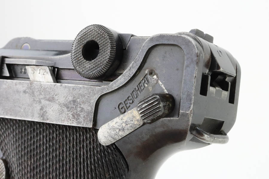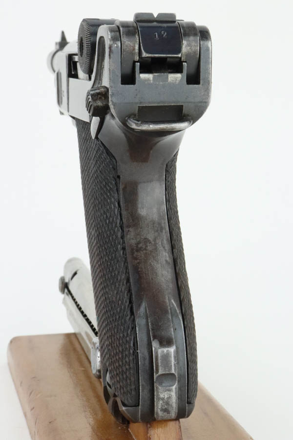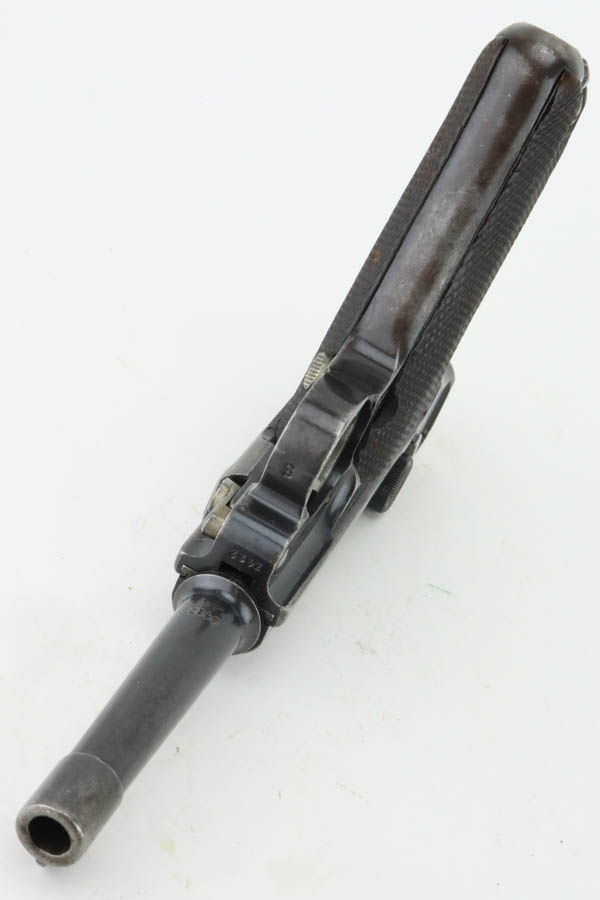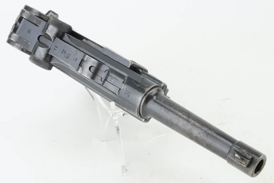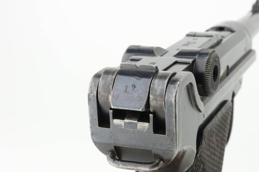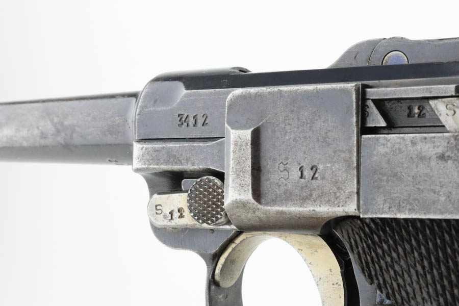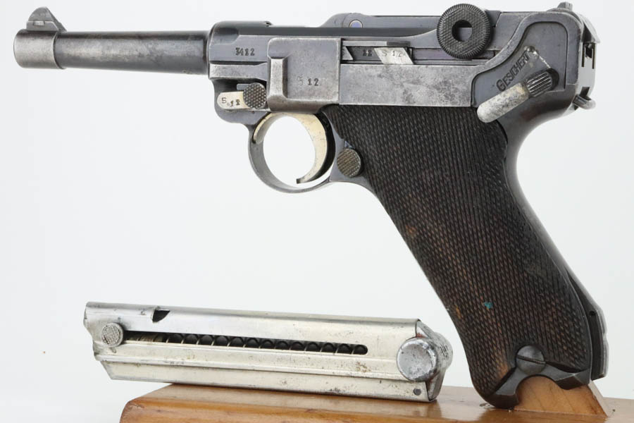 6/14/24 – This is a scarce K Date Mauser Luger issued to the Nazi military in 1934. All matching with the proper “O37” and “S91” military proofs. K Date “S” proofs throughout. It comes as a rig with a period-correct but mismatched “B90” proofed magazine and a generic leather shoulder holster. The gun itself has retained roughly 60% of its original finish with obvious wear throughout. Some areas of brown patina and light oxidation here and there. Fitted with matching-numbered wood grips. The bore has good rifling with light frosting throughout.