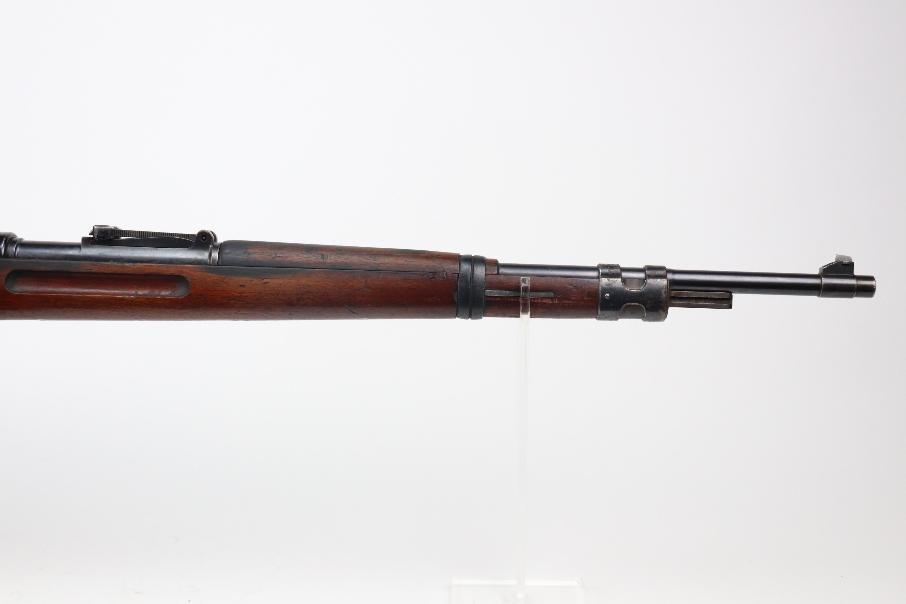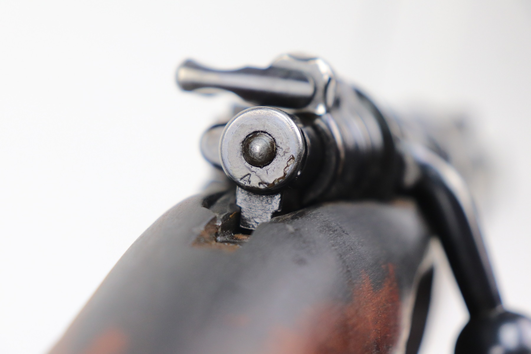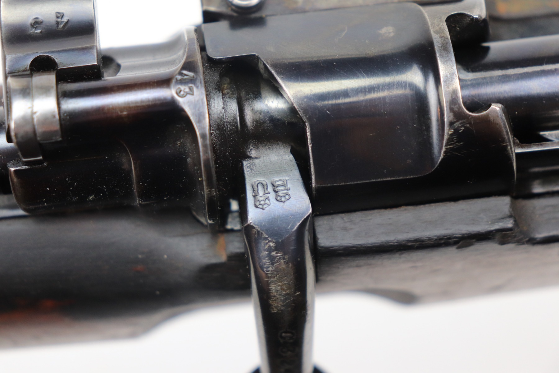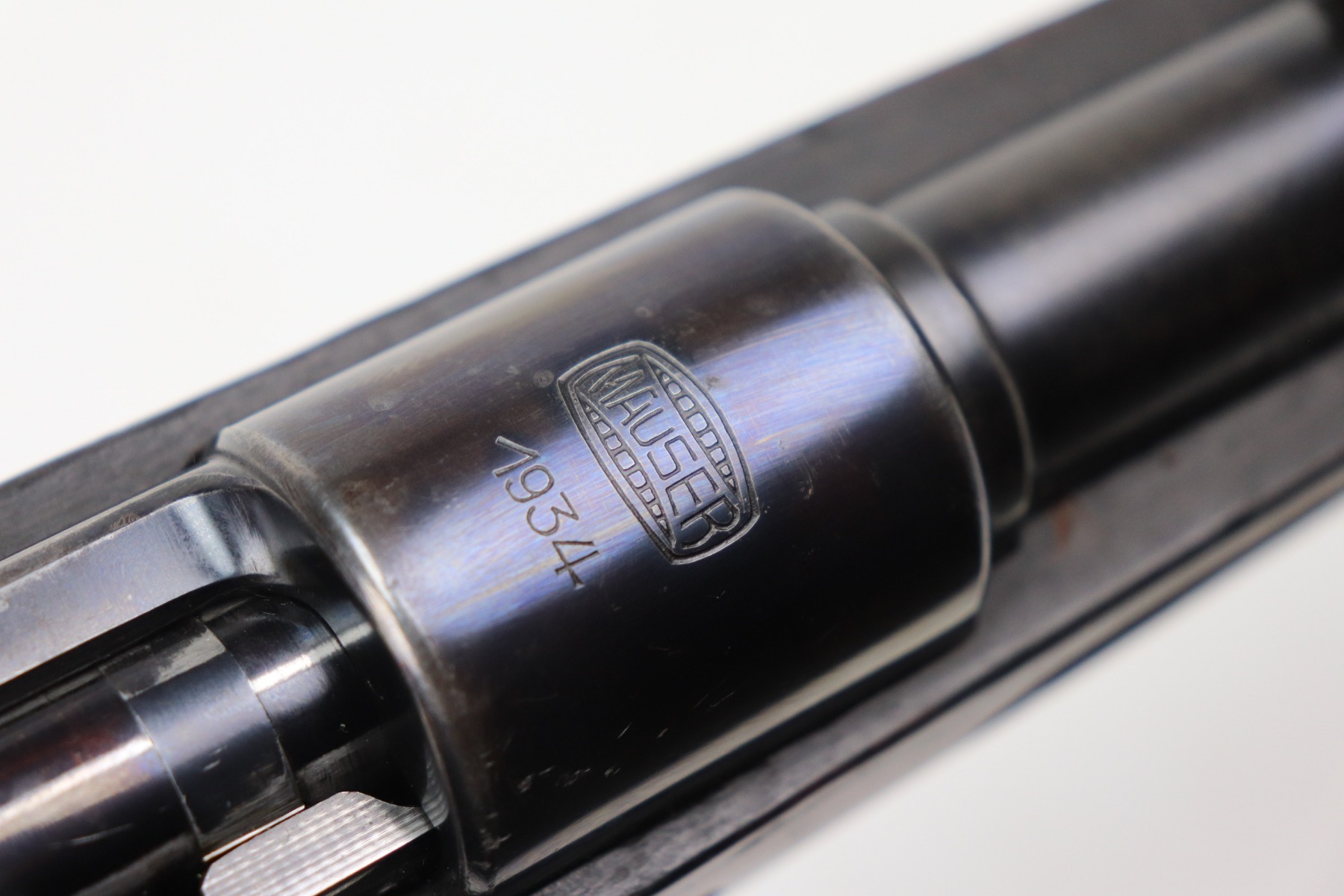 2/12/21 – This is a very nice example of a Mauser Standard Modell Rifle, made in 1934. The gun is all matching except for the rear barrel band. It has the proper “BUG” proofs. It has retained most of its original finish with minor wear on the high edges and spotty oxidation here and there. Spotty rust on the butt plate. Thinning and scratches on the floor plate. The stock is excellent with minor handling marks throughout and a streak of dark discoloration along the top of the stock. Minty bore.