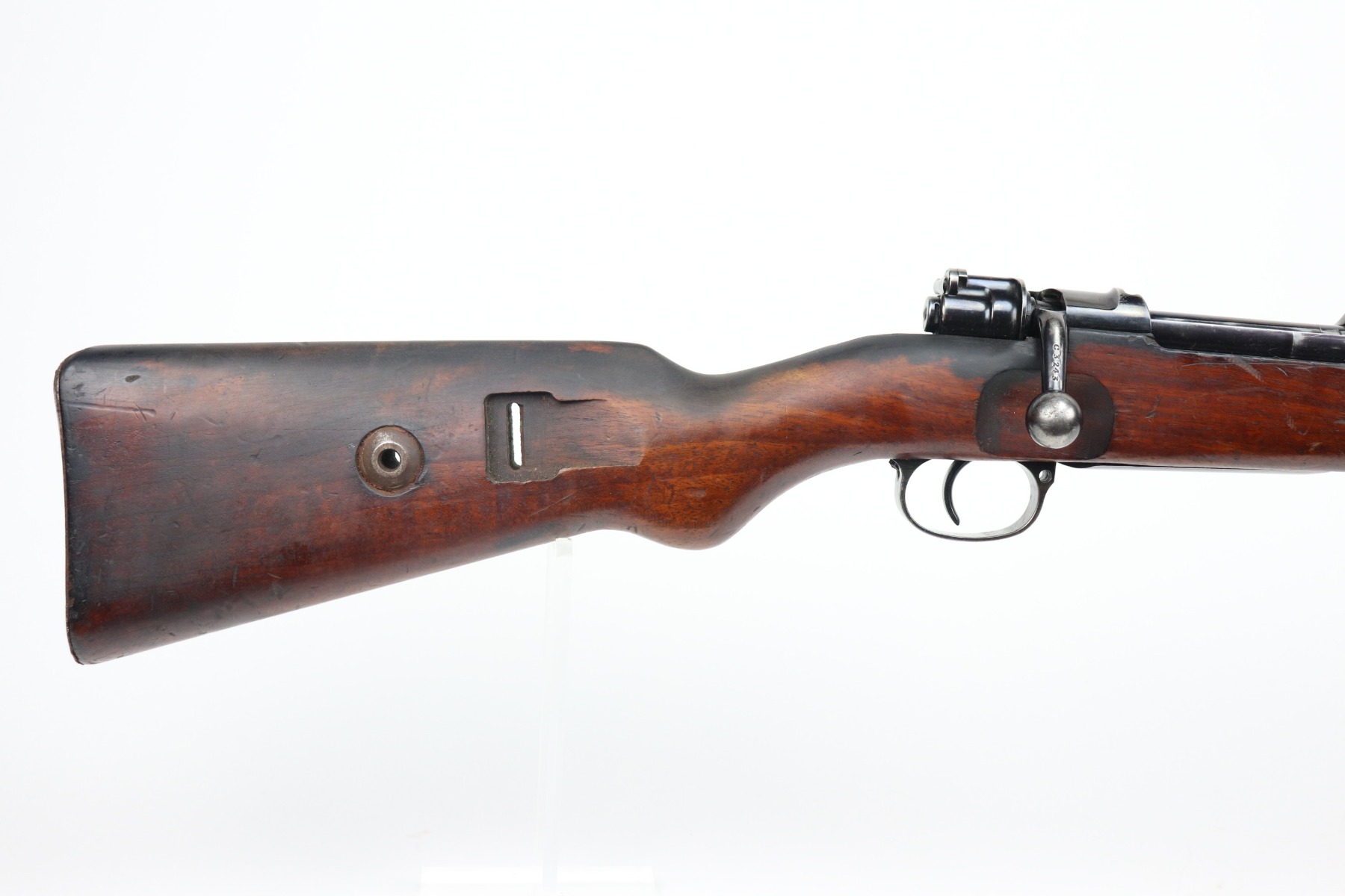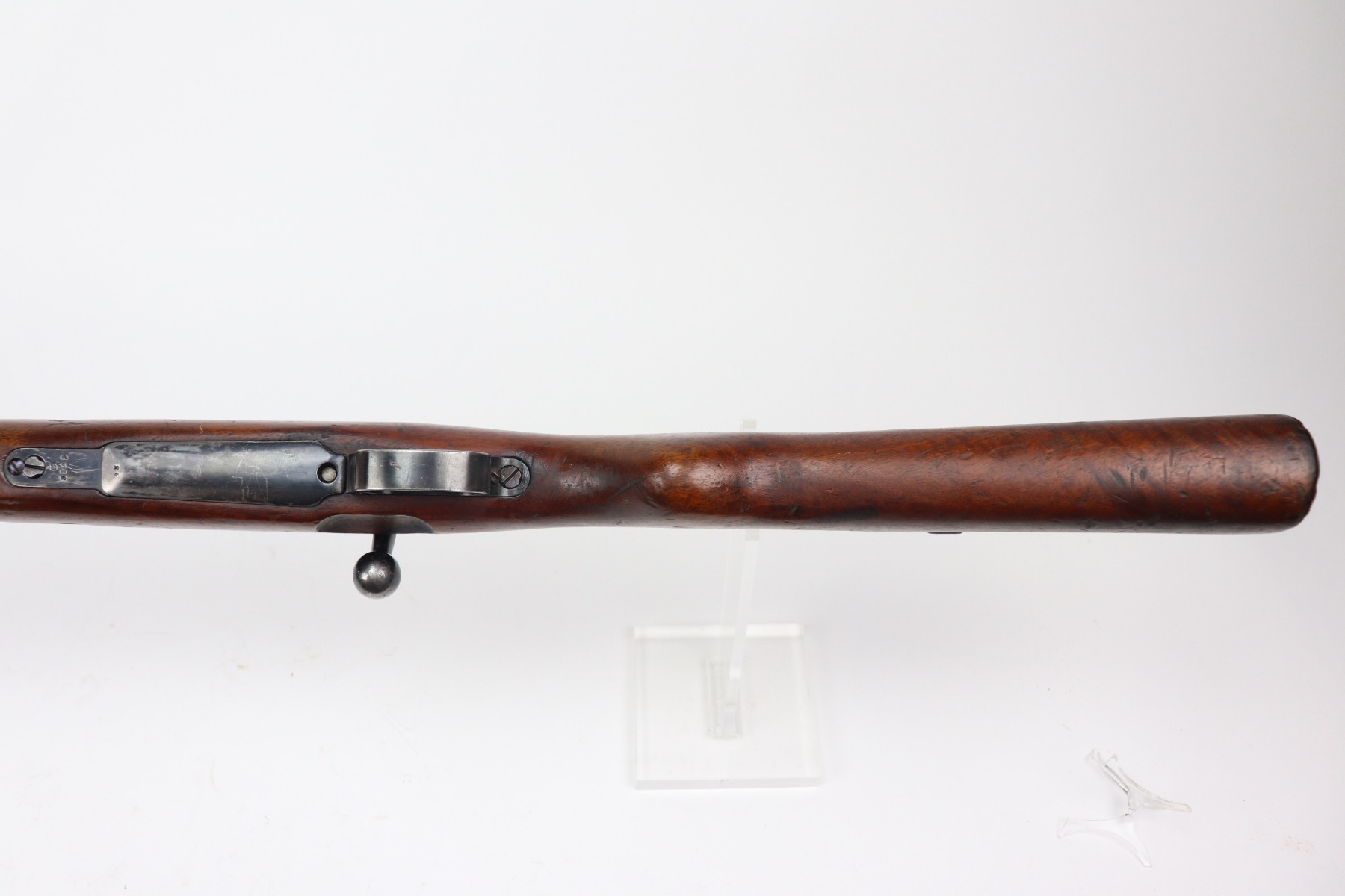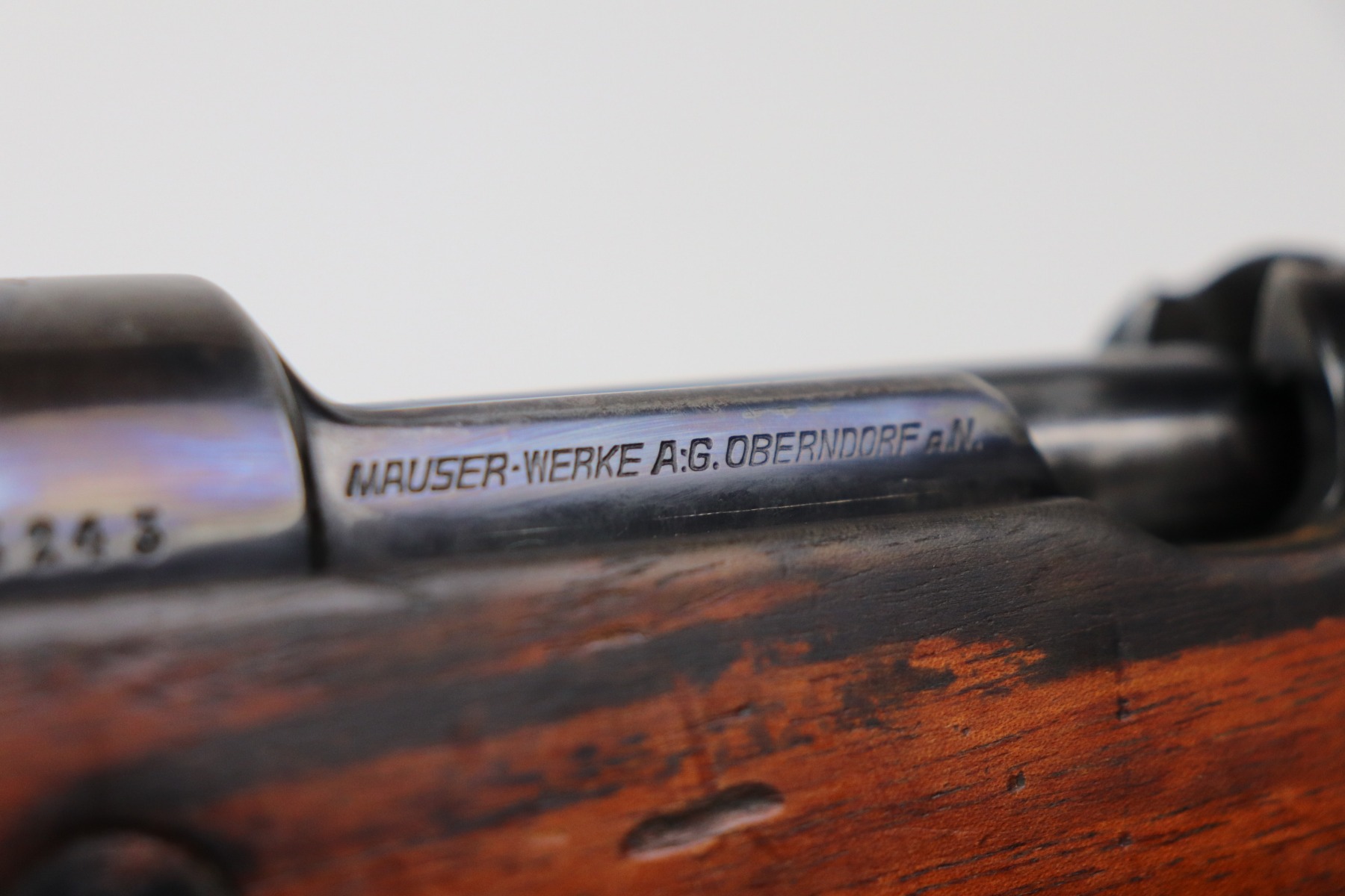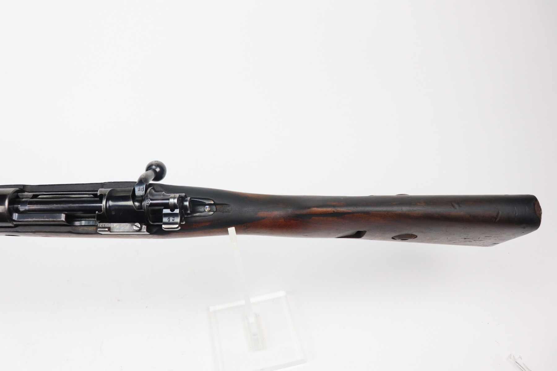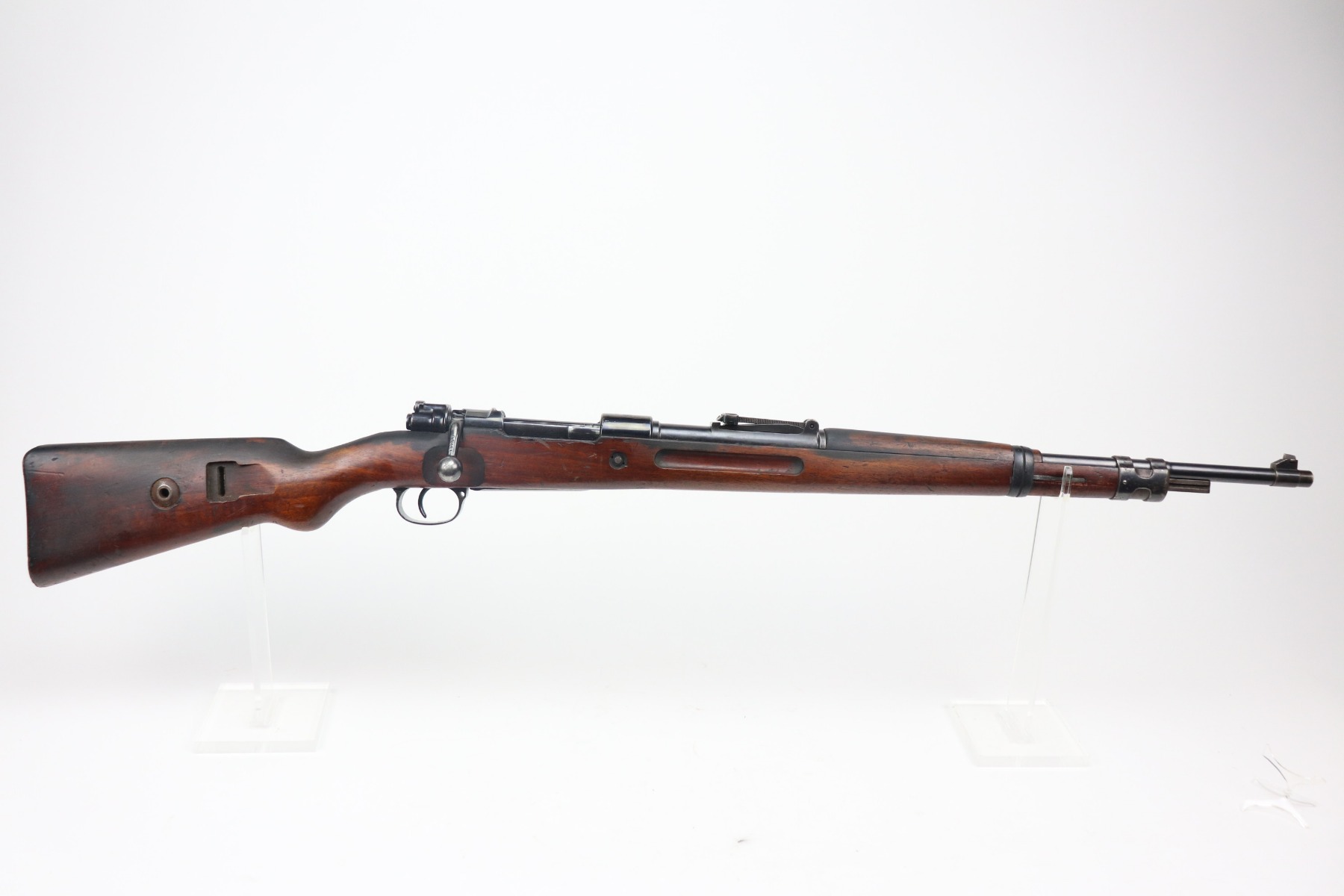 2/12/21 – This is a very nice example of a Mauser Standard Modell Rifle, made in 1934. The gun is all matching except for the rear barrel band. It has the proper “BUG” proofs. It has retained most of its original finish with minor wear on the high edges and spotty oxidation here and there. Spotty rust on the butt plate. Thinning and scratches on the floor plate. The stock is excellent with minor handling marks throughout and a streak of dark discoloration along the top of the stock. Minty bore.