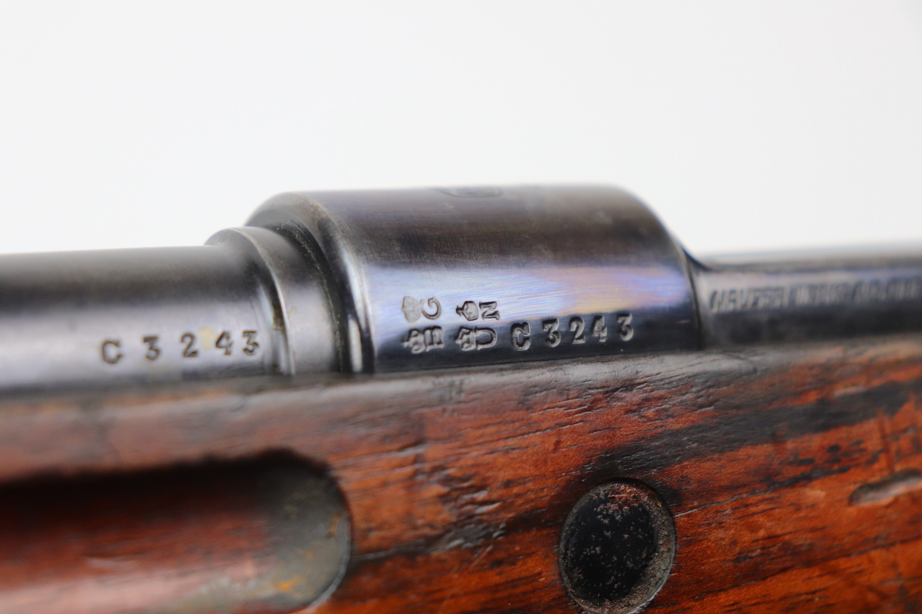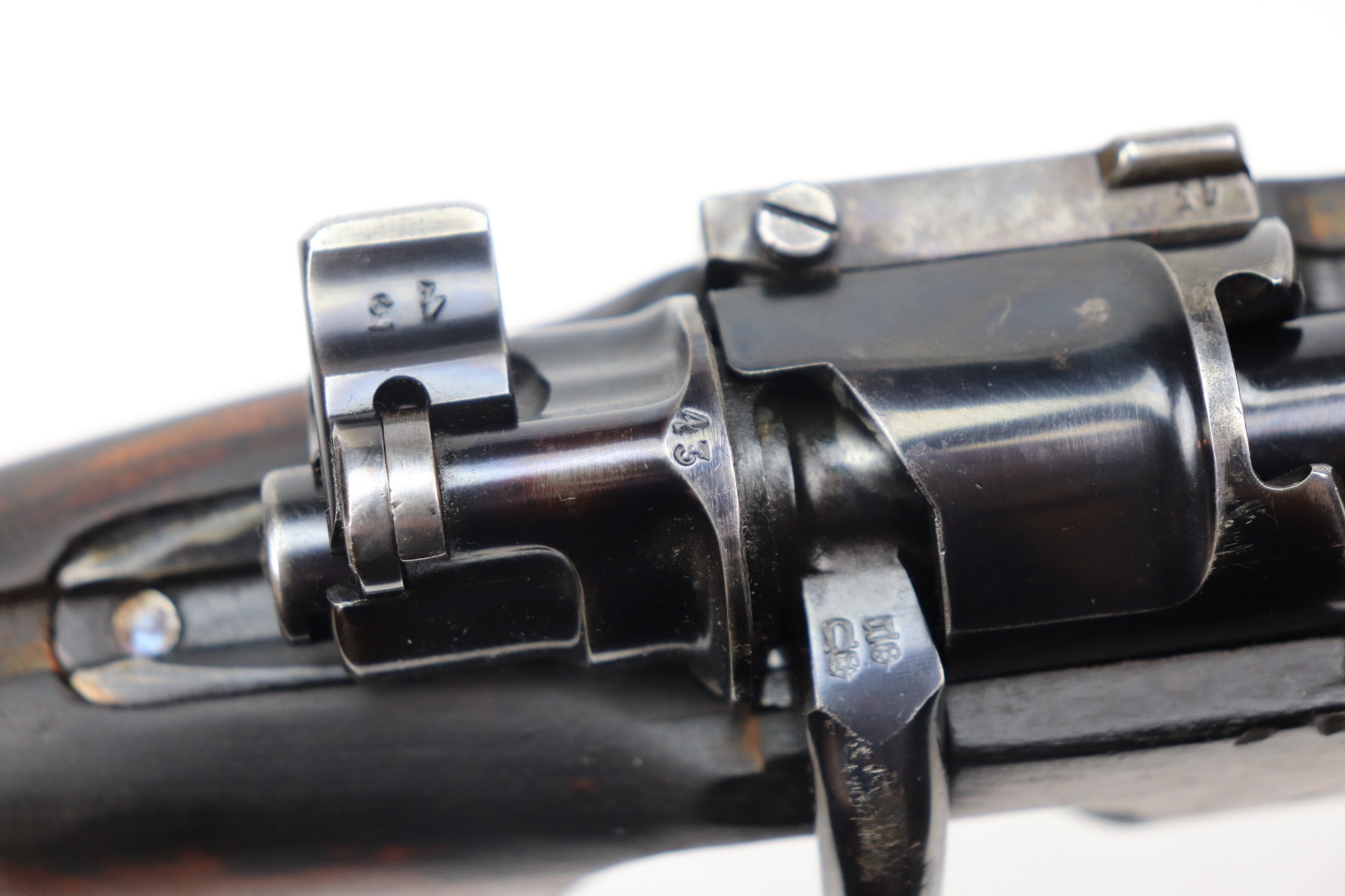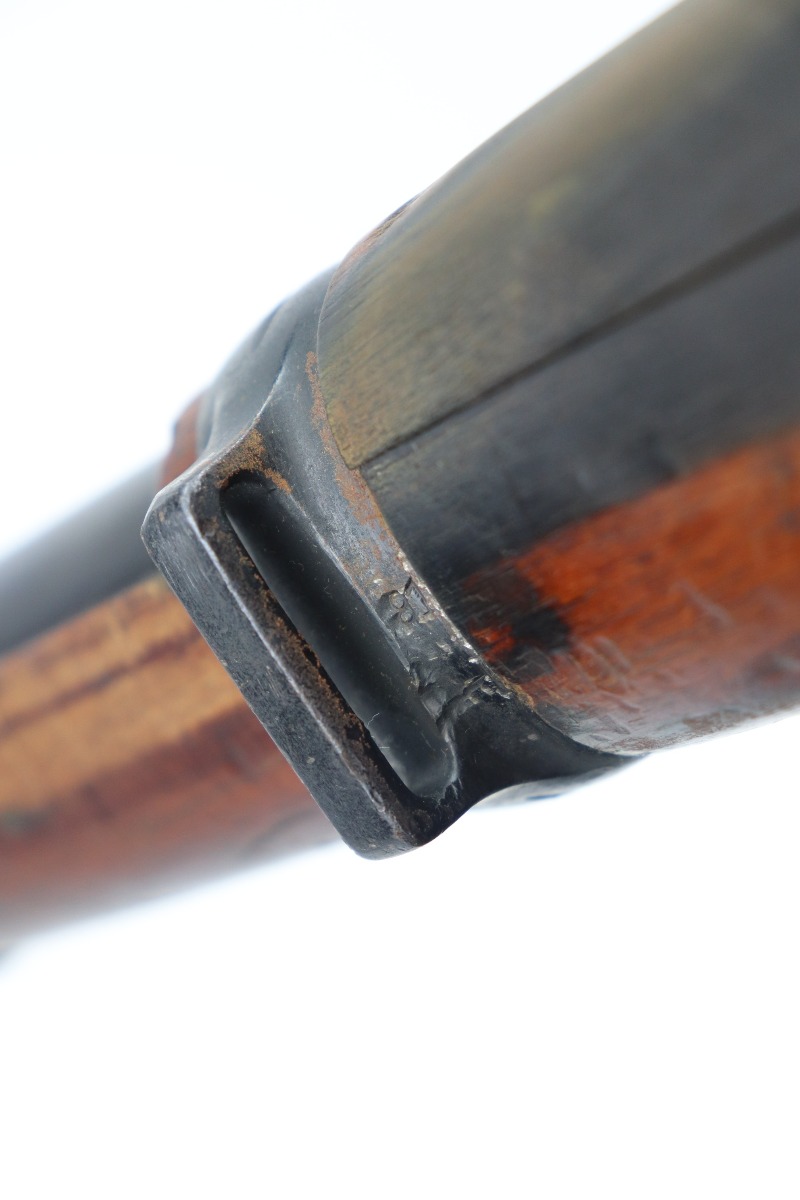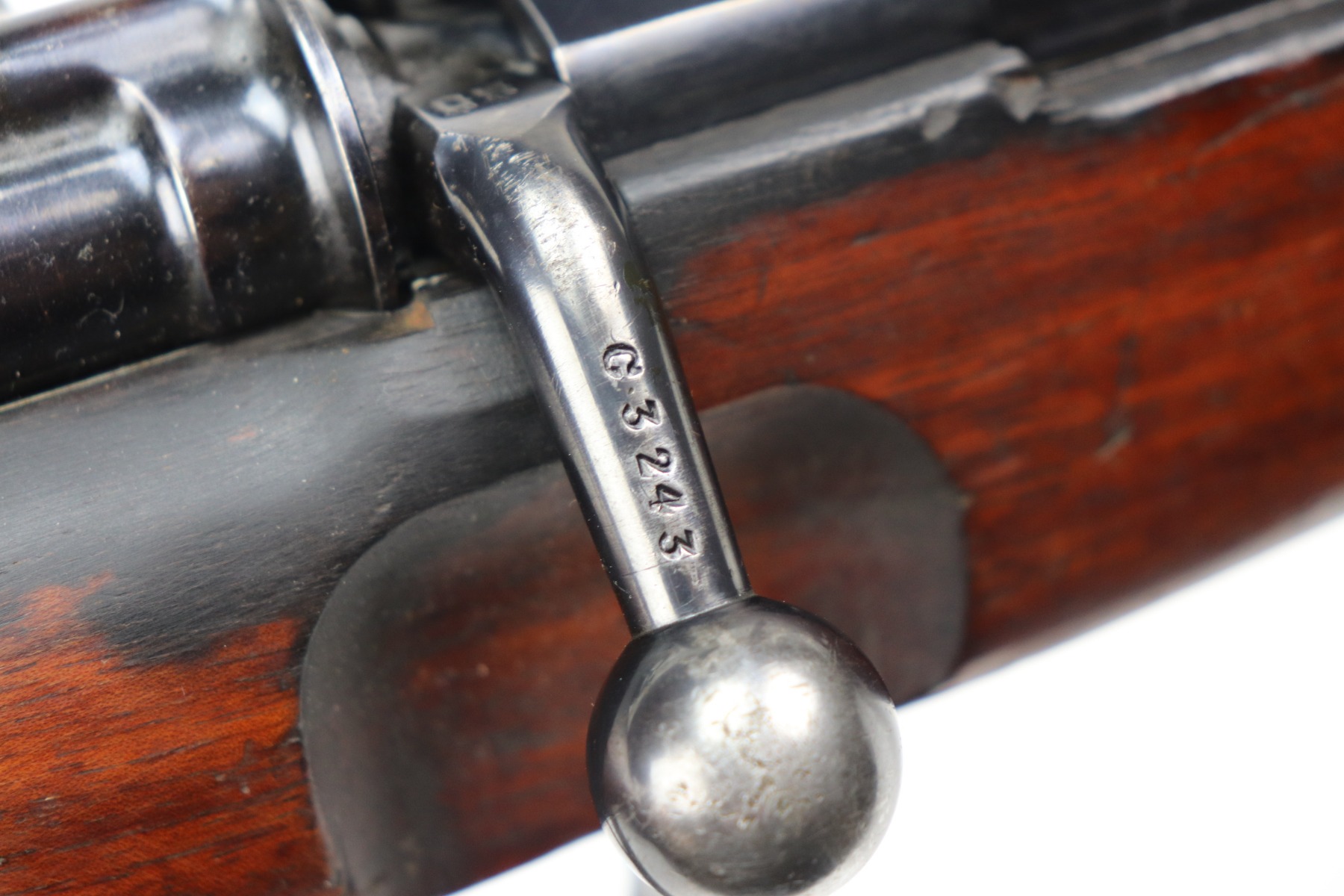 2/12/21 – This is a very nice example of a Mauser Standard Modell Rifle, made in 1934. The gun is all matching except for the rear barrel band. It has the proper “BUG” proofs. It has retained most of its original finish with minor wear on the high edges and spotty oxidation here and there. Spotty rust on the butt plate. Thinning and scratches on the floor plate. The stock is excellent with minor handling marks throughout and a streak of dark discoloration along the top of the stock. Minty bore.