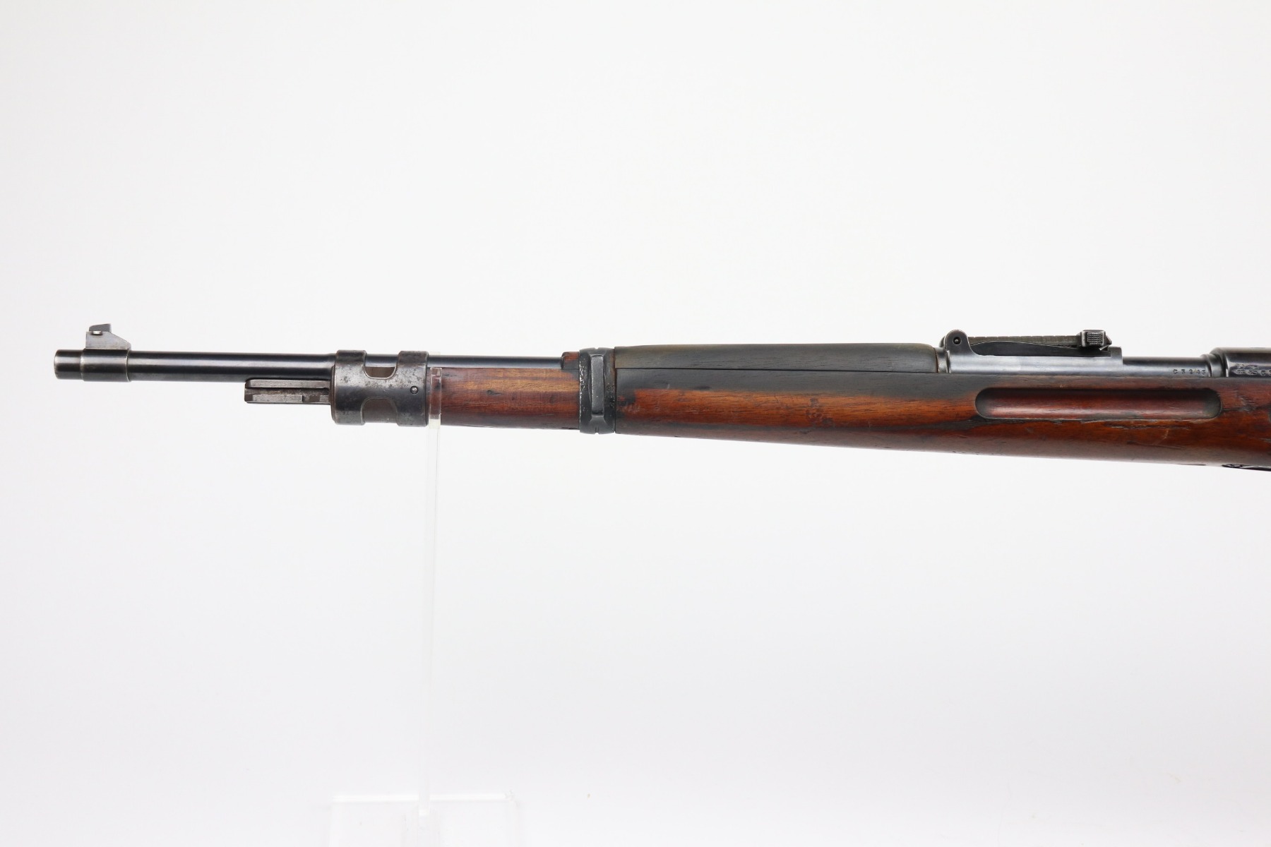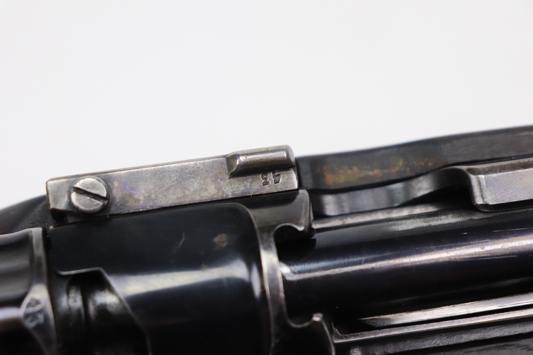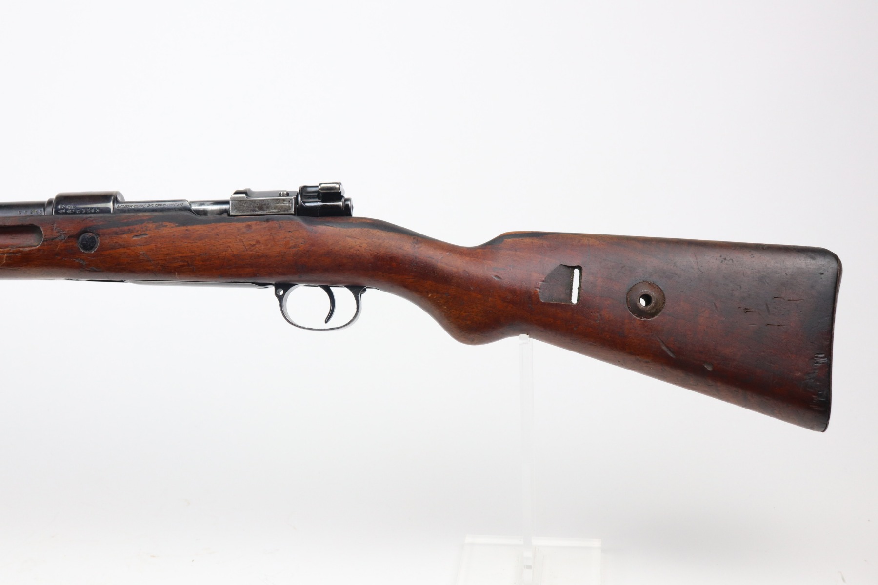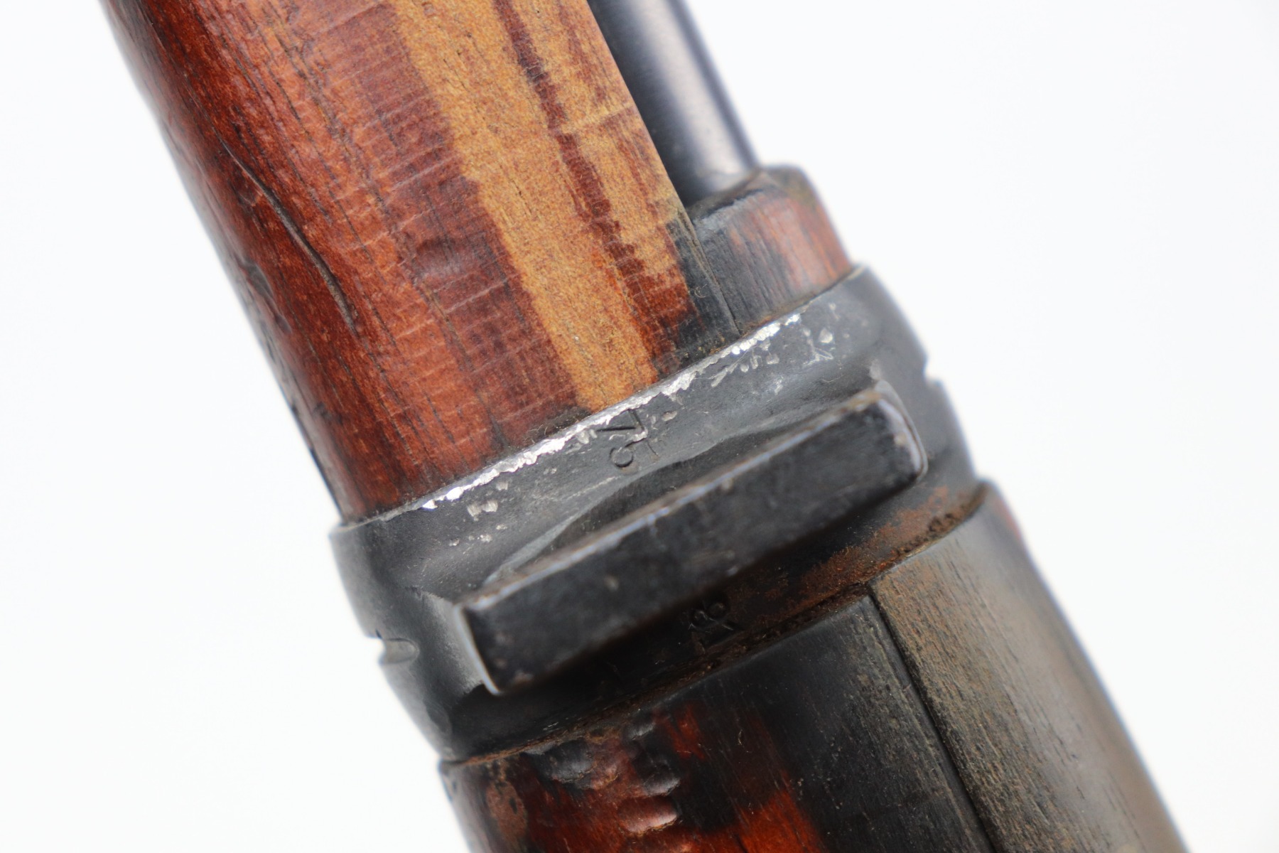 2/12/21 – This is a very nice example of a Mauser Standard Modell Rifle, made in 1934. The gun is all matching except for the rear barrel band. It has the proper “BUG” proofs. It has retained most of its original finish with minor wear on the high edges and spotty oxidation here and there. Spotty rust on the butt plate. Thinning and scratches on the floor plate. The stock is excellent with minor handling marks throughout and a streak of dark discoloration along the top of the stock. Minty bore.