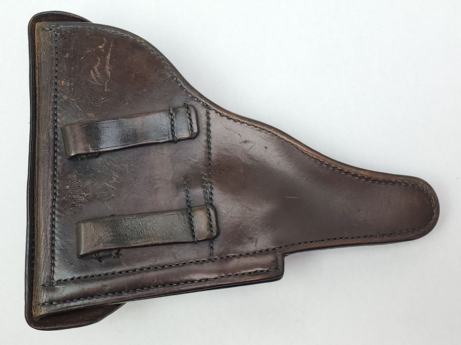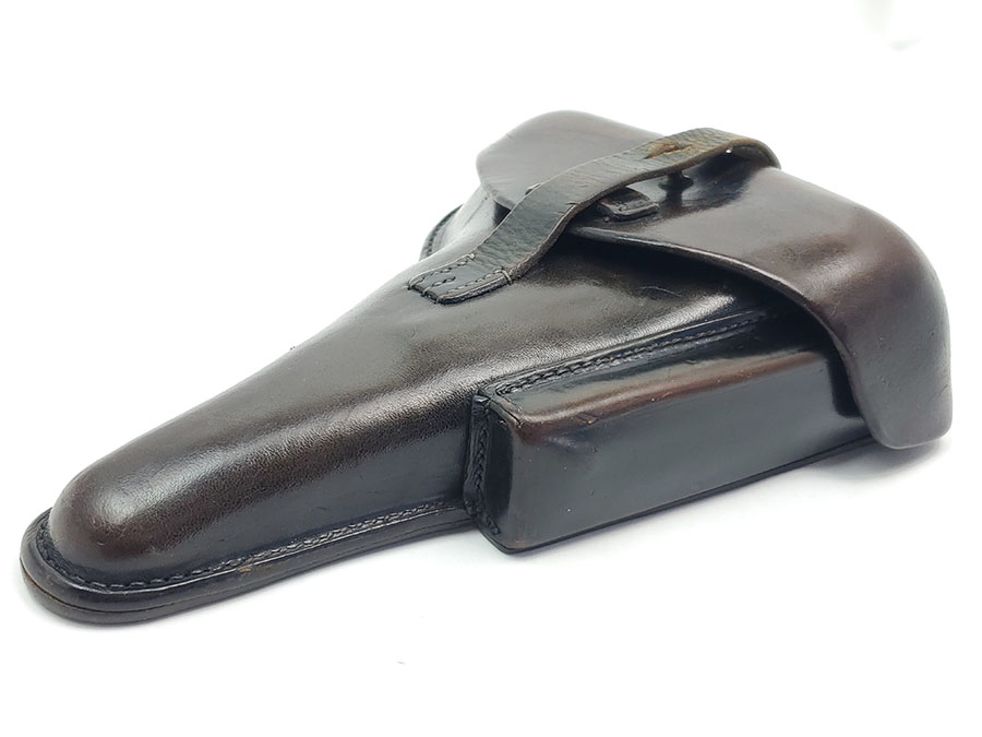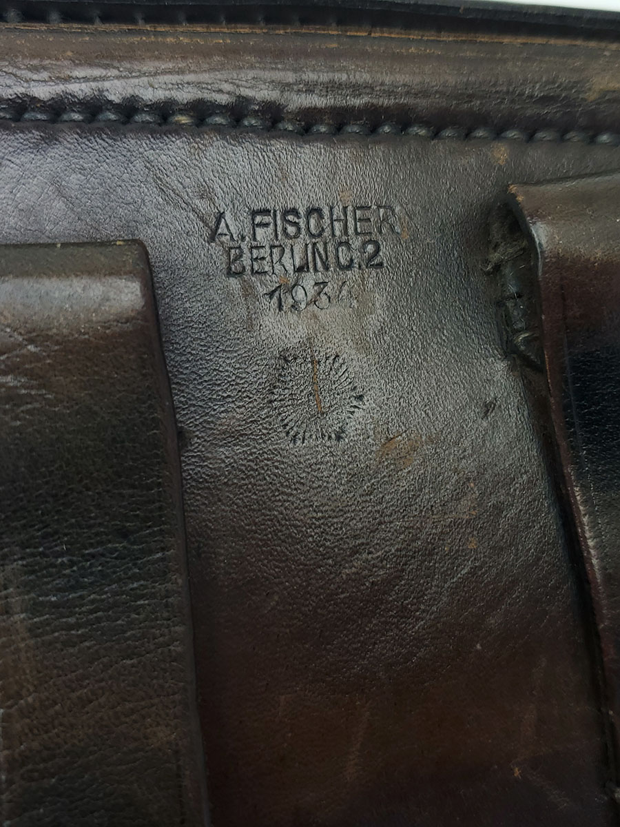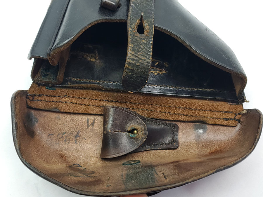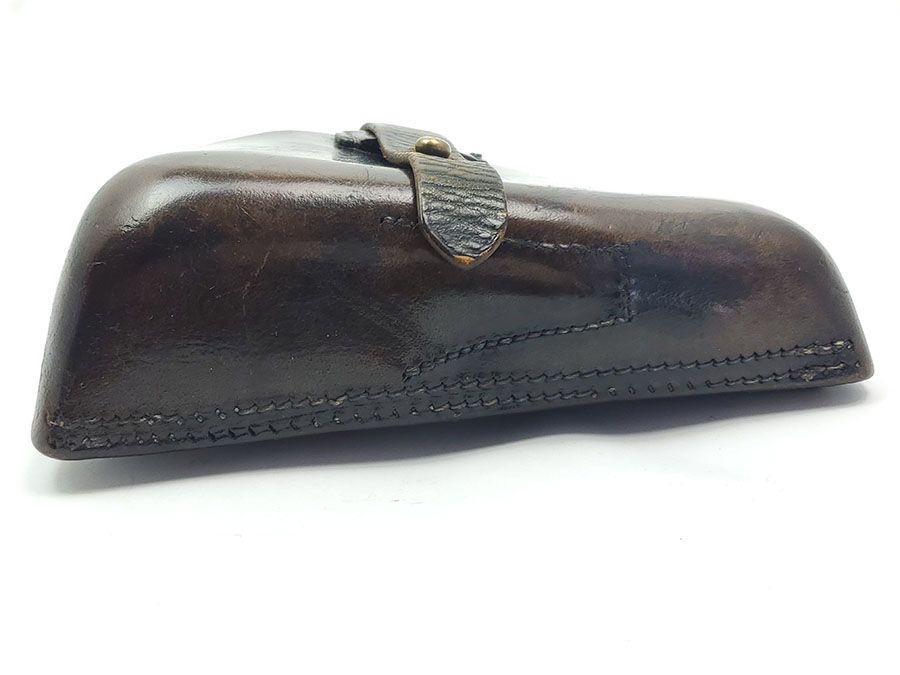 6/26/20 – This is an original 1934 dated police Luger holster. Made just as WW2 was heating up, this holster made it through the war and is still in great condition. The leather has nice shape and normal pliability. The closure strap has some light surface wear / wrinkling on the leather but is not cracked or damaged. The stitching is all original and in tact. Stamped on the back leather with a sunkist star, maker stamp, and date.