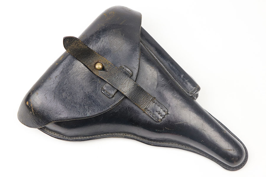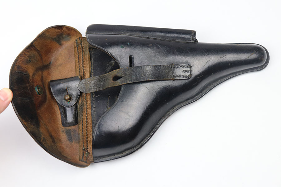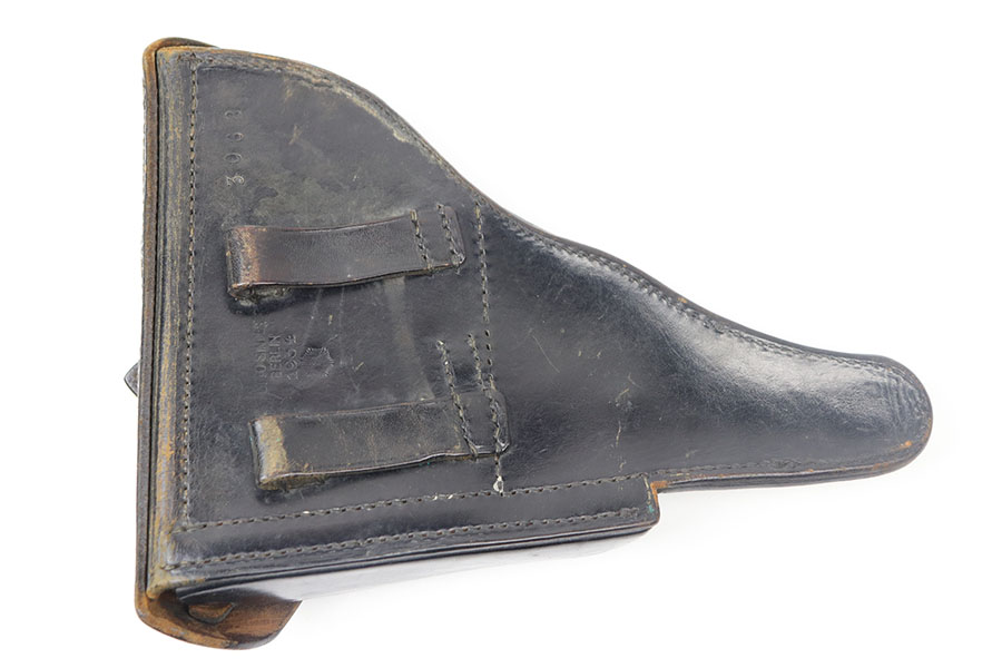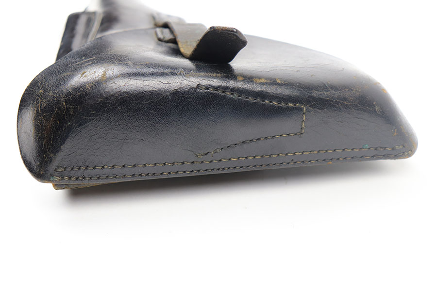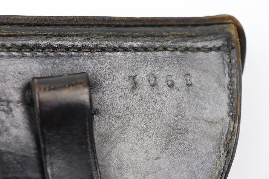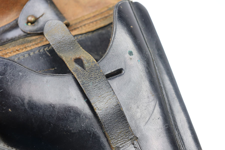 6/16/21 – This is an original 1934 dated police luger holster. The holster is in great overall condition despite missing the lift strap. Price reduced accordingly. The back leather is maker stamped, dated, and proof stamped with a Sunkist star. There is also a unit number stamped onto the back leather. No major issues in the leather or stitching.