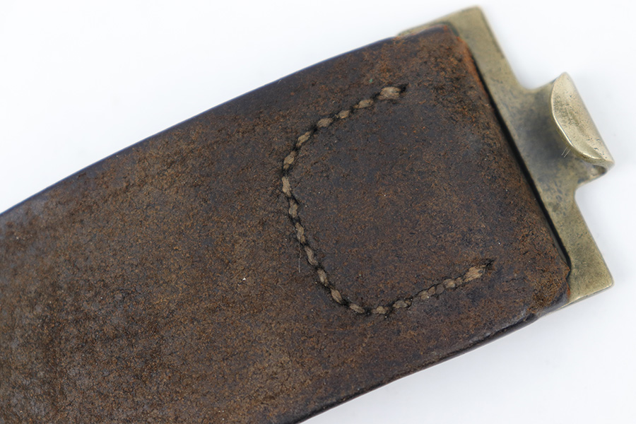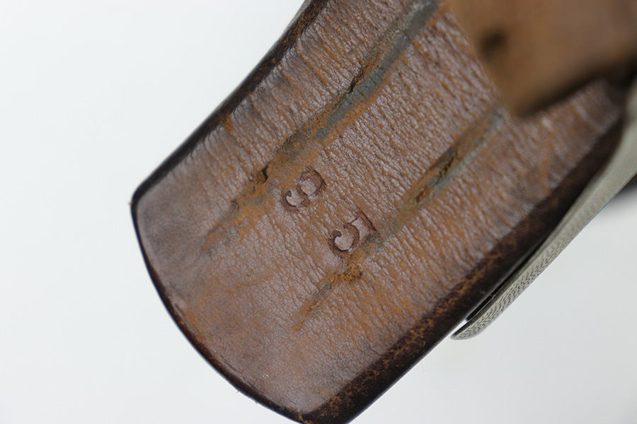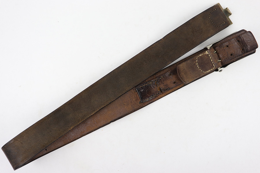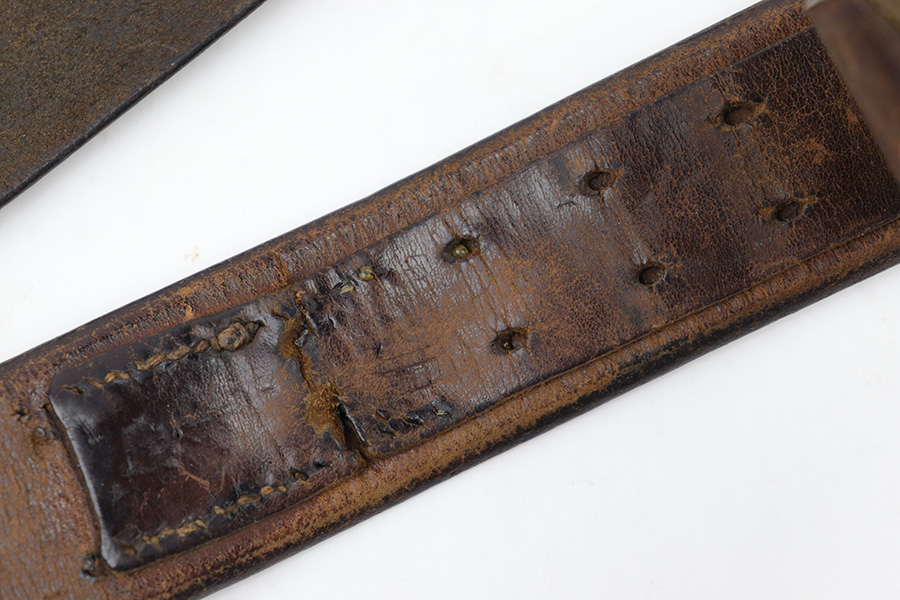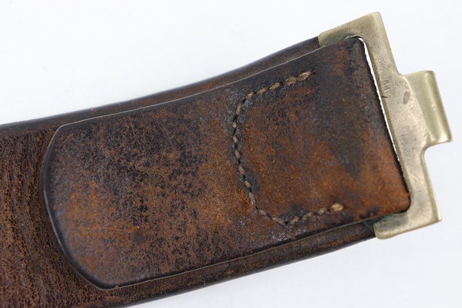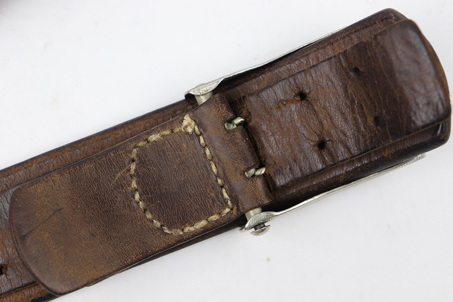 4/19/23 – This is an original, late Weimar era / pre WW2 German belt & buckle. The aluminum buckle is in great condition with typical surface patina but some of the original finish still visible within the grooves of the buckle exterior. Unmarked interior. The leather buckle tab has a faint maker stamp with a visible 1934 date. The leather belt has a maker stamp at the hooked attachment end where only a 1935 date is visible. The leather shows honest surface wear and aging throughout, but no major issues. The size adjustment strap on the belt has some cracking and stitching loss, but is still attached. Great overall condition.