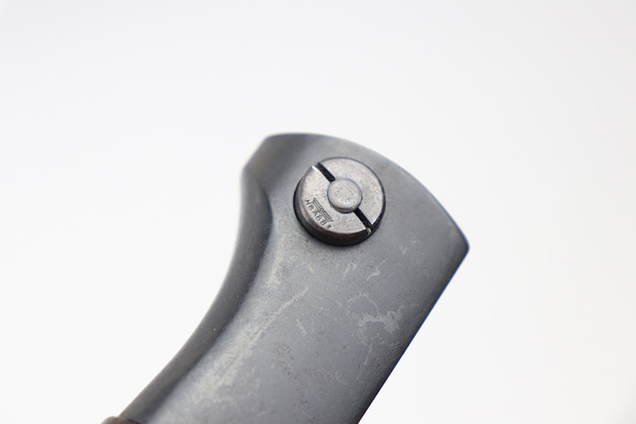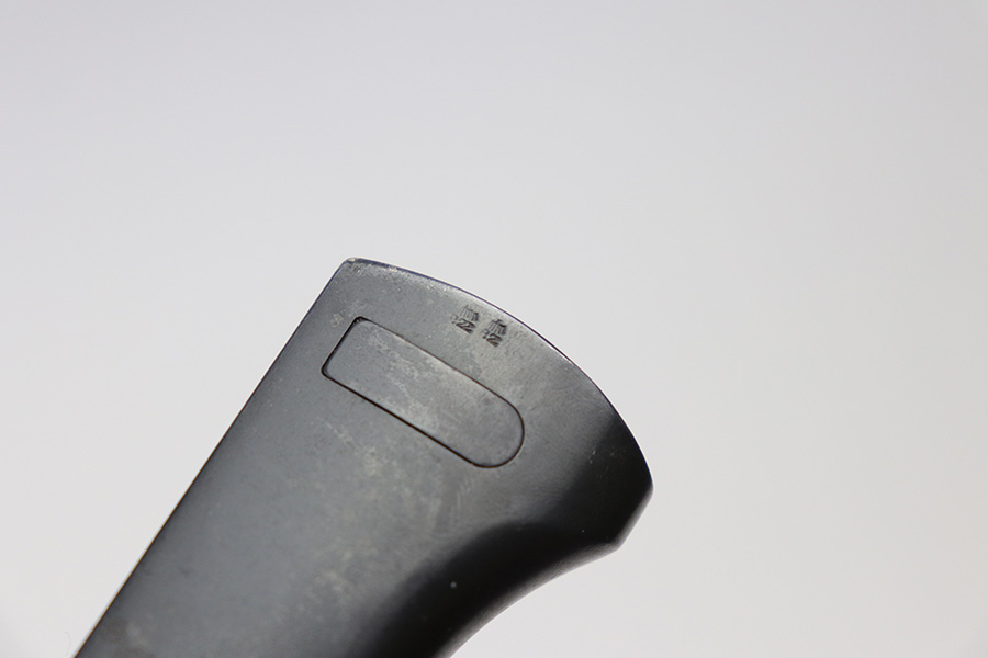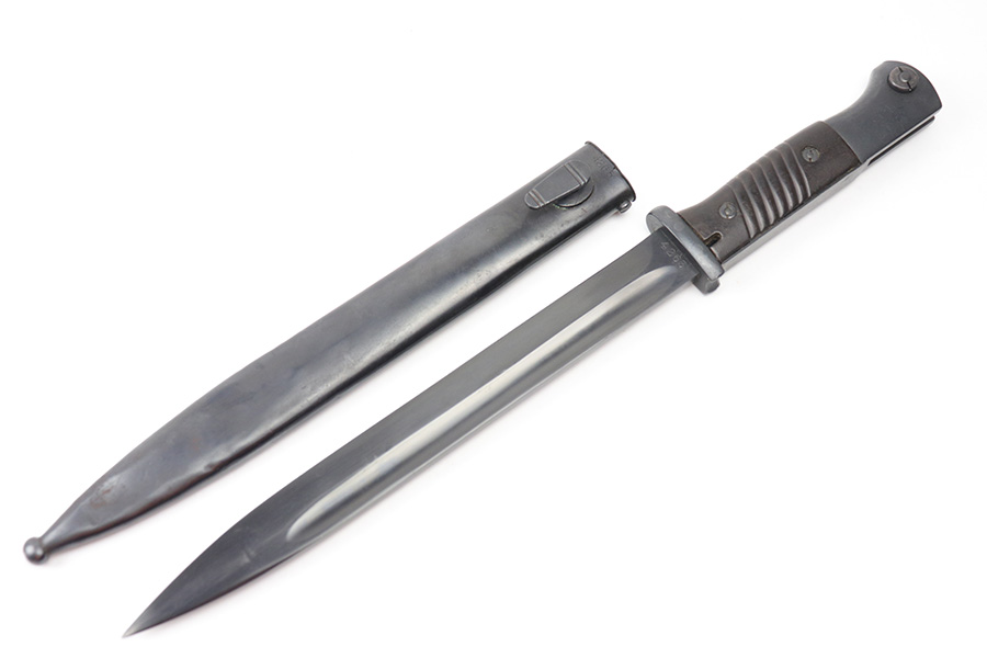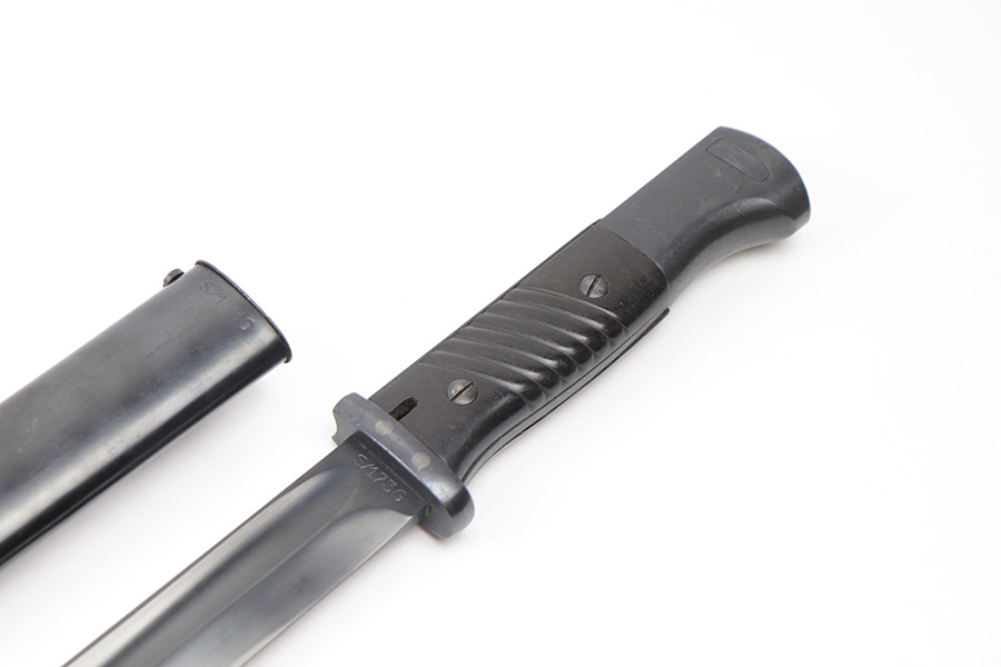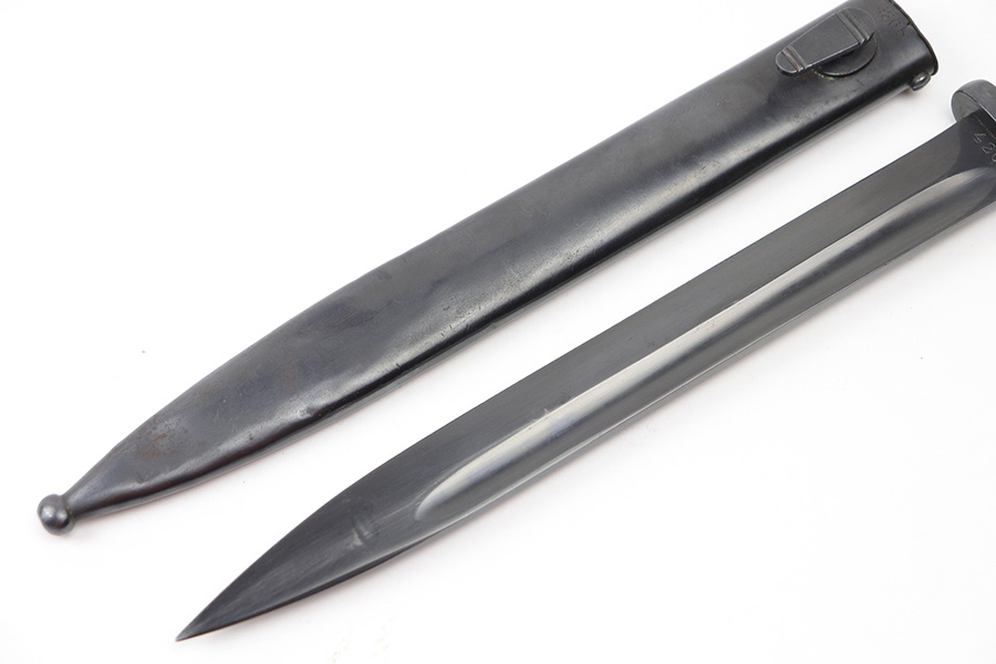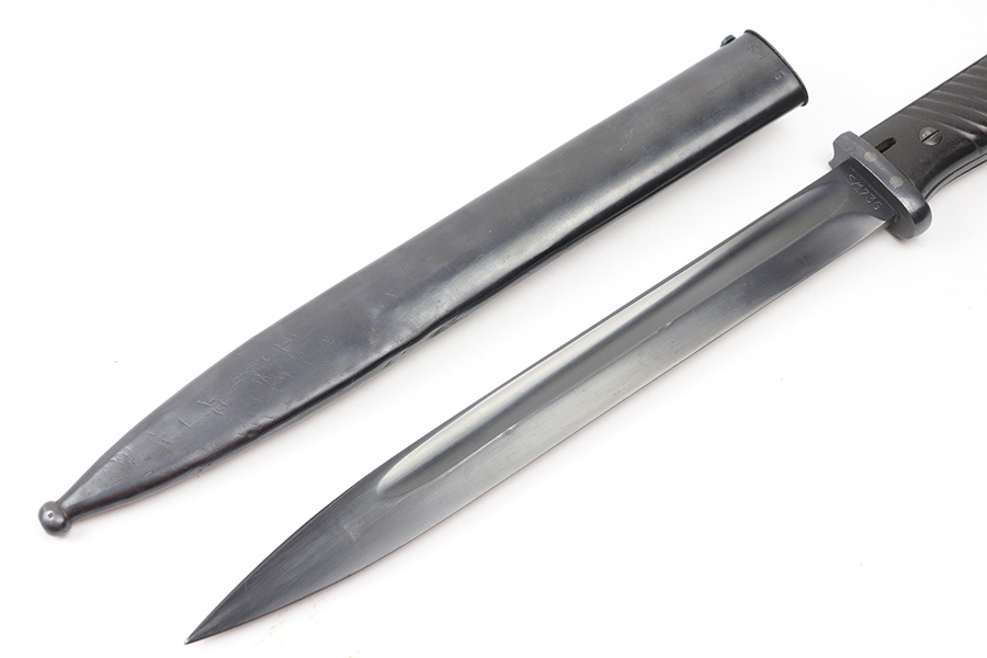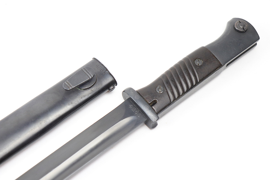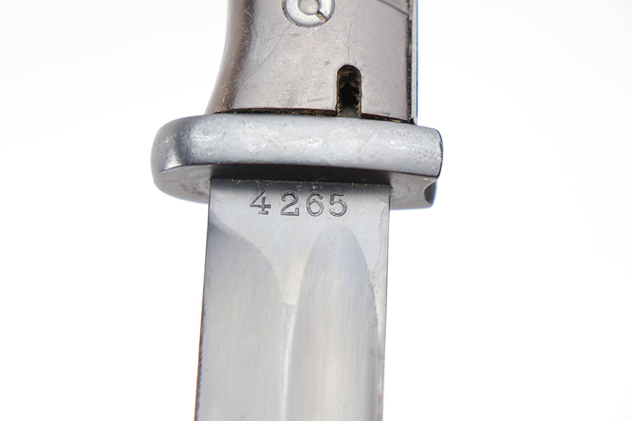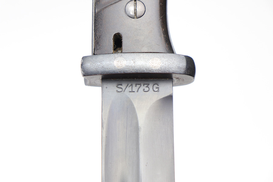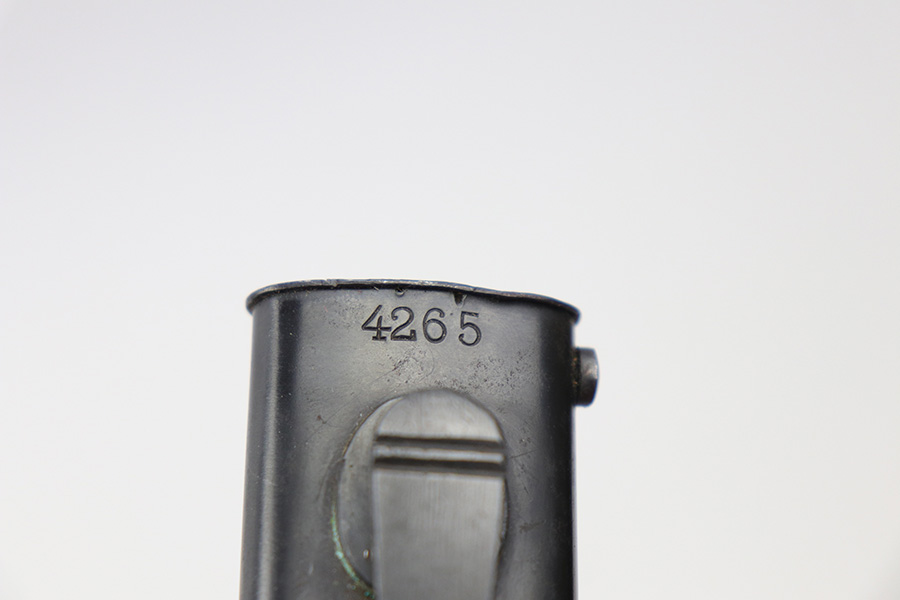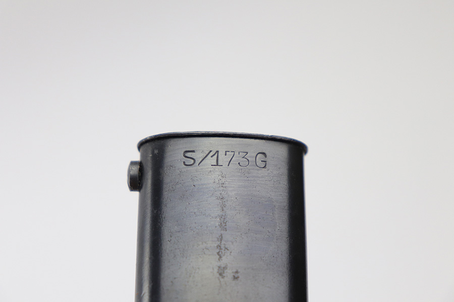 10/25/21 – This is a matching K98 bayonet and scabbard from early / pre WW2. The bayonet is S/173 G maker stamped, and serial numbered on the reverse. The maker is fairly scarce and desirable because it’s a G Date manufacture. The blade, unfortunately is refinished based on what we can tell. The finish is dark and there is some wear near the blade edge that appears blued over. The scabbard is matching serial numbered to the blade, but also looks like a dark refinish and has some mild surface dents and dings but no major issues. Price reduced accordingly.